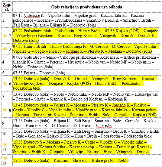 V spodnji tabeli so vozne linije, ki prehajajo iz šolskih na državne linije, obarvane rumeno. Učenci za te linije potrebujejo nove vozovnice DUJPP.