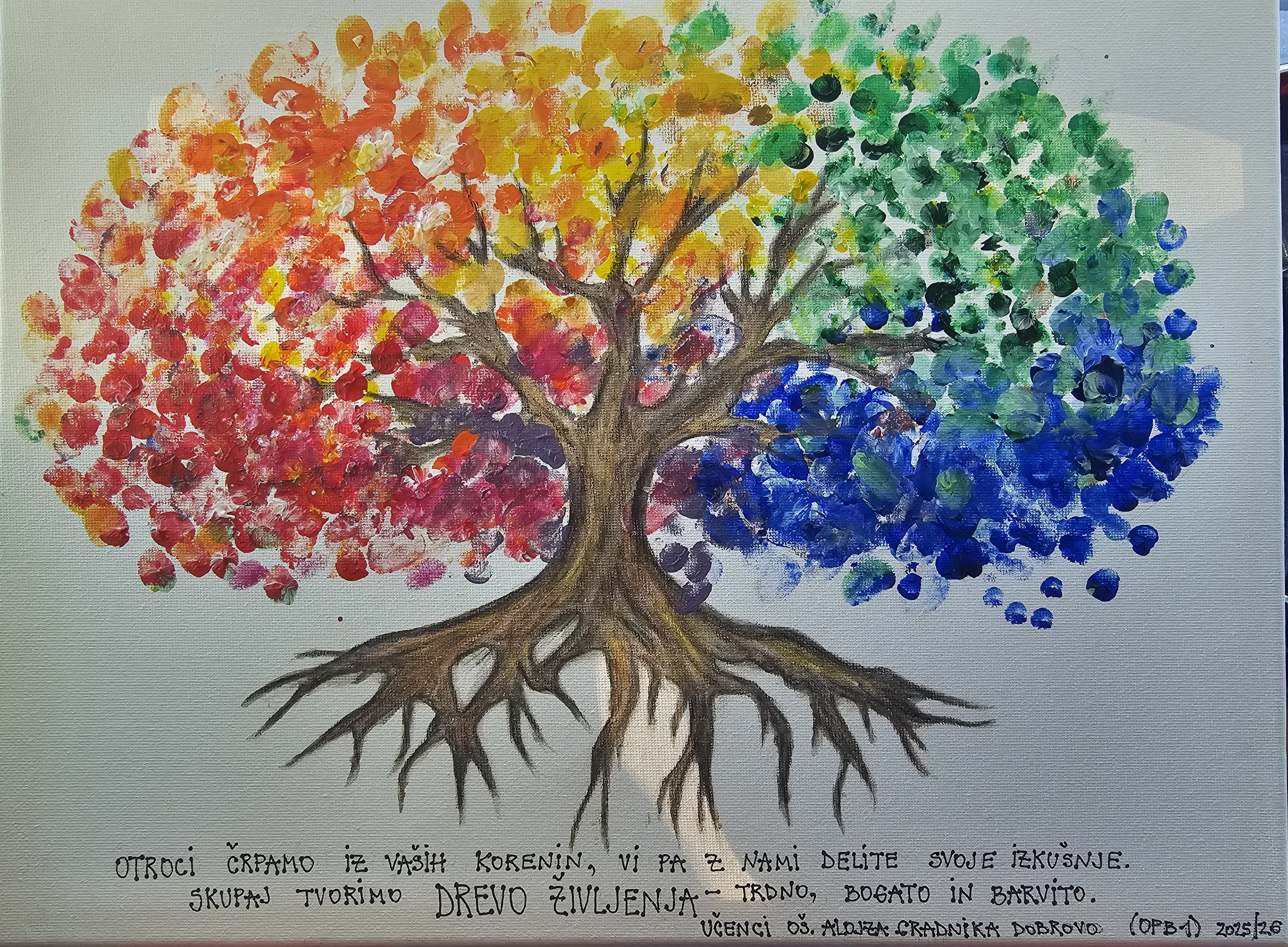Učenci v OPB 1 smo ob mednarodnem dnevu starejših naslikali drevo življenja, ki smo ga z veseljem podarili stanovalcem Doma starejših občanov v Podsabotinu. Z otroki smo ustvarili pisanost listja – simbol veselja, radovednosti in mladosti. Starejši pa s svojimi koreninami, izkušnjami in modrostjo dajejo drevesu trdnost in globino. Prosili smo jih, naj nam zapišejo popotnico za življenje – drobno seme modrosti za prihodnje dni.