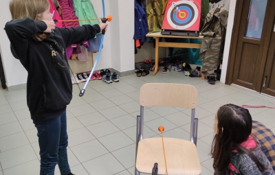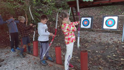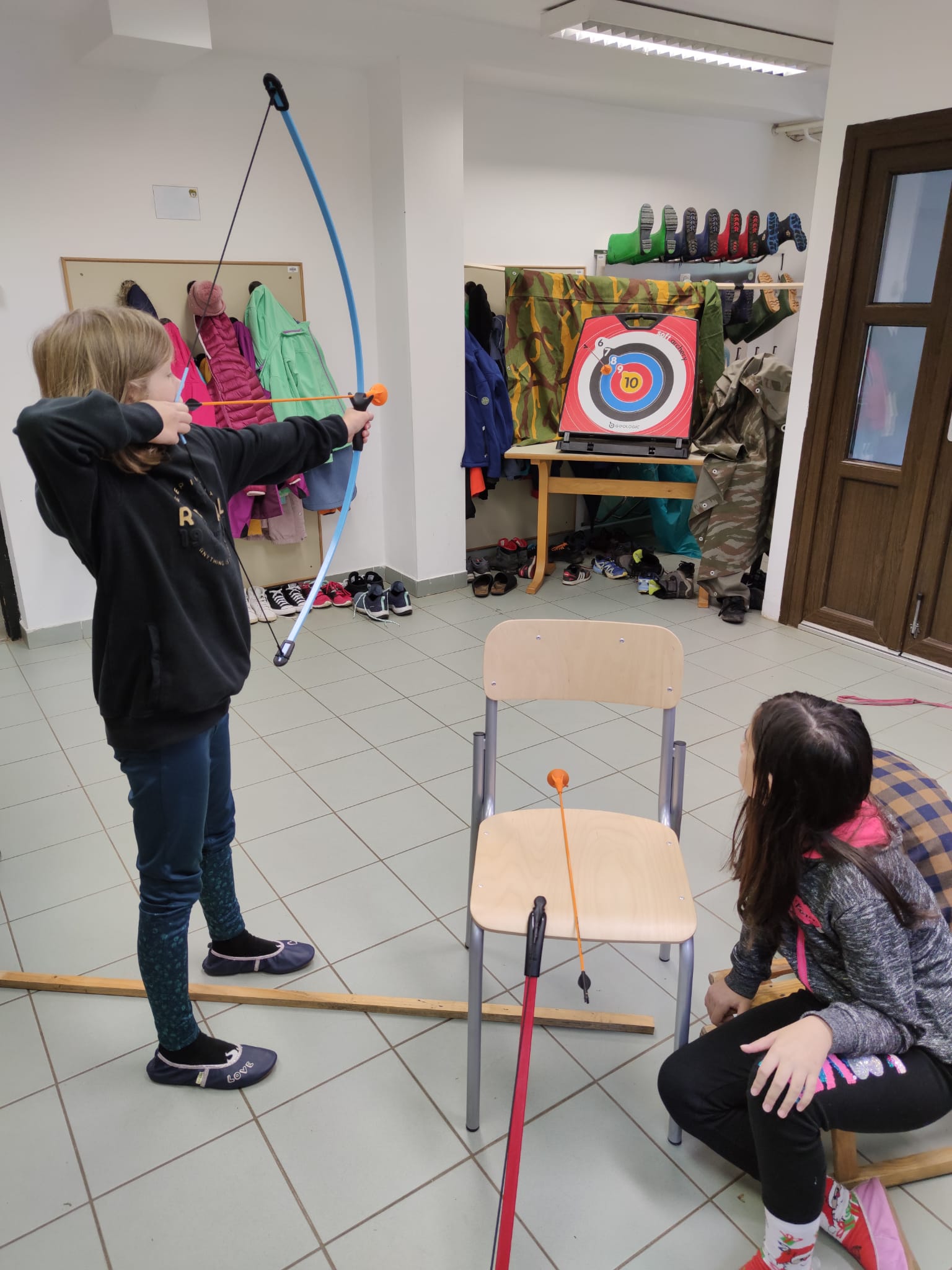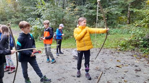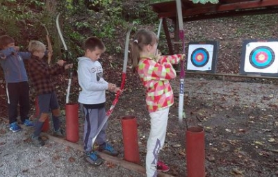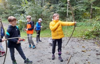 2. DAN: Tudi v torek so za nas učitelji pripravili veliko zanimivih dejavnosti. Učiteljica nas je z zanimivimi zgodbami spodbudila k raziskovanju. Ugotavljali smo, katere sledi puščajo posamezne gozdne živali za seboj. Spoznavali smo, kako so drevesa povezana z ljudskim izročilom. V gozdu smo v parih izdelovali loke. S pravimi loki pa smo popoldne pridno zadevali tarče. Na igralih smo preizkušali naše ravnotežje. V utki, skriti pred dežjem, smo preizkušali naše pevske sposobnosti. Nekateri smo ustvarjali z lego kockami, igrali igro štrbunk in pisali razglednice. Ni nam dolgčas!