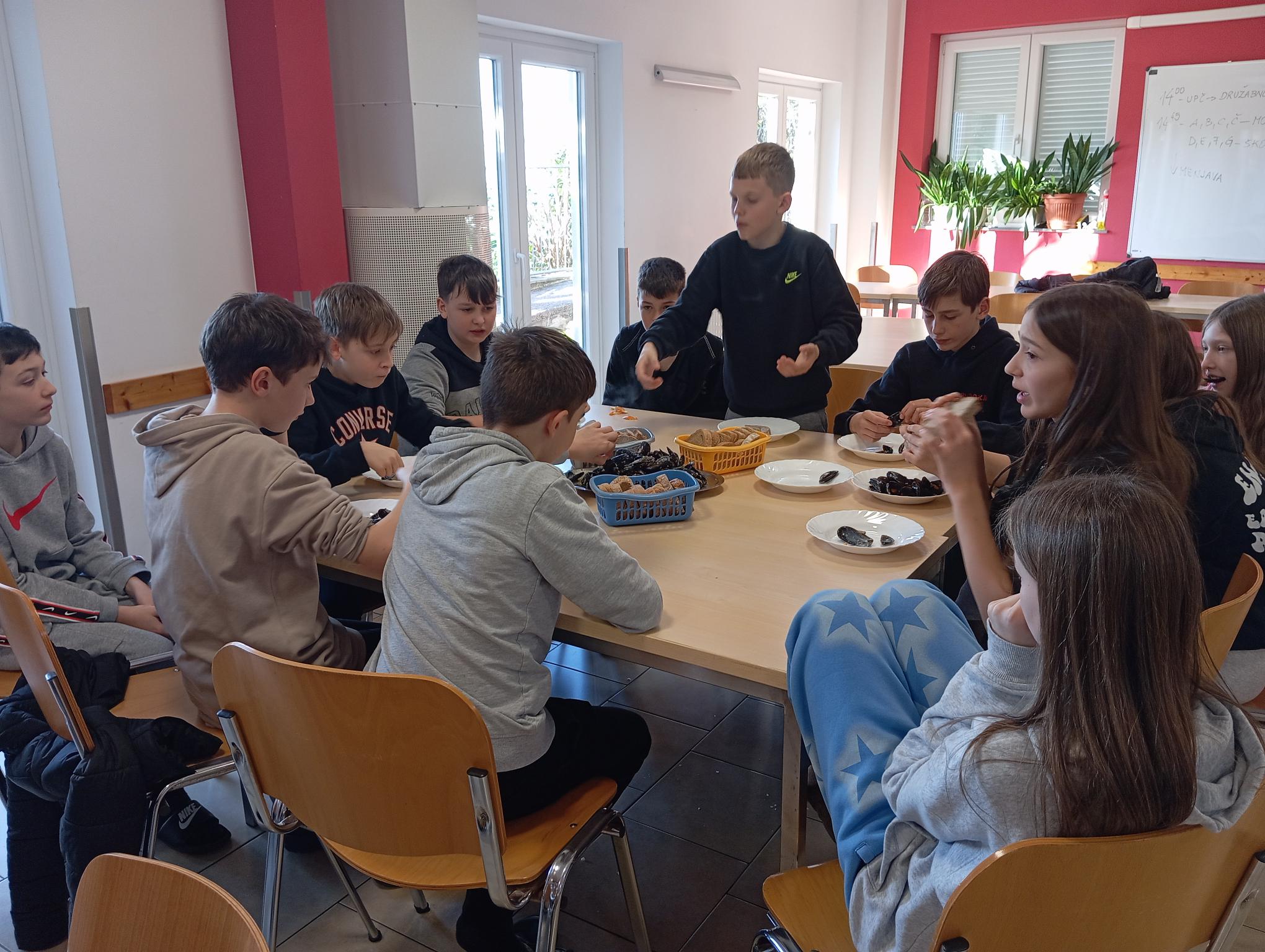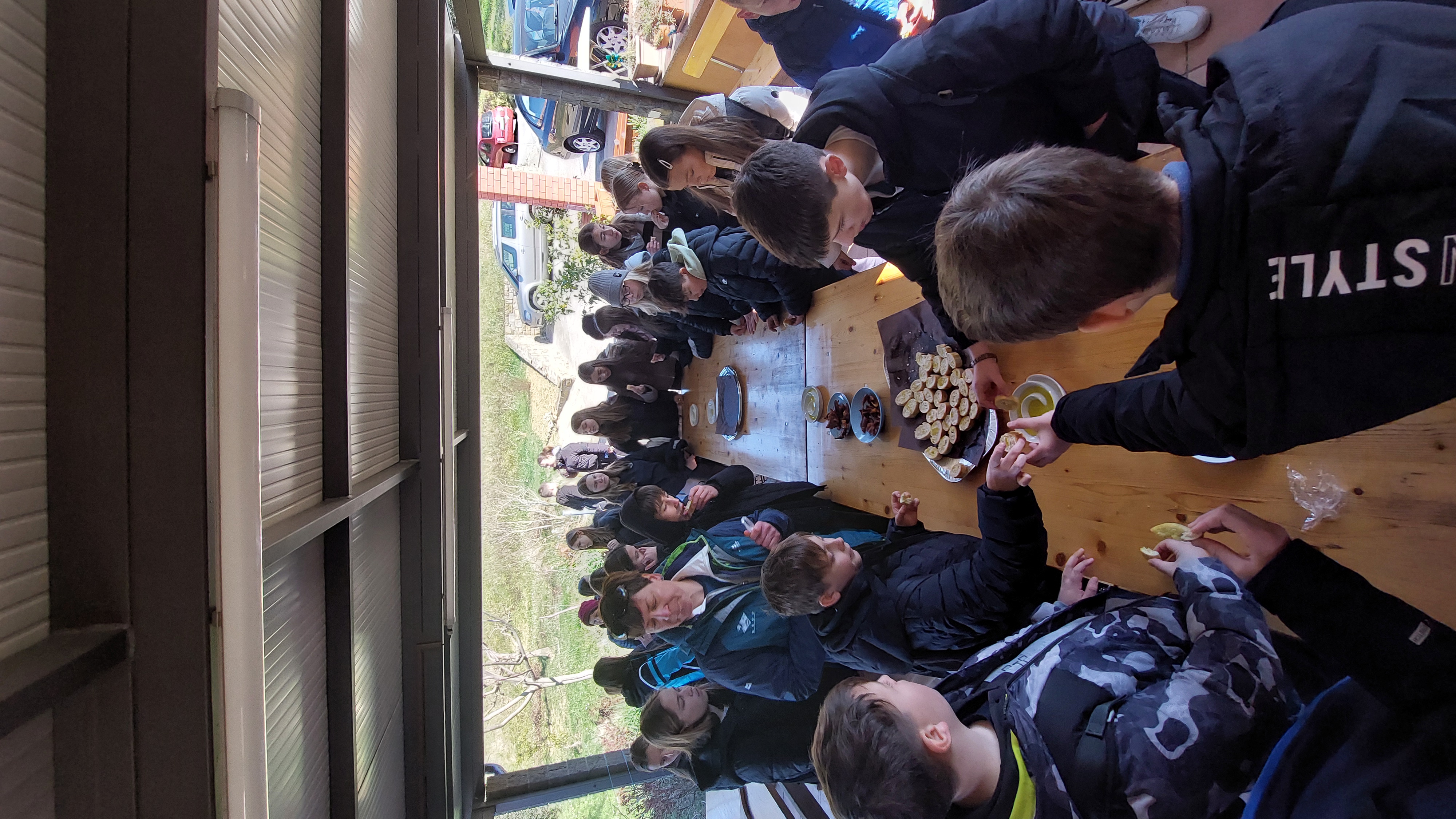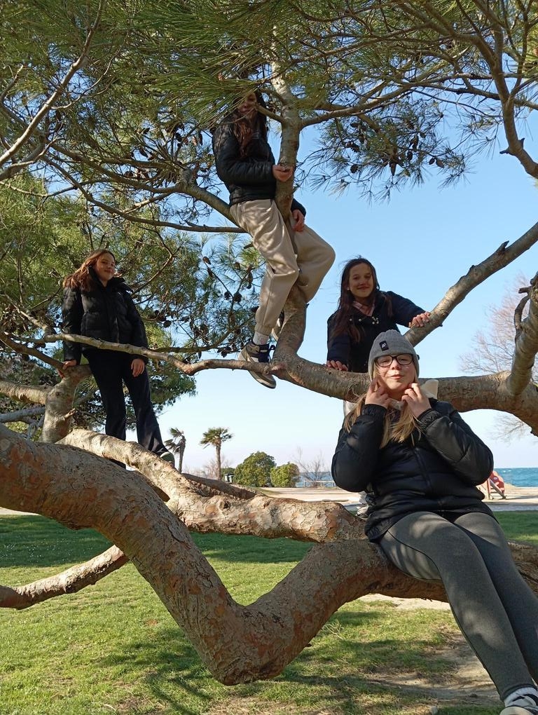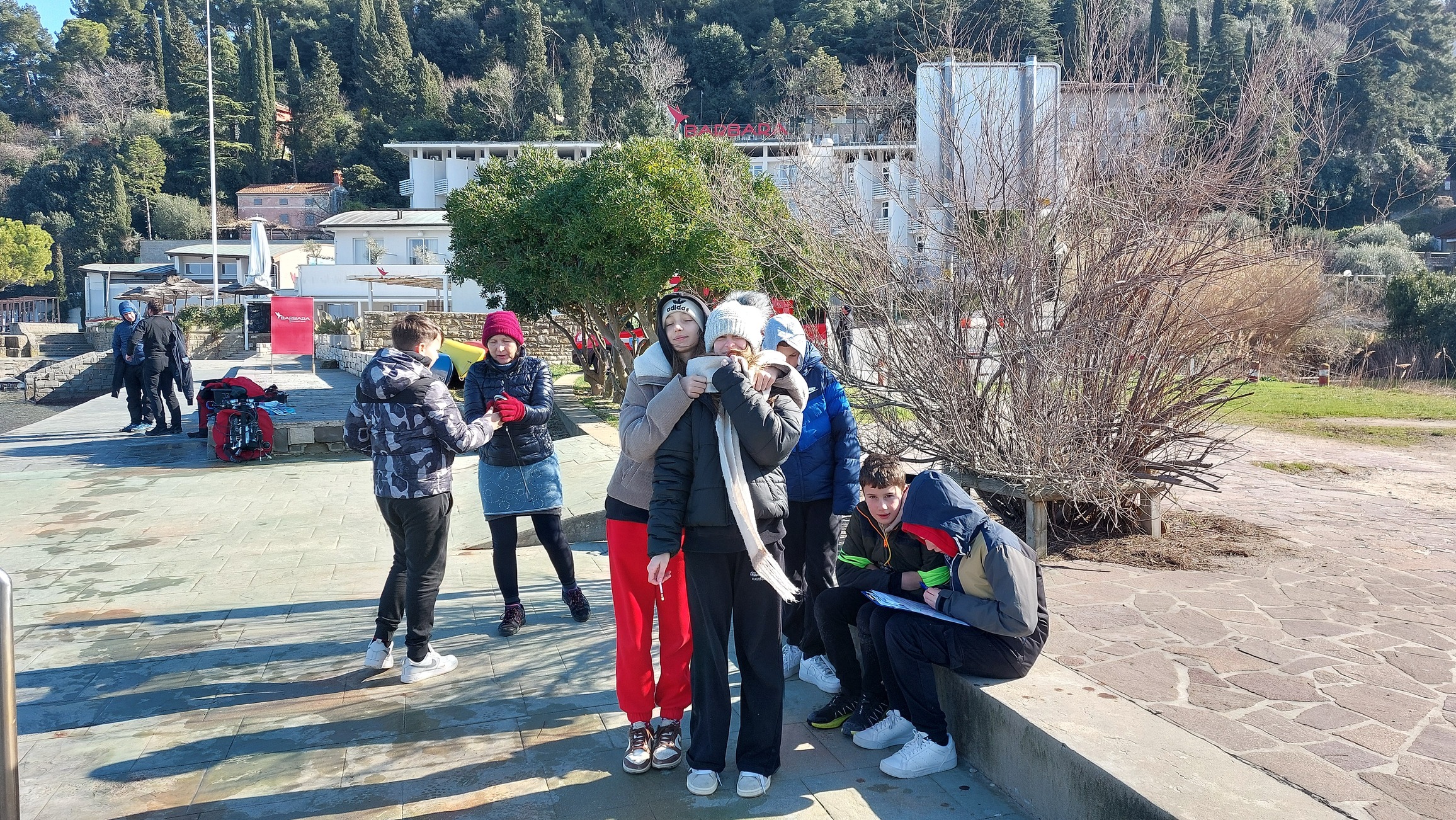 Danes smo se po zajtrku odpravili na res dolg pohod do Strunjana. Ogledali smo si turistično kmetijo, kjer smo imeli možnost videti kako gojijo artičoke, njihova glavna dejavnost pa je gojenje kakija. Ponudili so nam ga sušenega, poskusili pa smo tudi oljčno olje in res odličen sadni čaj. Od tam smo se povzpeli do razgledne točke Strunjanski križ, od koder smo uzrli Mesečev zaliv, nad njim pa 80 metrov visok klif. Ko smo se vračali, smo videli tudi bazene Strunjanskih solin, ki jih bodo marca začeli pripravljati za novo sezono pobiranja soli. V popoldanskem delu smo še malo raziskovali morje. Spoznali pa smo tudi gojenje školjk klapavic in jih tudi pripravili na buzaro. Po večerji pa nas čaka plesni večer.