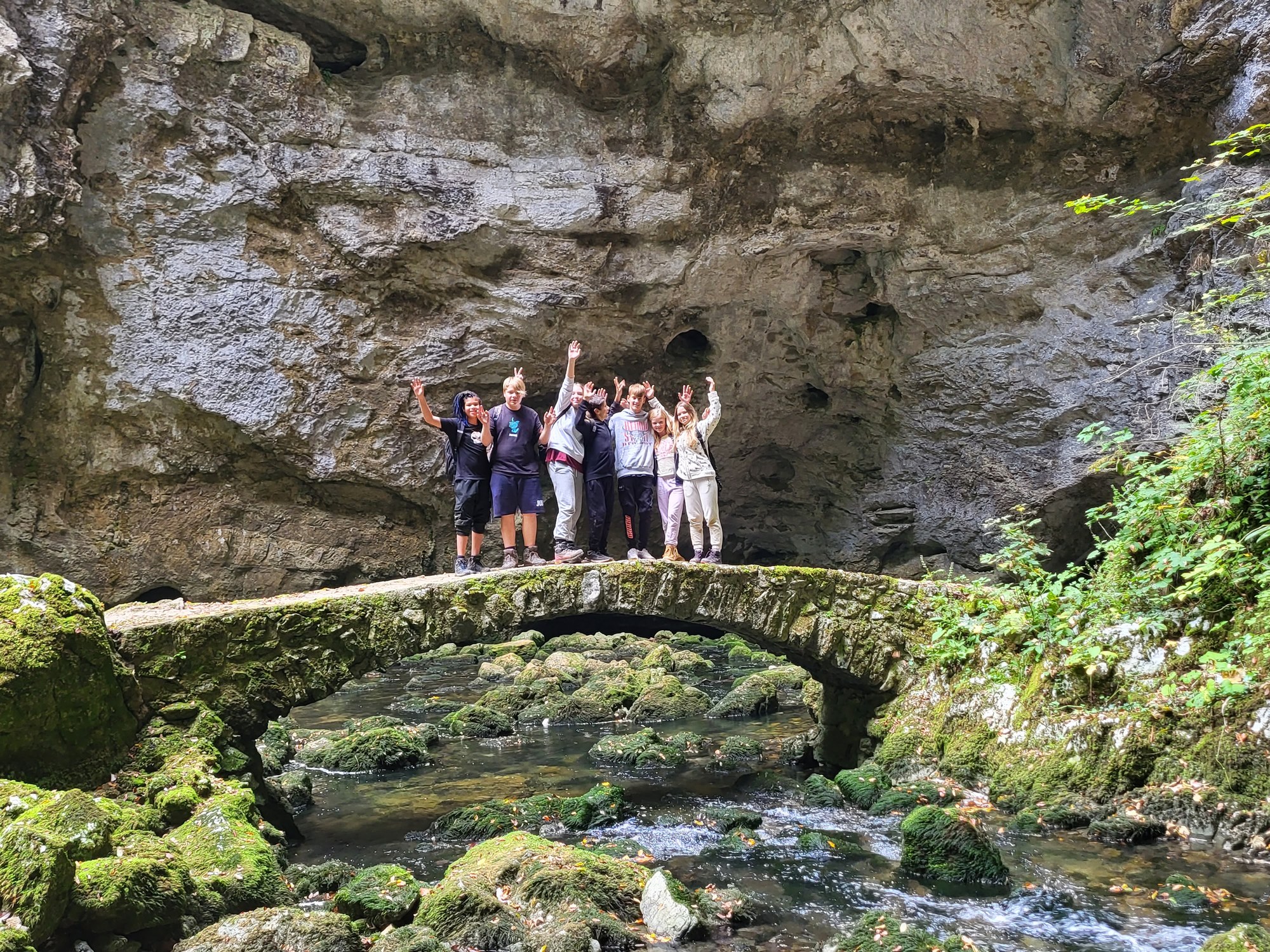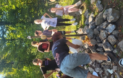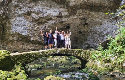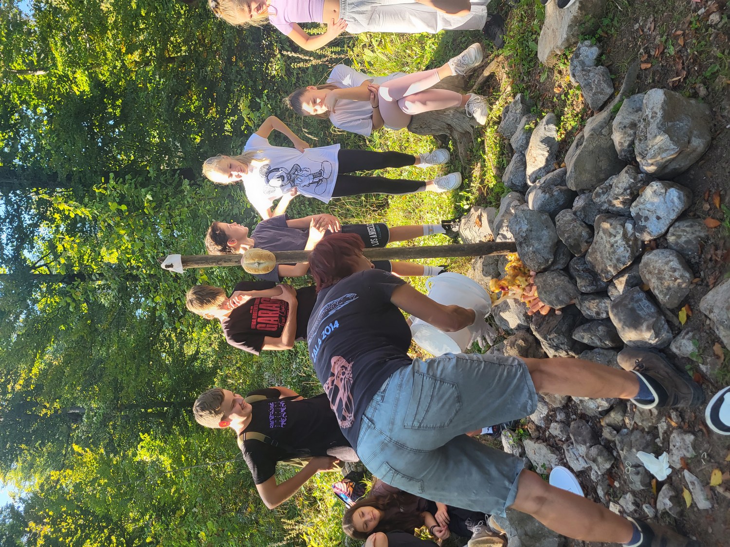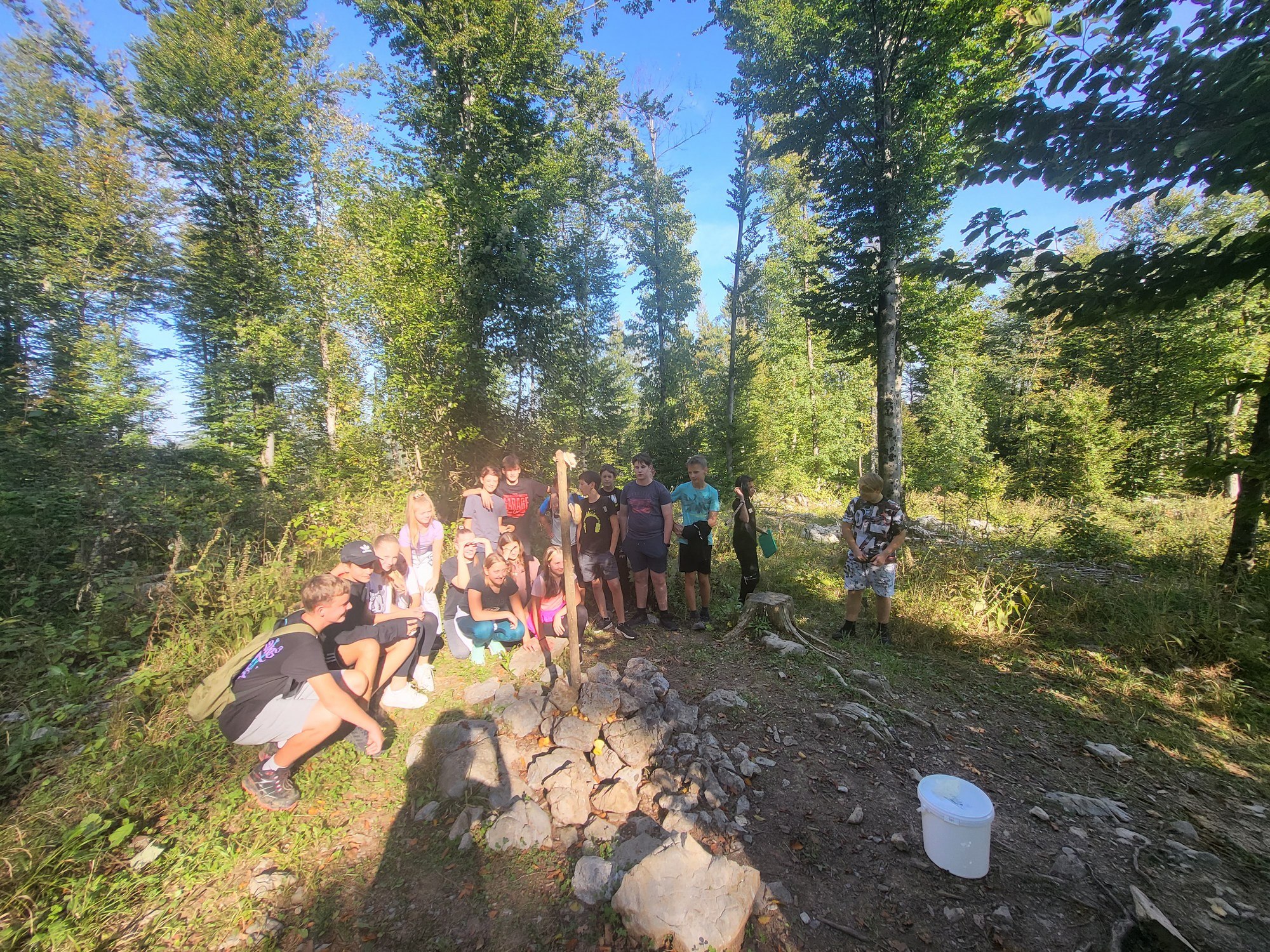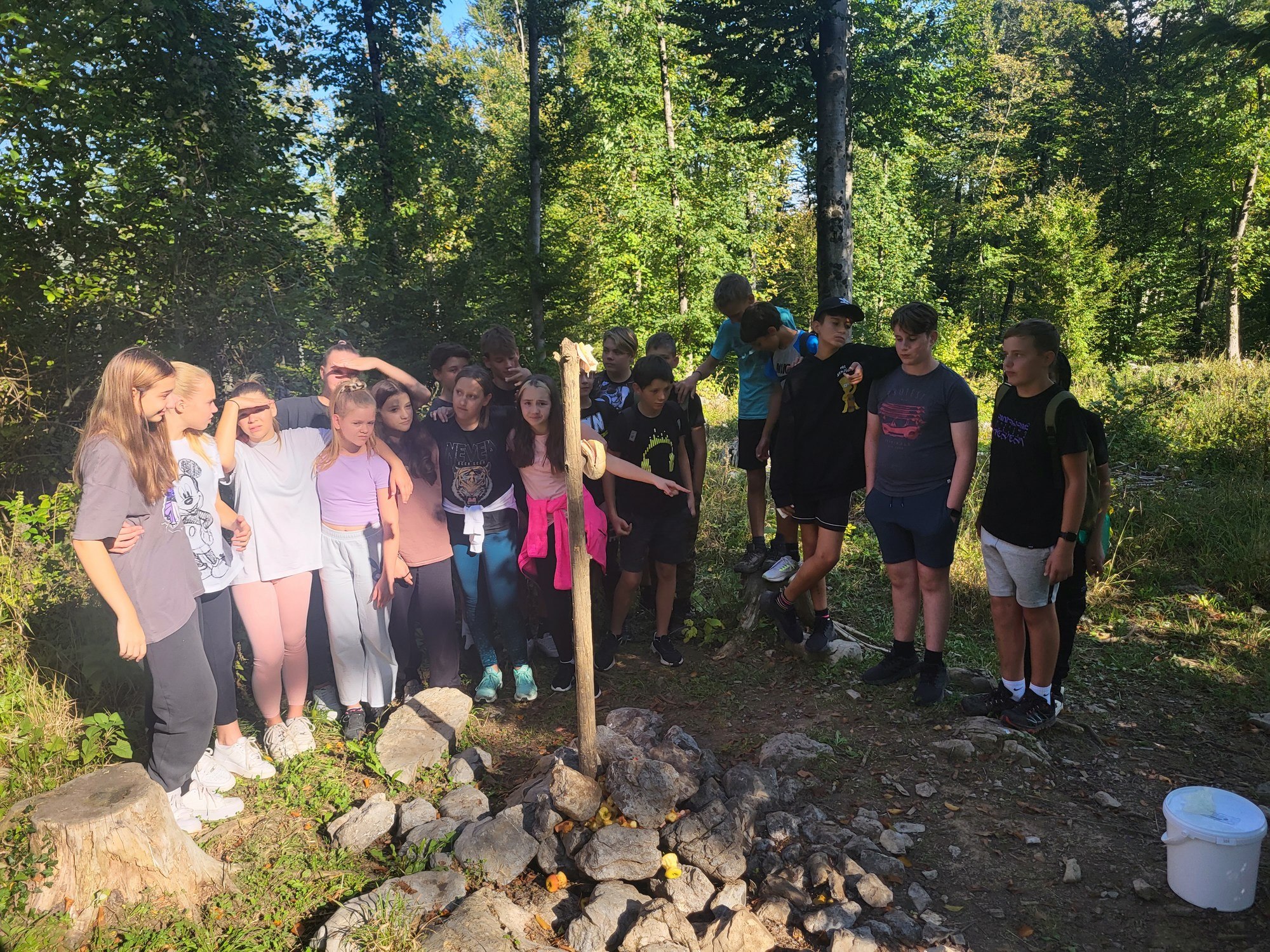 Prvi dan nam je postregel s čudovitim vremenom, zato smo ga izkoristili za raziskovanje kraških pojavov v okolici doma. Sprehodili smo se po gozdu in občudovali naravni most, ki ga je oblikovala reka Rak. Po njeni trenutno suhi strugi smo vstopili v Tkalca jamo in tudi raziskovali okoliške rove. Pester dan smo zaključili s pantomimo pod zvezdami.