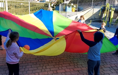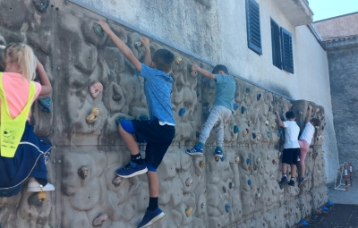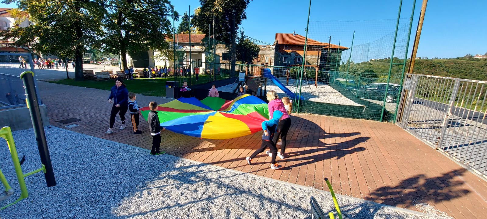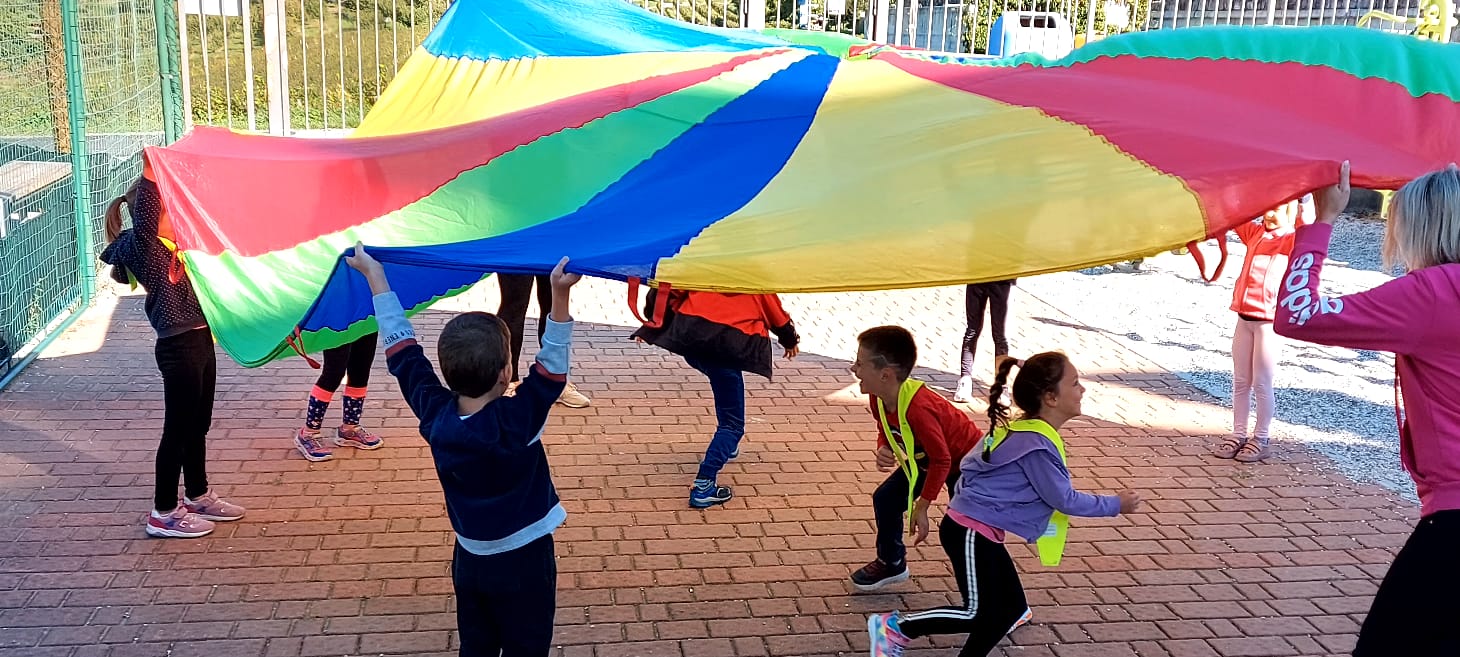 Učenci, ki smo v prvem delu športnega dne ostali v Riu, pa smo se preizkusili v različnih dejavnostih: med dvema ognjema, metanje ploščkov, poligon, padalo, plezanje in štafetne igre.