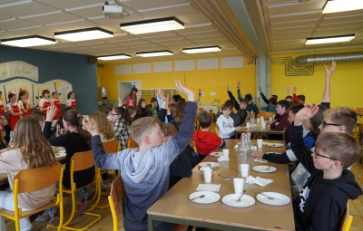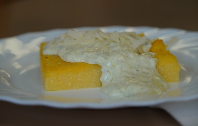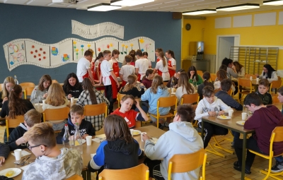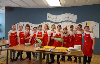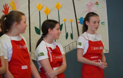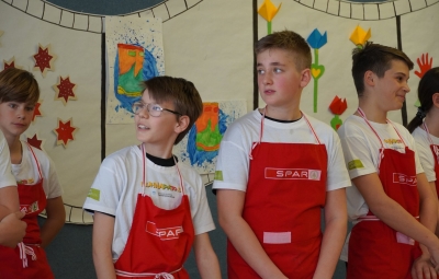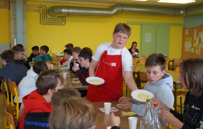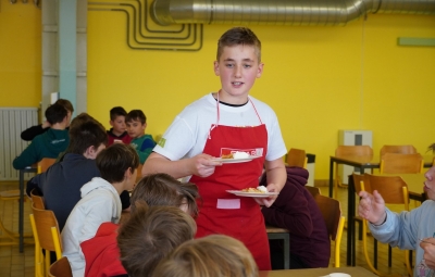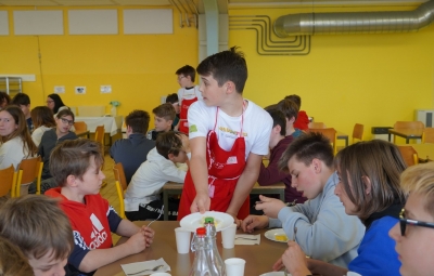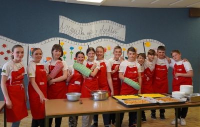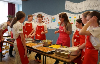 V sredo, 6. 4. 2022, so učenci 7. a razreda, ki obiskujejo izbirni predmet Sodobna priprava hrane, postregli svoje sošolce in učence iz 7. b. Pripravili so zapečeno polento in jo prelili s porovo omako (por so malo skrili in ga izboljšali s smetano in parmezanom). Kuharji so sošolcem predstavili tudi zgodovinsko ozadje jedi in značilnosti uporabe sestavin v Brdih.
