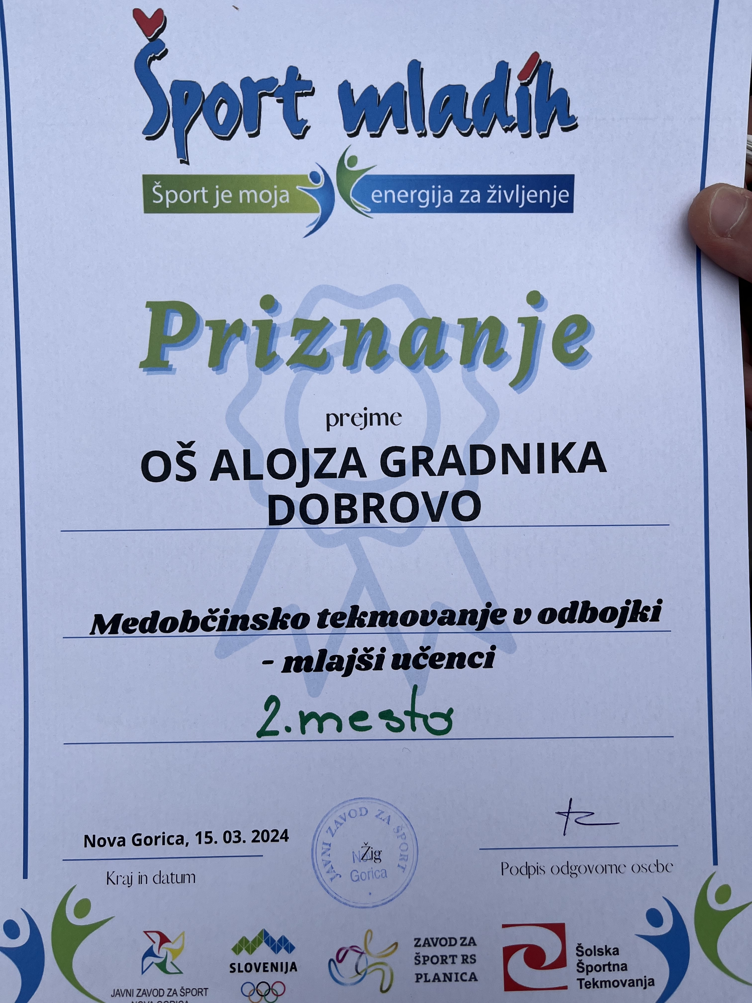 15. 3. 2024 smo se udeležili medobčinskega tekmovanja v odbojki za mlajše učence (7. razred), ki je potekalo na OŠ Milojke Štrukelj v Novi Gorici. Učenci so pokazali veliko borbenosti in ekipnega duha ter z dobro igro osvojili 2. mesto. Ekipa se je s tem rezultatom uvrstila tudi naprej na regijsko tekmovanje.
