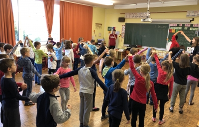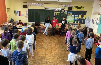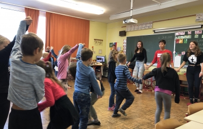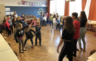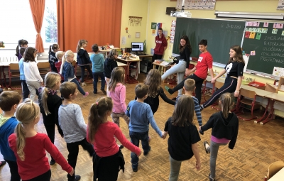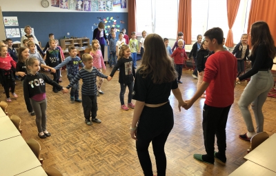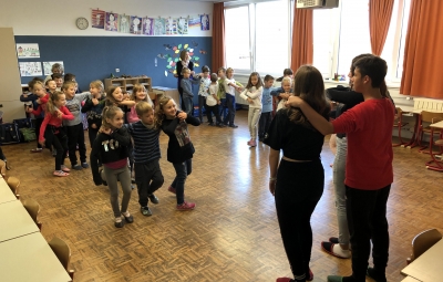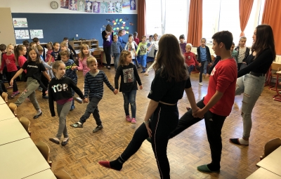 Iskrena zahvala devetošolcem, ki so danes, 25. 10. 2019, obiskali drugi razred in nam popestrili prvo šolsko uro. Pod njihovim vodstvom smo pouk začeli z osnovnimi koraki ljudskega plesa; in to ne kateregakoli, temveč tistega, ki so ga usvojili na izmenjavi učencev na Poljskem. Ob glasbeni podlagi ga bomo še vadili in pilili. Želimo si še sodelovati z njimi.