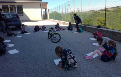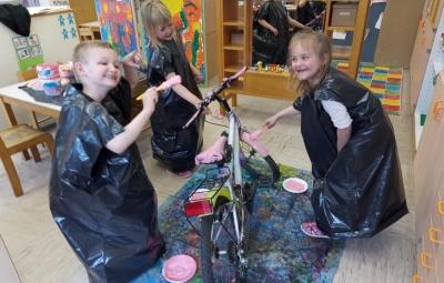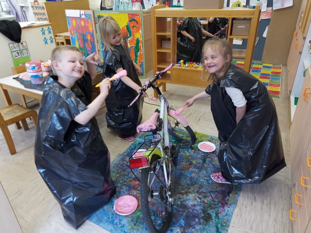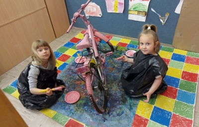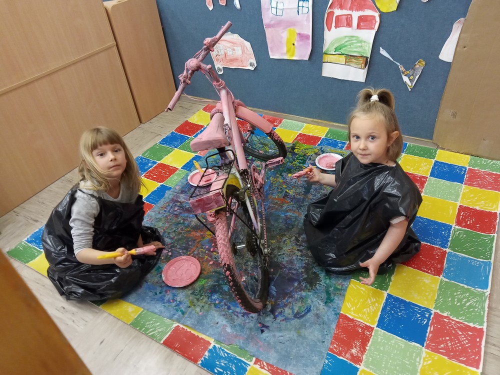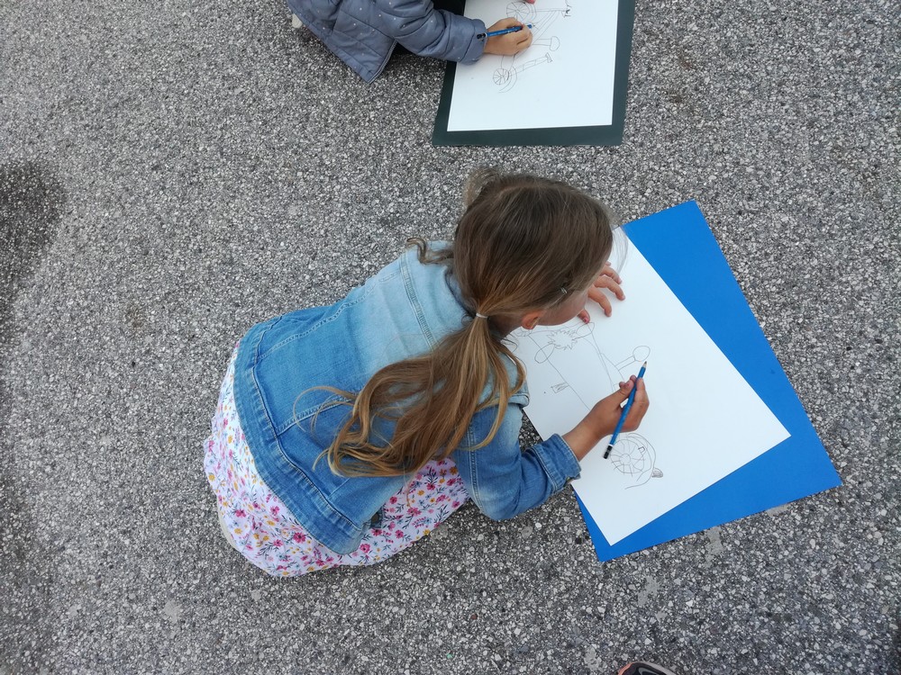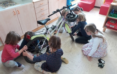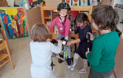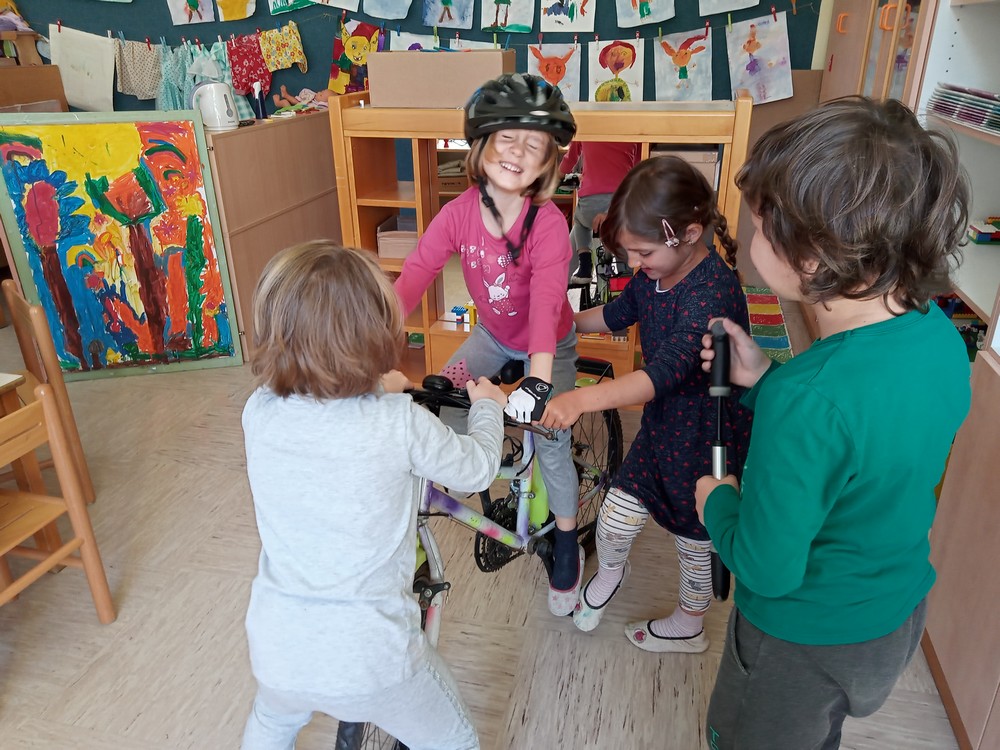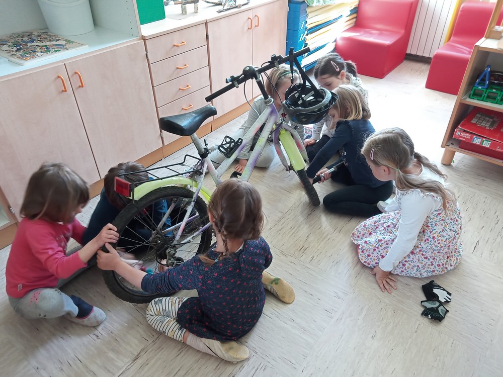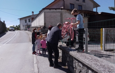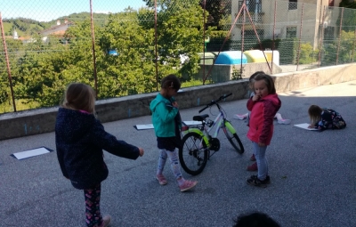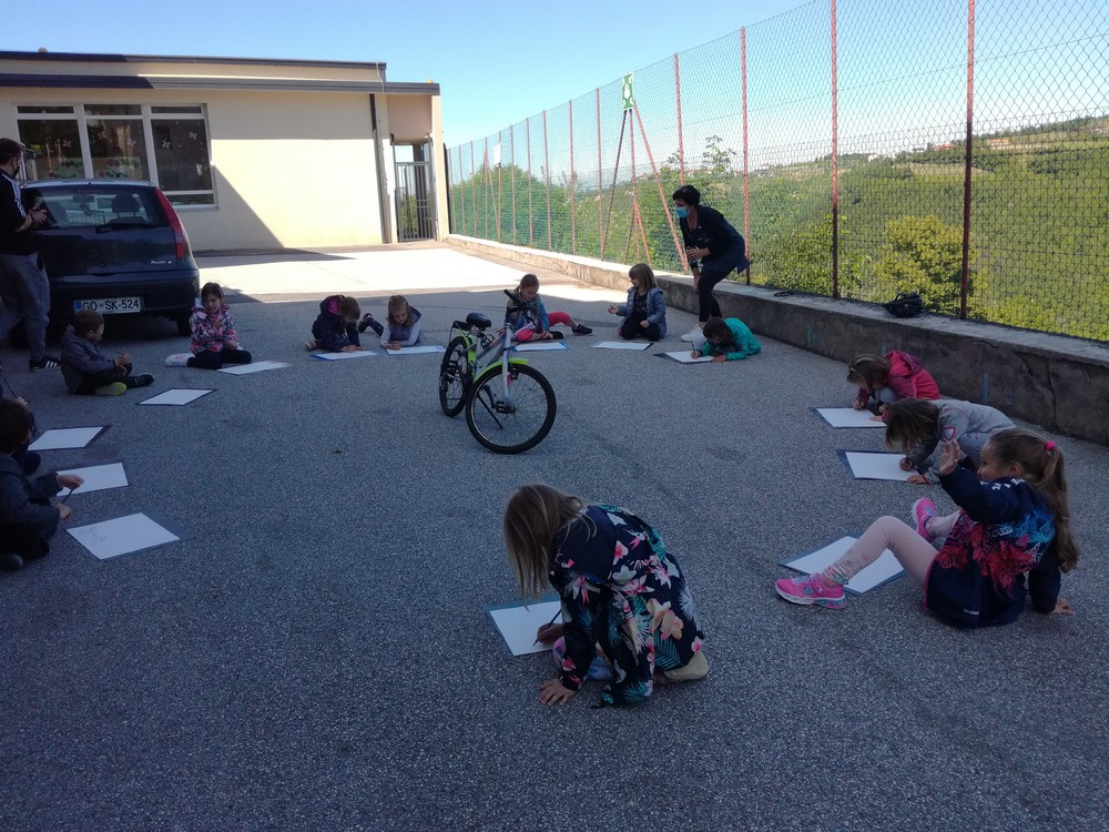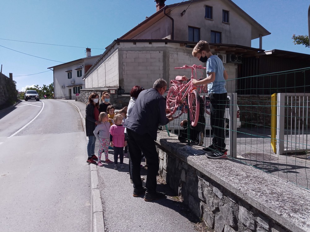 Otroci iz skupine Mucke smo se pridružili urejanju okolice, ob športnem dogodku Giro di Italia. Hišnik nam je priskrbel kolo, ki smo si ga najprej dobro ogledali in ugotovili, da ima prazni zračnici. S tlačilko smo se lotili dela. Ko je bilo kolo pripravljeno, smo se na igrišču preizkusili v vožnji z njim in ga nato narisali. Ker pa zmagovalec tega tekmovanja obleče roza majico, smo naše kolo prebarvali v roza in ga skupaj s hišnikom postavili na ograjo pred šolo.