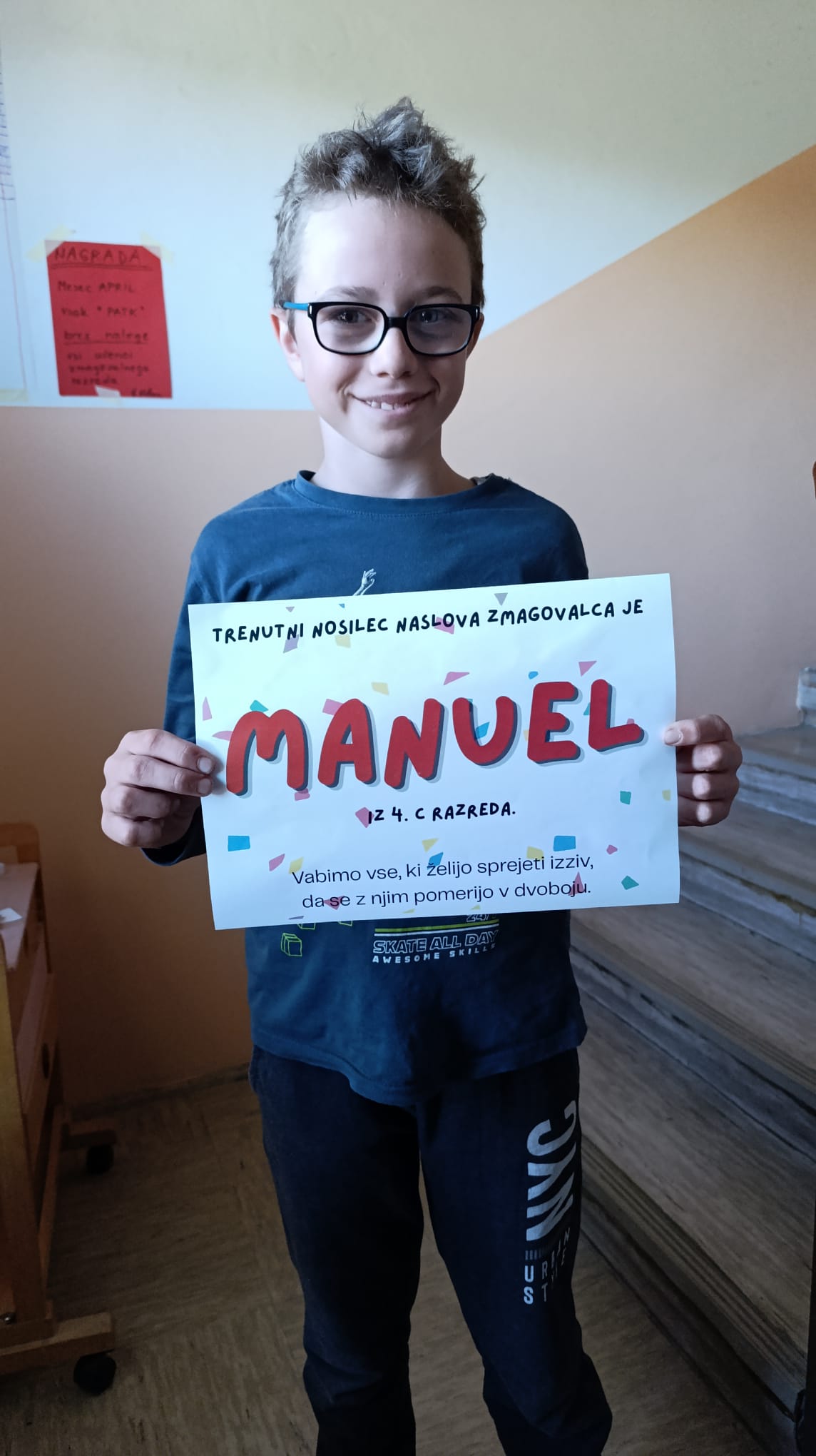 Kot nagrado bodo četrtošolci ves april imeli proste petke – brez domače naloge. Ostali učenci pa niso ostali brez priložnosti: do konca šolskega leta imajo možnost, da se v dvobojih poštevanke pomerijo z Manuelom in prevzamejo vodstvo.