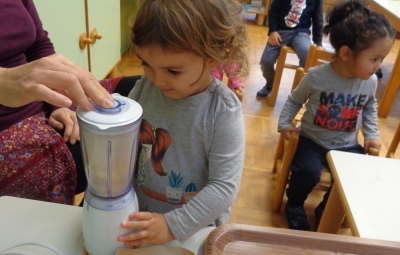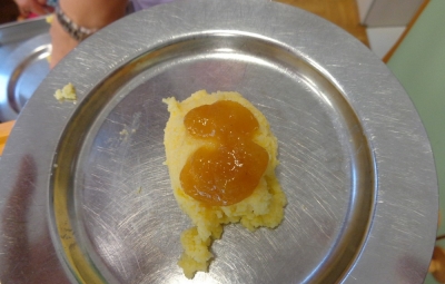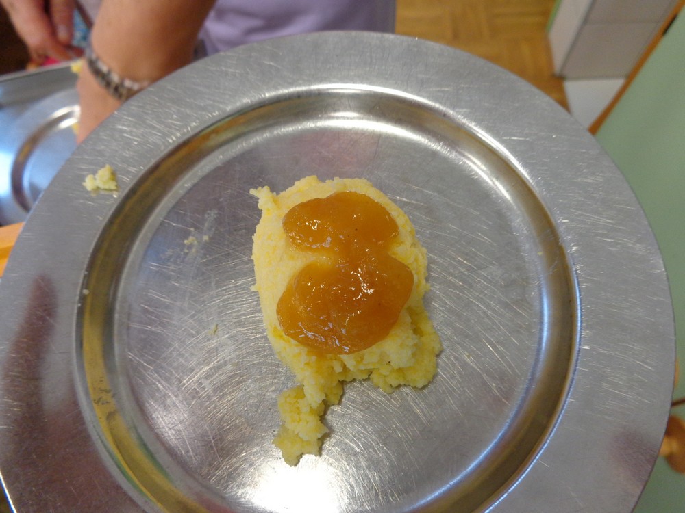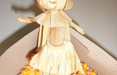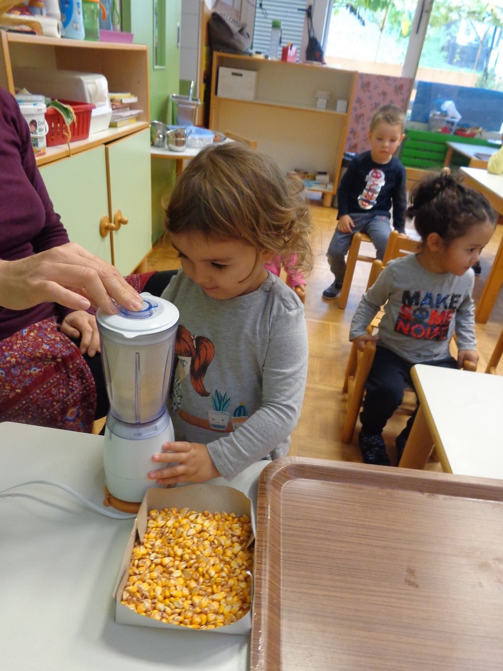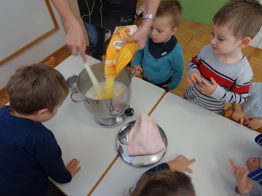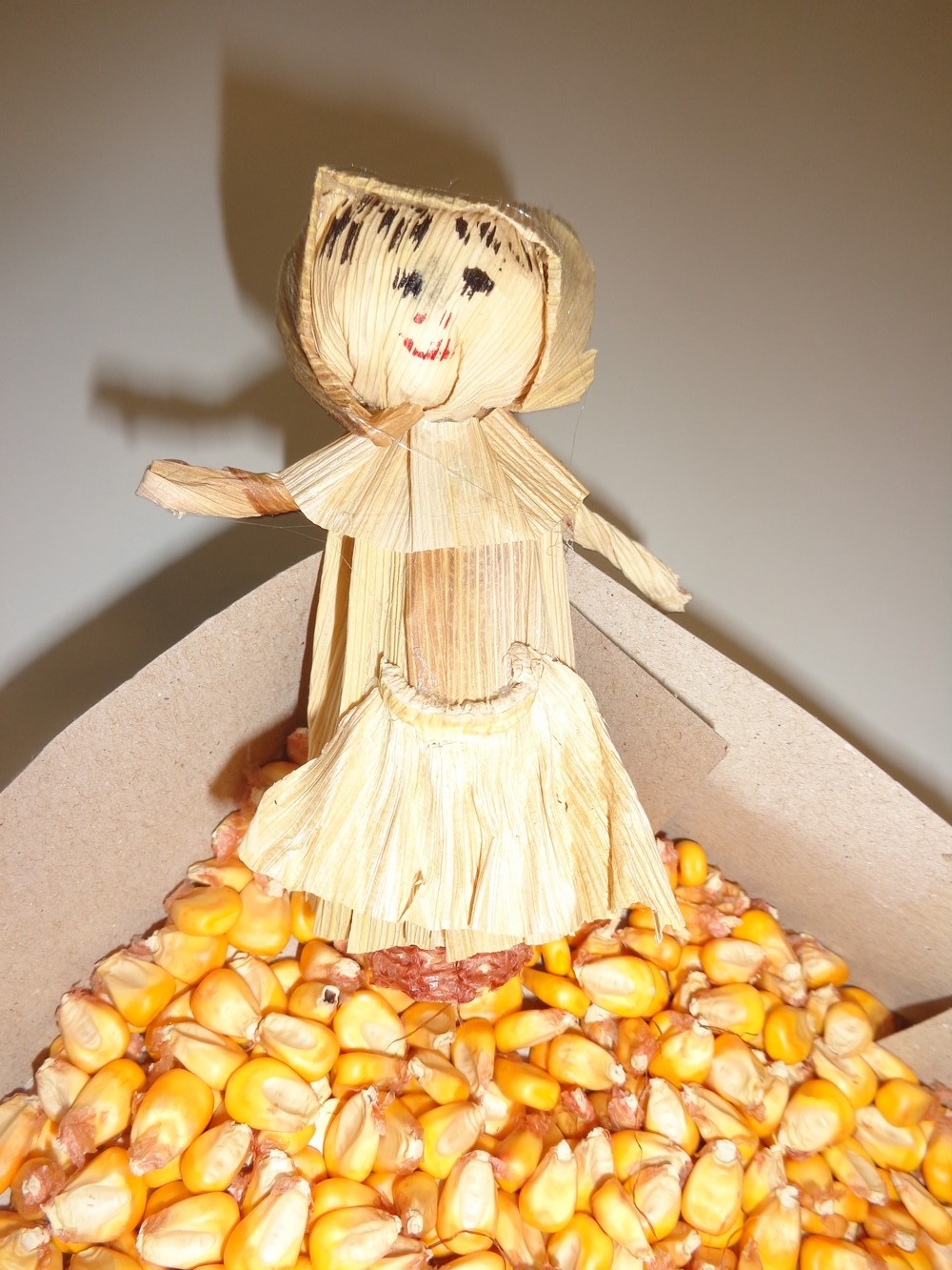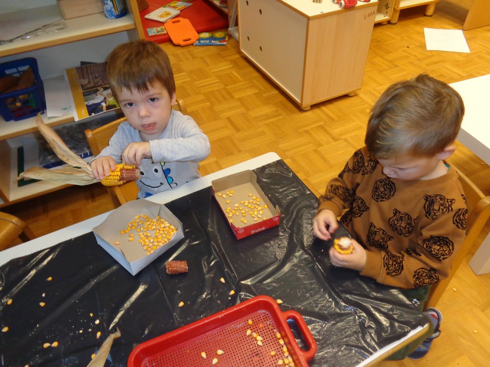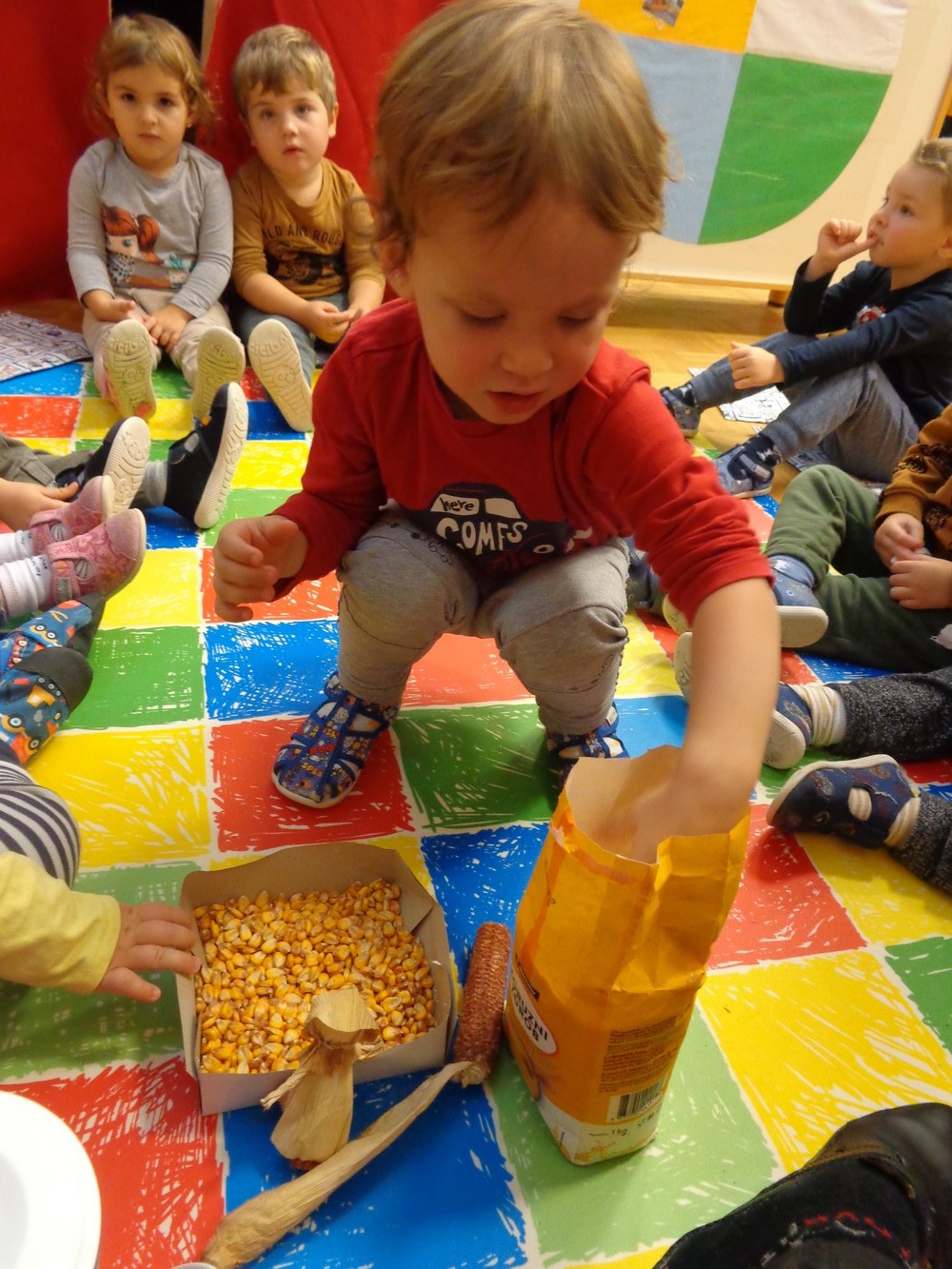 V mesecu oktobru smo se otroci skupine traktorji pogovarjali o jesenskih pridelkih, novembra pa smo spoznavali koruzo. Zanimalo nas je, kako lahko iz koruznih storžev pripravimo sami obrok. V ta namen smo oličkali koruzne storže, da smo dobili koruzna zrna. Iz storža in ličkanja smo izdelali kmetico in kmeta. Koruzna zrnja pa smo zmleli v koruzni zdrob. Pogledali smo si tudi posnetek, kako koruzo zmeljejo v pravem mlinu. Iz koruznega zdroba in dodatkov smo skuhali koruzno pogačo. Dodali smo še sadni preliv in nastala je prava slaščica...Zadovoljni smo se posladkali z njo.