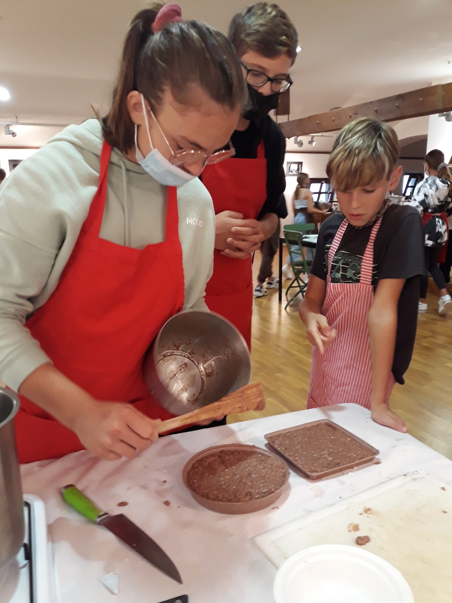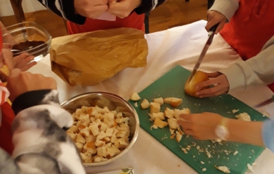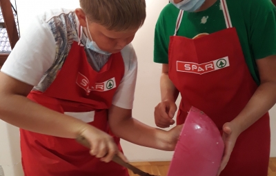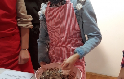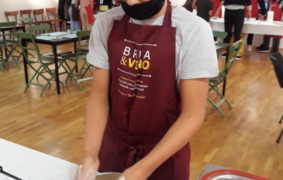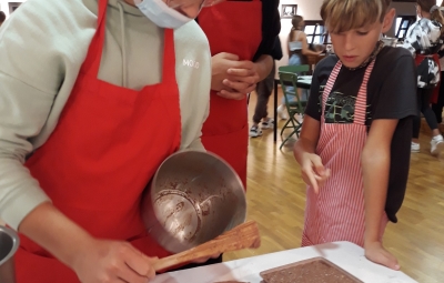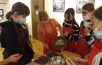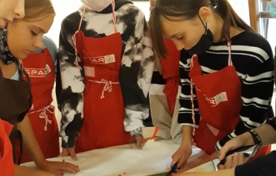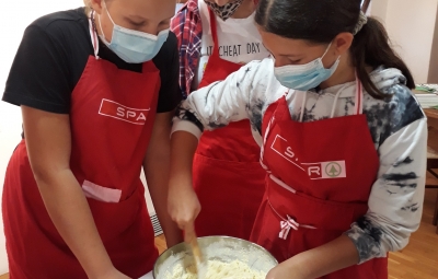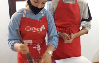 Na povabilo Zavoda za turizem, kulturo, mladino in šport Brda so se učenci, ki v letošnjem letu obiskujejo izbirna predmeta Sodobna priprava hrane in Načini prehranjevanja, v sredo, 6. 10. 2021, udeležili kuharskih delavnic v Hiši kulture v Šmartnem. Gospa Tatjana Bašin je učencem predstavila pripravo nekaterih tradicionalnih briških jedi. Učenci so po njenih nasvetih pripravili ješprenjko, paštafižol, tagičevo kuhnjo in kruhovo torto - preprosto sladico iz starega kruha. Spekli pa so tudi sirkove pogače z različnimi dodatki - z ocvirki, suhimi slivami in grozdjem izabelo.