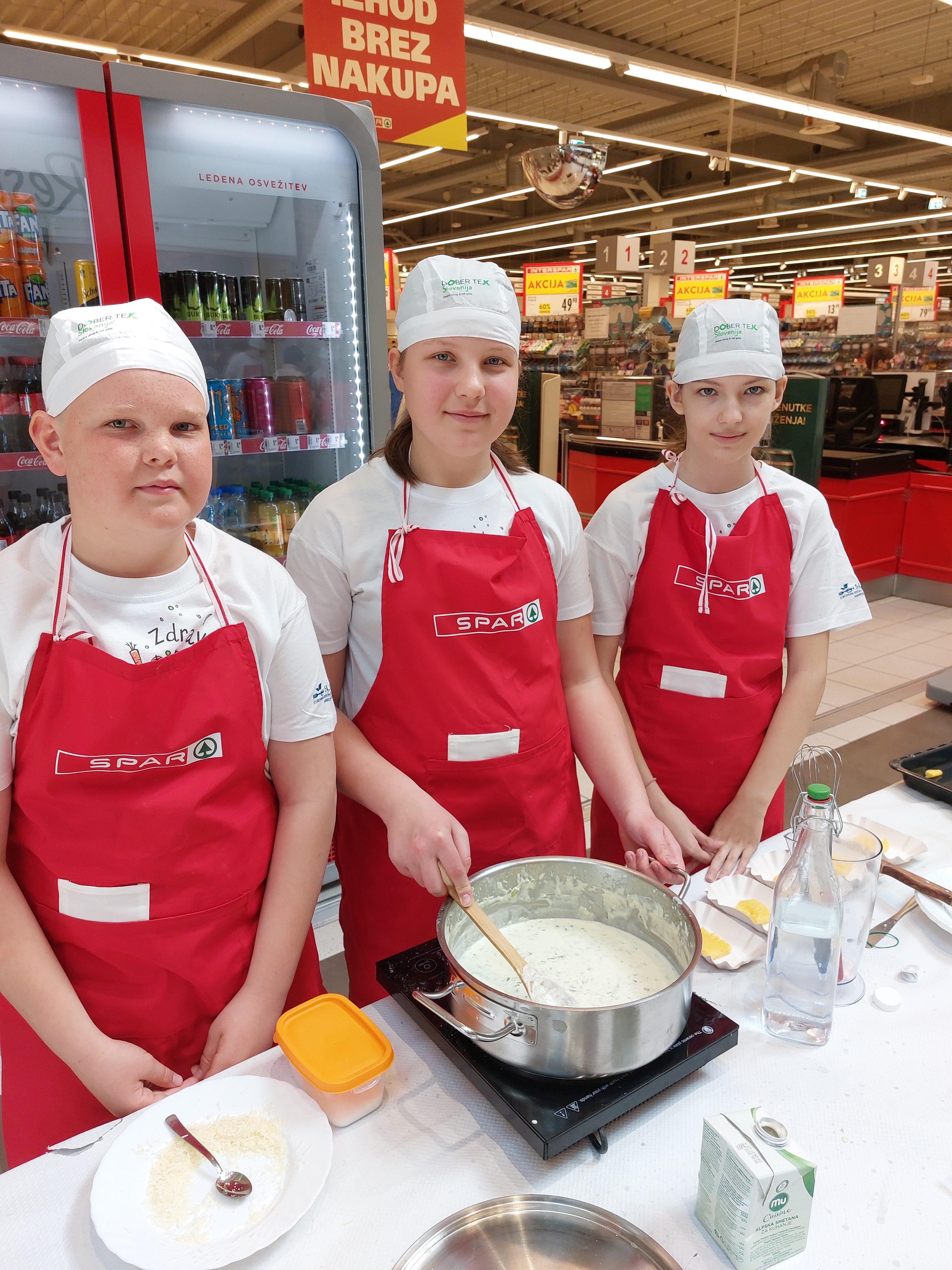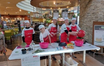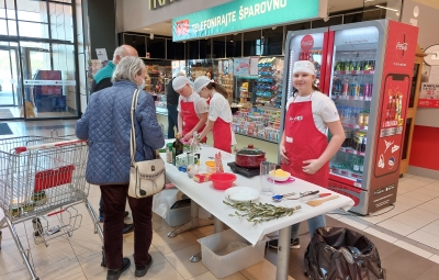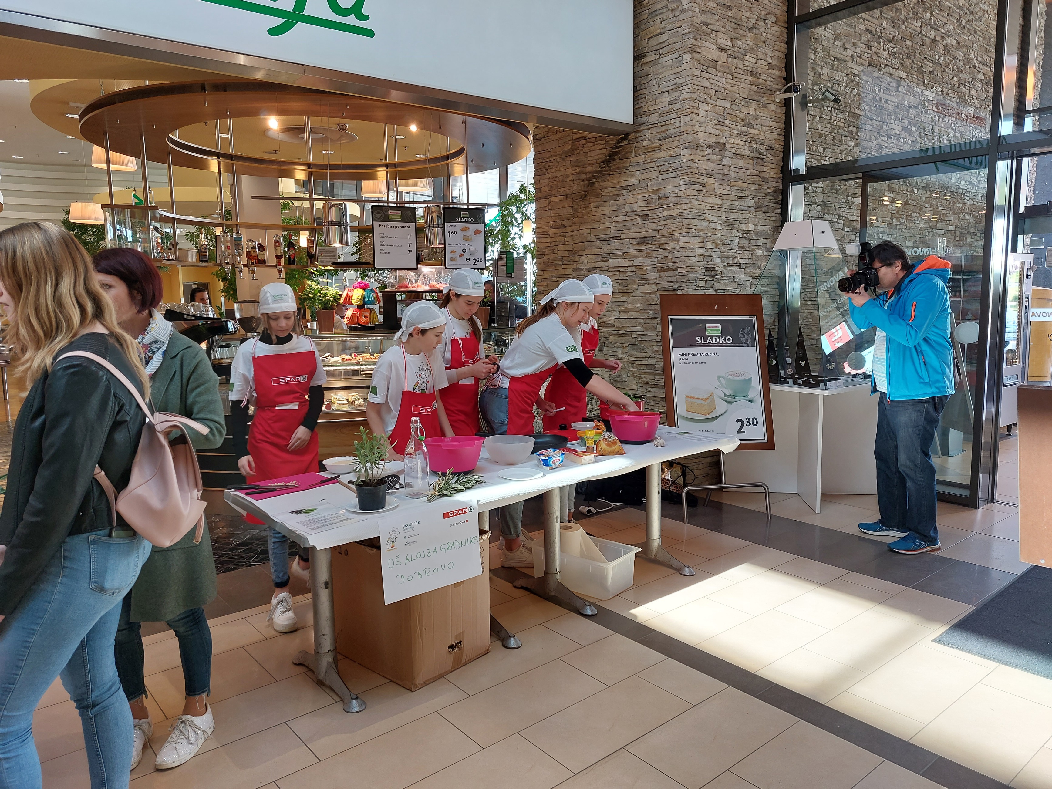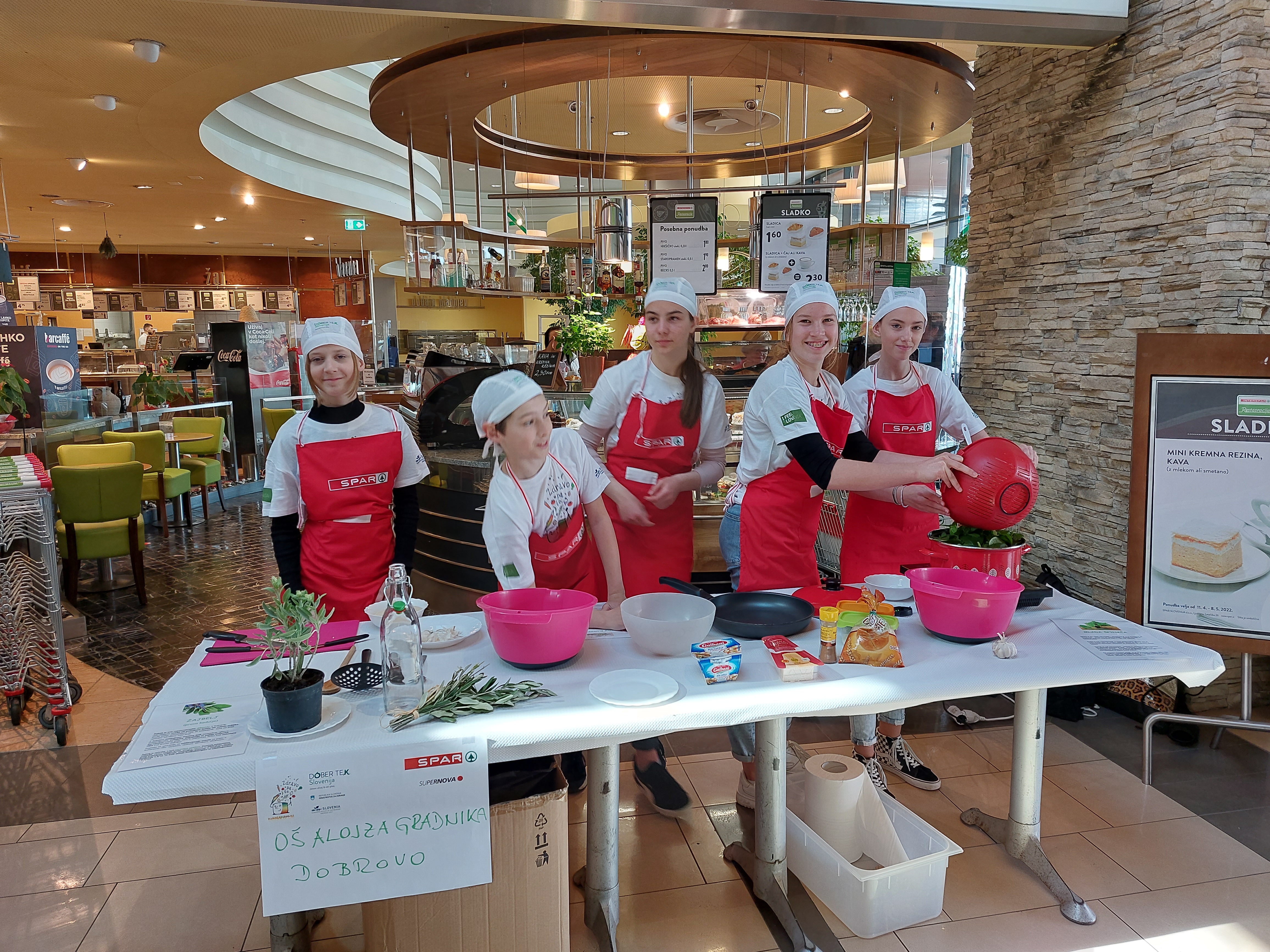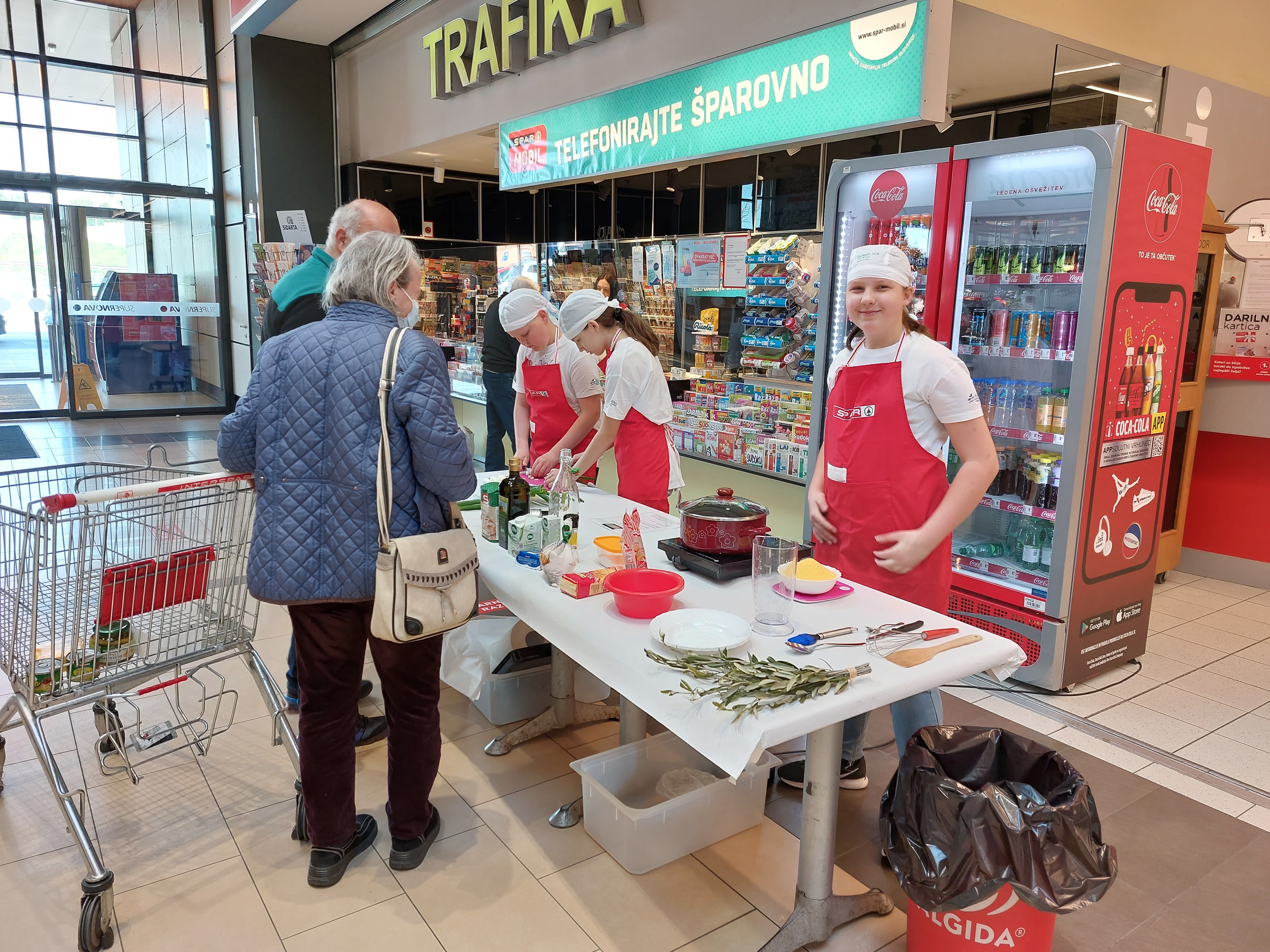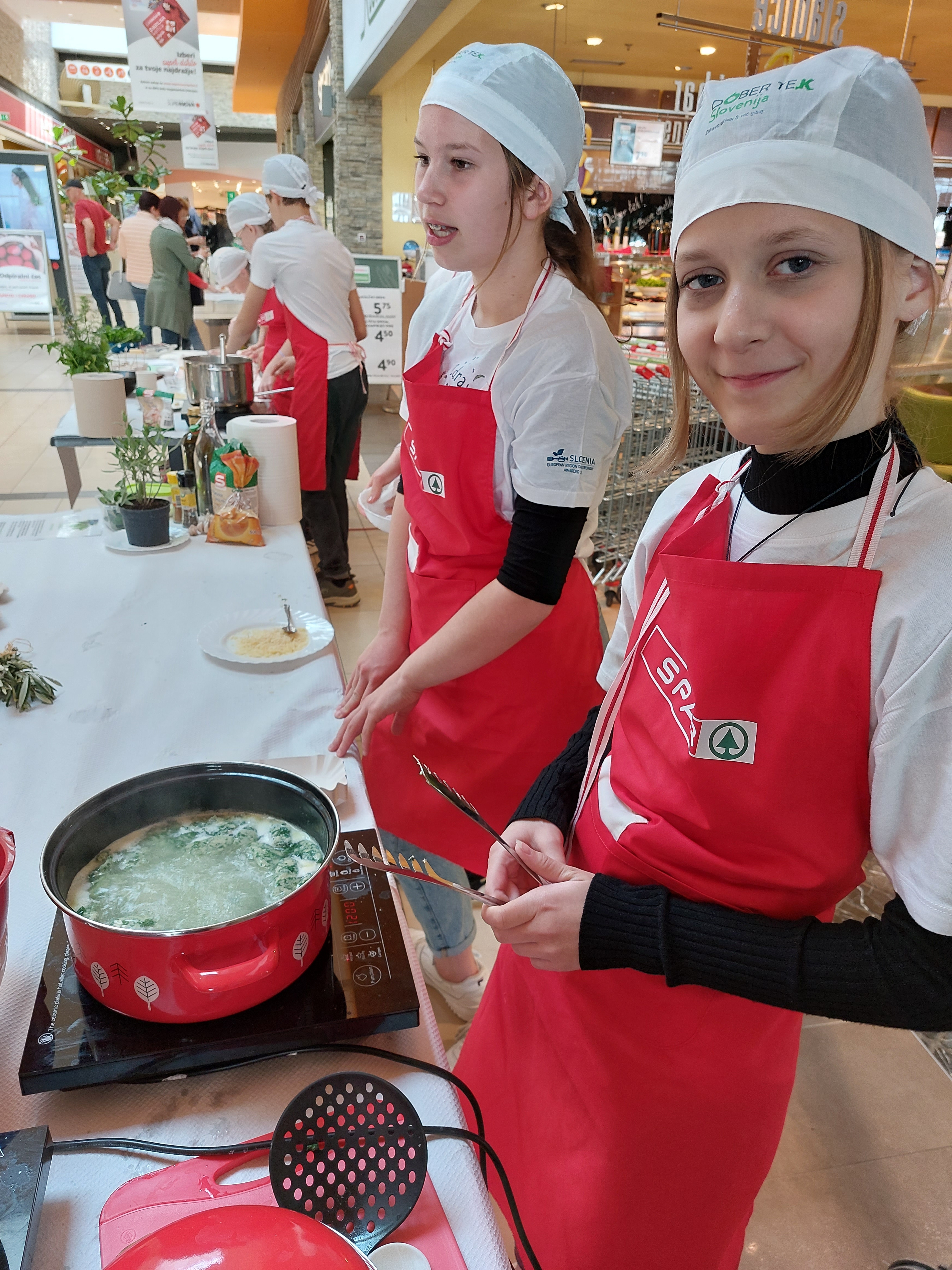 V petek, 15. 4. 2022, se je v Novi Gorici v nakupovalnem središču Supernova (Qlandia) odvijal kuharski nastop. Udeležili so se ga tudi nekateri učenci, ki obiskujejo pouk izbirnih predmetov s področja priprave hrane. Predstavili so pripravo nekaterih jedi, v katerih je bilo potrebno uporabiti sezonska živila. Odločili smo se za zelišča in mlado zelenjavo - žajbelj, sivko, mlado čebulo in mlado špinačo. Seveda ni manjkala polenta. Učenci so prikazali tudi, kako s pridom porabimo živila, ki nam ostajajo (star kruh).