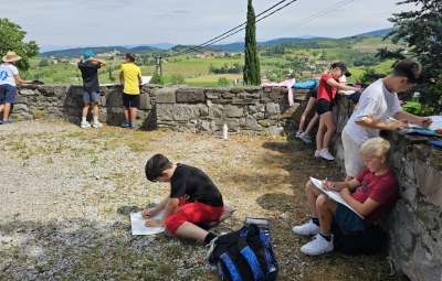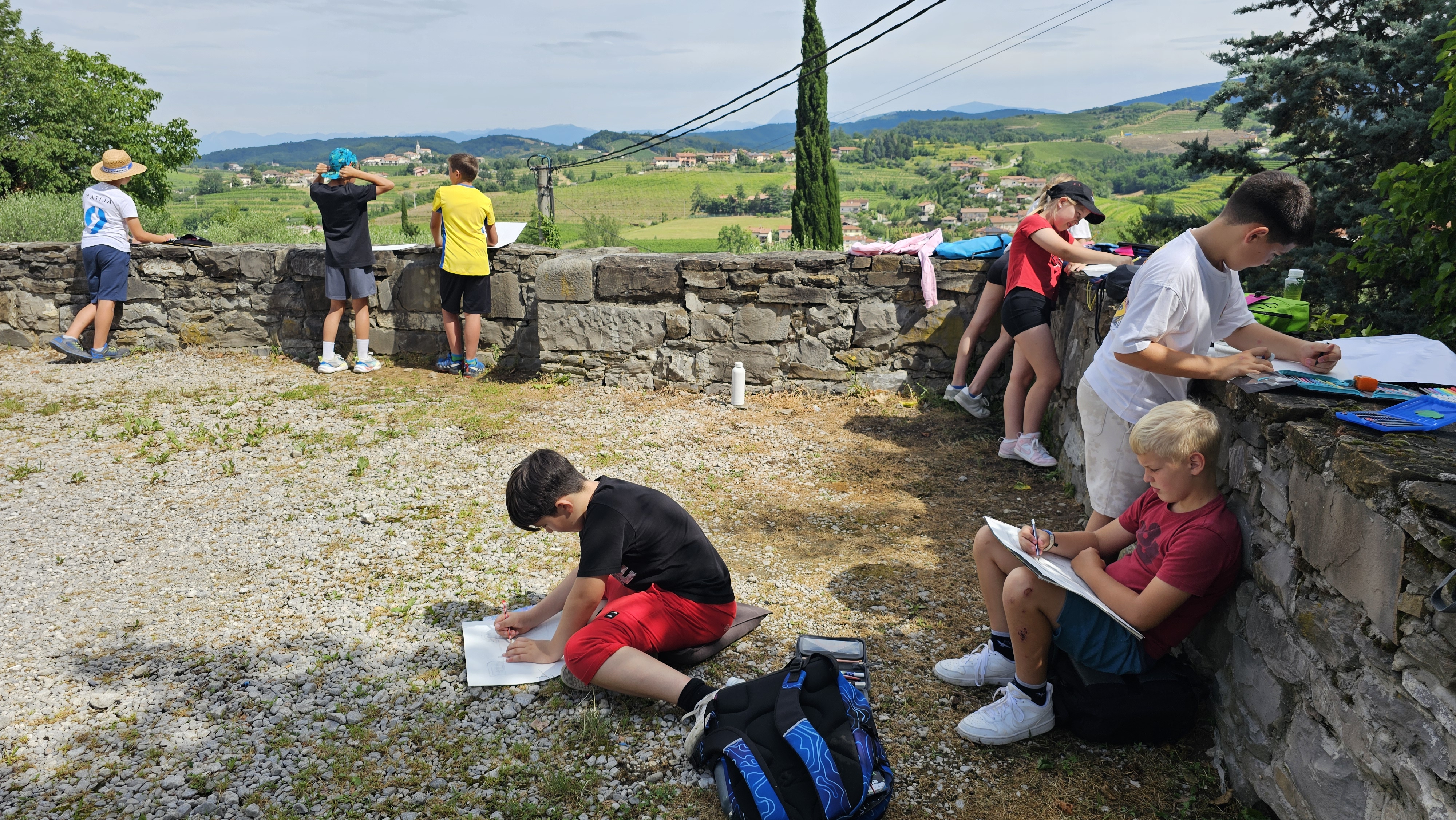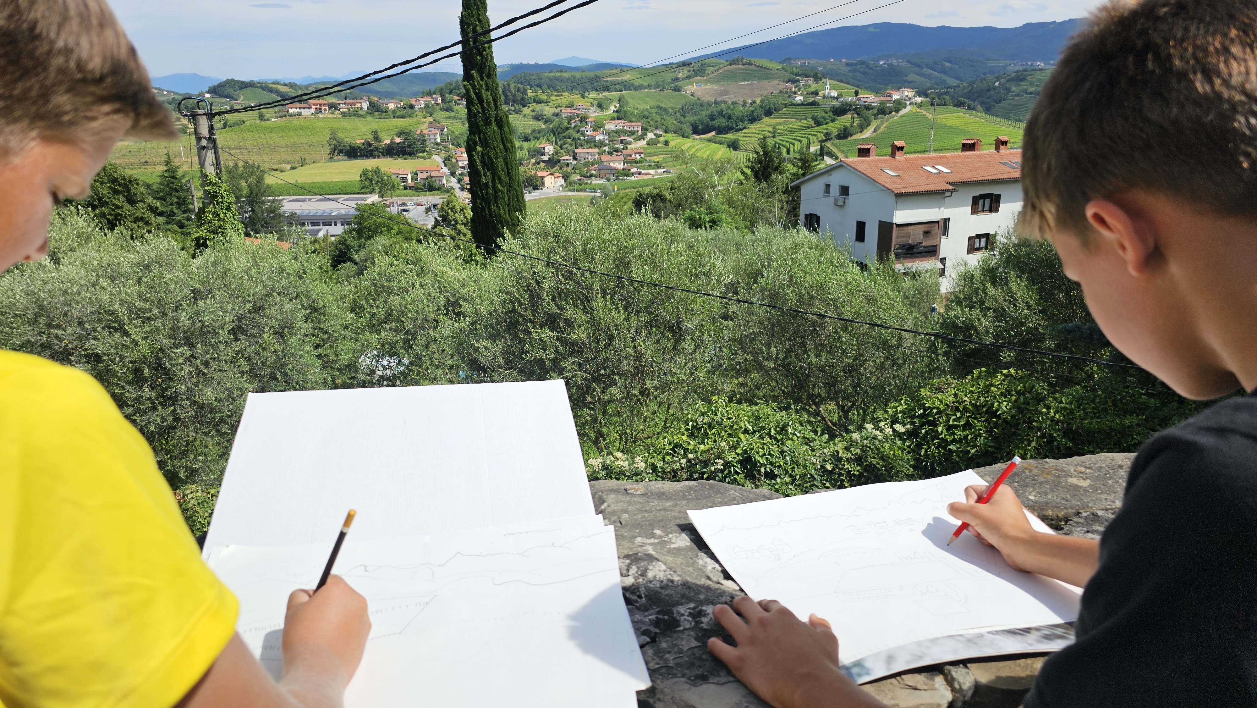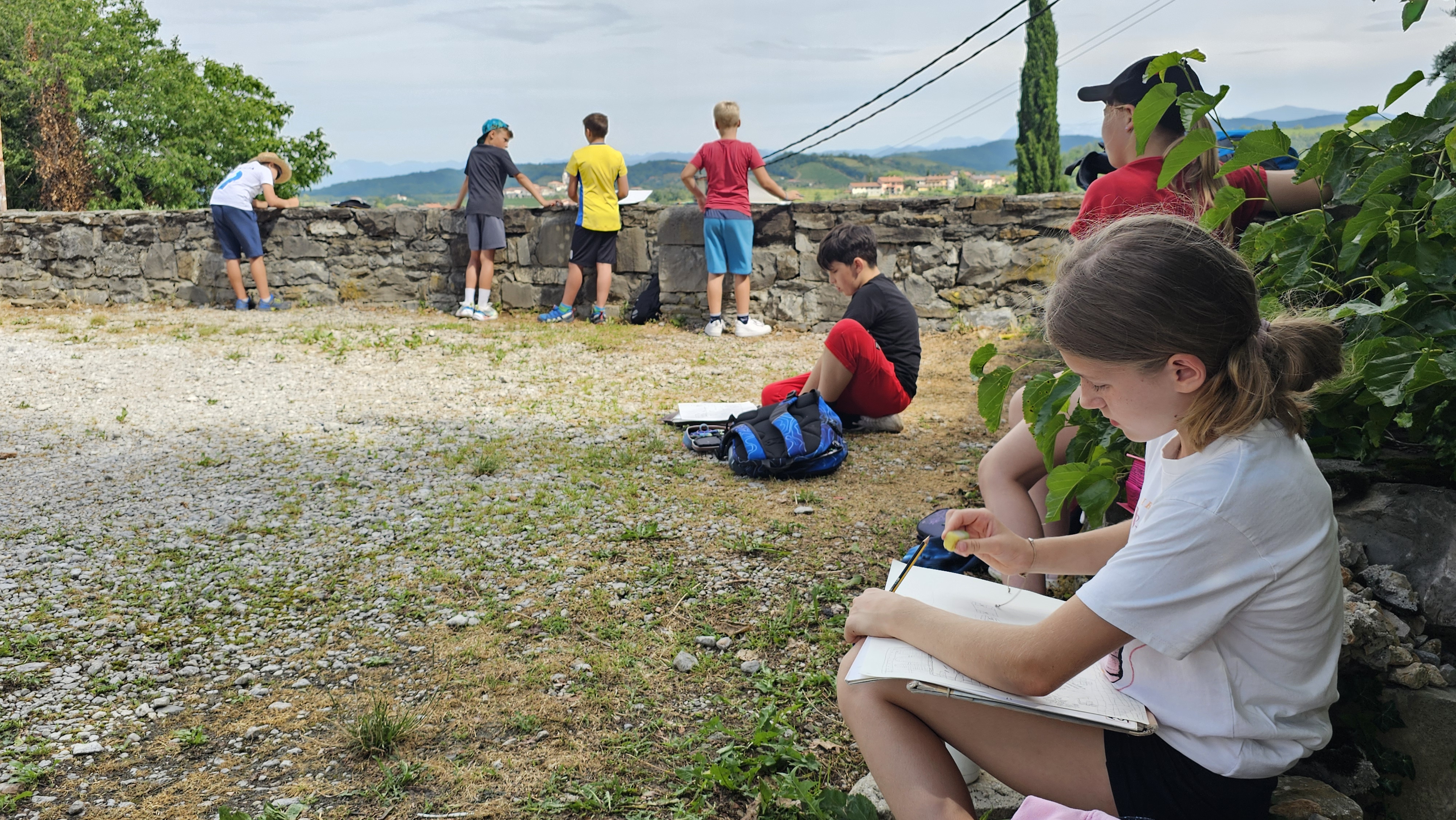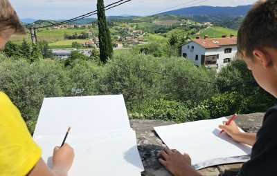 Današnji - ne toliko vroč dan - je bil ravno pravšnji za ustvarjanje na prostem. Učenci 4.a smo si izbrali prostor pred gradom Dobrovo. Tako smo lahko po neposrednem opazovanju grad tudi narisali. Nekateri učenci smo naslikali tudi gričevnato pokrajino, ki smo jo lahko občudovali z obzidja pred gradom. Po končanem delu smo svoje risbe tudi razstavili.