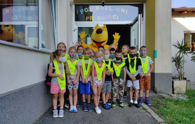 Danes je prvošolčke s svojim obiskom razveselil Kuža Pazi. Preveril je ali vsi učenci nosijo rumeno rutko.