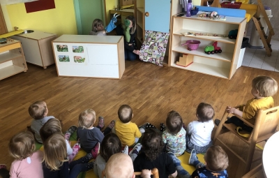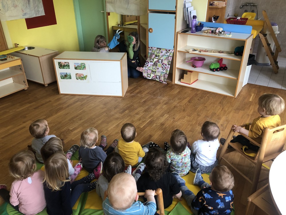 V roza igralnici so si otroci ogledali lutkovno predstavo »Hišica iz sanj«, prirejeno po pravljici »Palček Pohajalček«. Na obisku smo gostili zeleno žabo, zajčka, ježa, medveda in majceno miško.