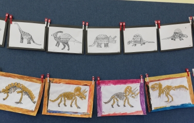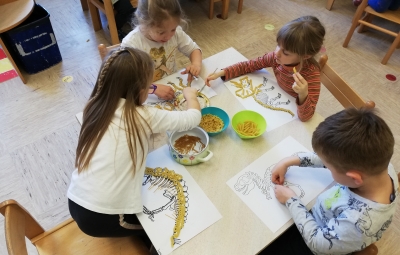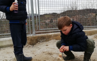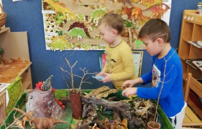 V gozdičku smo se igrali paleontologe in iskali »dinozavrove kosti« in z njih sestavljali okostja različnih dinozavrov. Kljub temu, da smo vedeli, da so dinozavri izumrli, smo v naravi iskali njihove sledi, in ker otroška domišljija ne pozna meja, smo jih tudi našli.