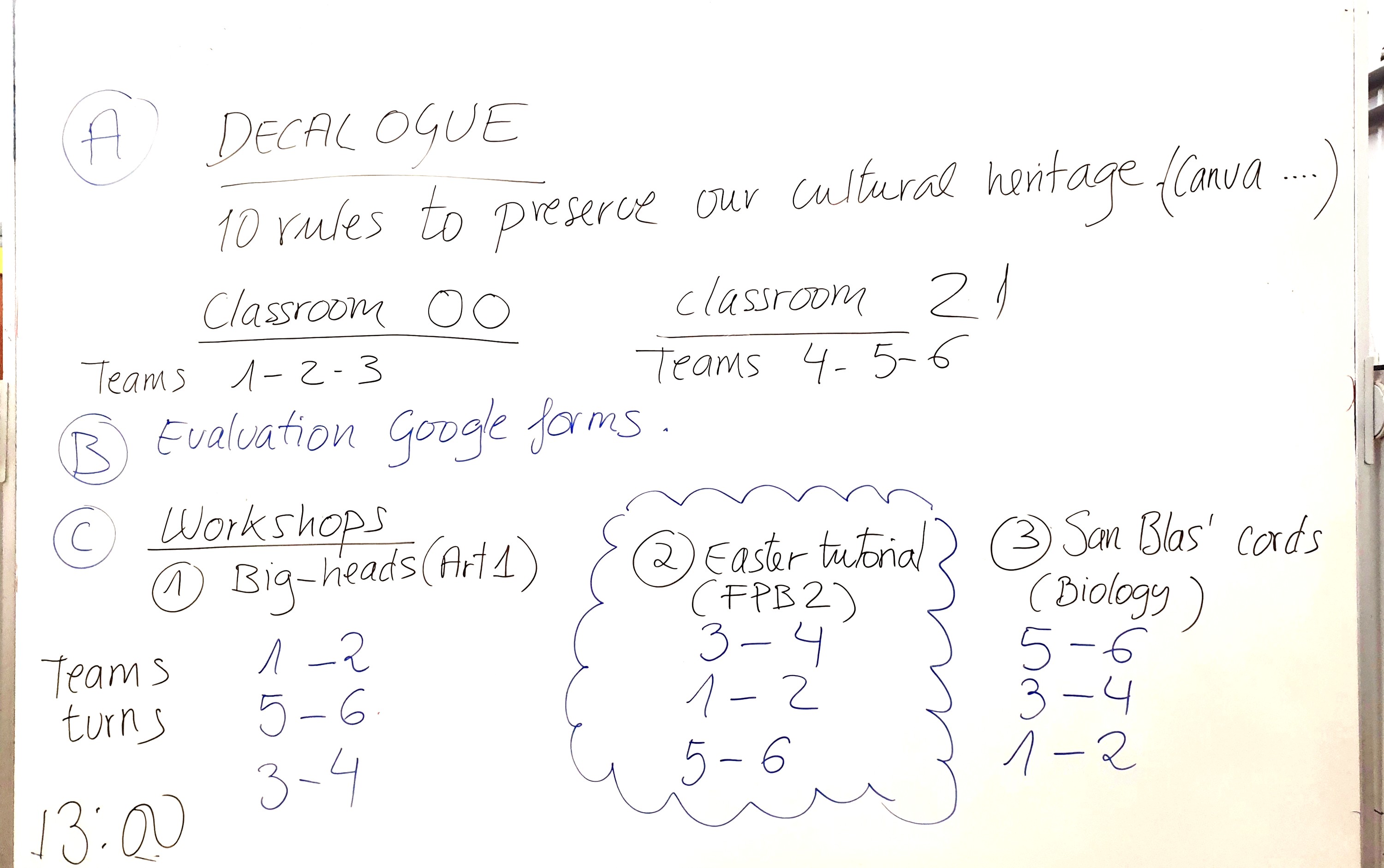 Za začetek smo v skupinah zbirali ideje, kako bi ohranili ter zaščitili kulturno in naravno dediščino, katero smo si cel teden ogledovali in občudovali. Imeli smo tudi tri delavnice: priprava sladkega prazničnega kruha torrijas, izdelava mask in pletenje obeskov. Zabave nam ni manjkalo!! Za konec je še vsaka ,,država” pripravila kratko analizo, kaj nam je na izmenjavi bilo najbolj všeč, kaj bi še spremenili ali izboljšali v tem norem tednu.