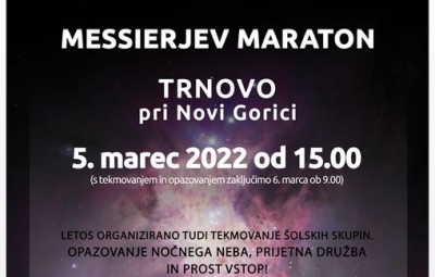 5. marca je bil poseben dogodek, saj je te noči potekal maraton Messierjevih objektov. Kaj sploh so Messierjevi objekti? To je 110 najsvetlejših nebesnih teles (meglice, galaksije, zvezdne kopice). Nekatere pod temnim nebom lahko vidimo s prostimi očmi, večino pa le s teleskopom ali daljnogledom. Maraton traja celo noč in tekmovalci morajo tekom noči najti čim več objektov. Zmaga seveda tisti, ki jih najde največ.
