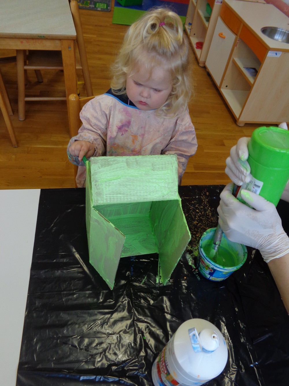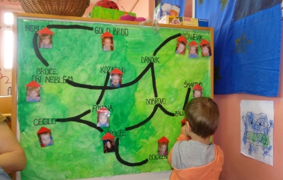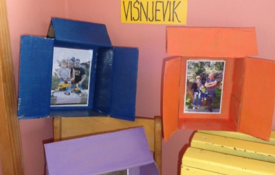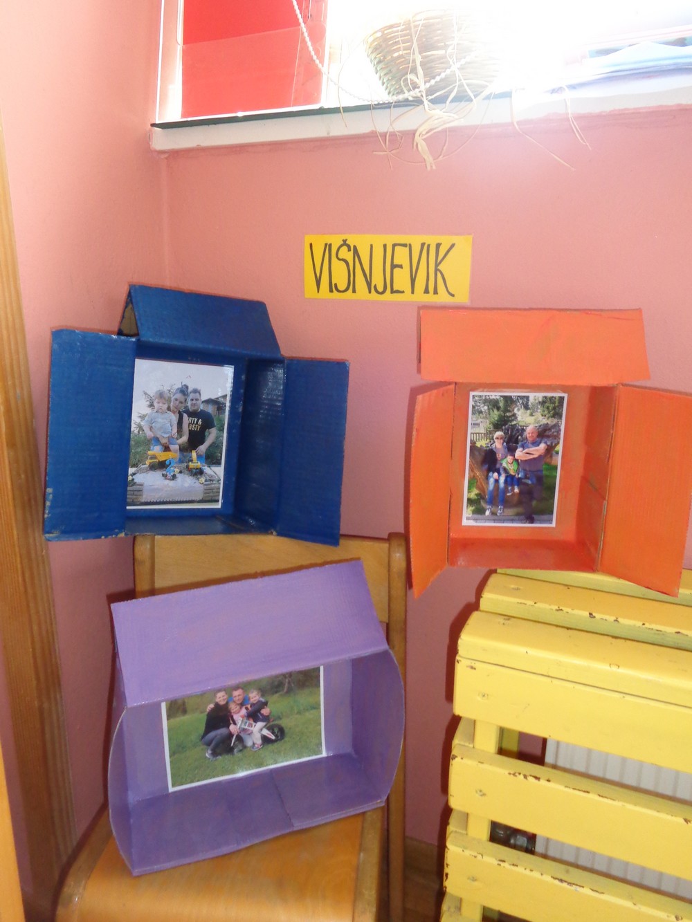 V skupini Pikapolonice smo se v mesecu maju pogovarjali o naši družini, kdo jo sestavlja in v kateri vasi živimo. Na zemljevidu se je vsak posameznik označil, kateri vasi pripada, pri tem pa spoznal, kateri otroci iz skupine so njegovi sovaščani. Izdelali smo vsak svojo hiško, jo pobarvali v željeno barvo, vanjo pa nalepili sliko družine. Po igralnici smo namestili vasi s hišami, kjer živimo.