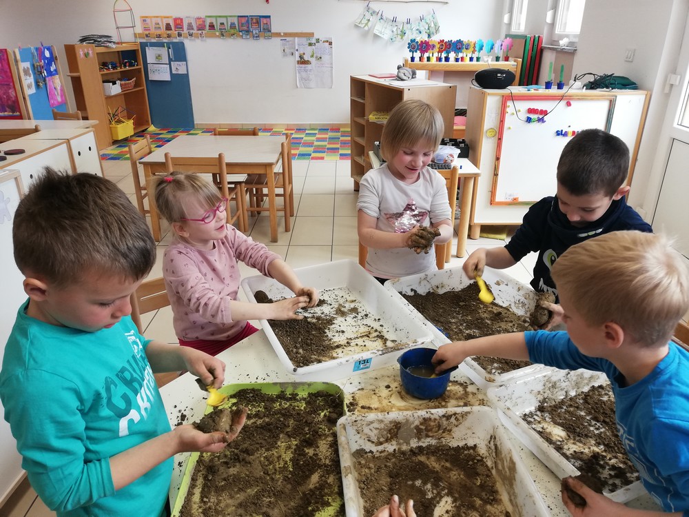 Otroci iz skupine Gozdarji smo se odločili, da si na atriju uredimo vrt. Ureditev vrta poteka kot projekt, v katerem v vseh fazah sodelujejo otroci. Preko pogovora smo najprej ugotavljali kaj vemo o vrtu, vrtnarjenju, zelenjavi, sajenju.... Ugotovili smo, da kar nekaj stvari že vemo, saj ima skoraj vsak od nas doma vrt. "Na vrtu je zemlja", je dejal eden od otrok. Zato smo najprej začeli z raziskovanjem in opazovanjem gozdne in vrtne prsti. Ugotovili smo, da se razlikujeta po barvi in tudi sestavi. S poskusom smo ugotavljali kaj se zgodi, če prsti dodamo vodo. Nastalo je blato, s katerim smo se nekateri zelo radi igrali, drugim pa ni bilo preveč všeč, saj so si ob tem umazali roke. V zemlji smo videli deževnike, ki smo si jih pogledali s pomočjo povečevalnih stekel in jih opazovali pri gibanju. Ko smo se pogovarjali o rastlinah, ki rastejo na vrtu, sva otroke spraševali tudi o pogojih, ki jih moramo rastlini zagotoviti, da raste. Otroci so imeli o tem različna mnenja zato smo naredili poskus s fižolom in ugotovili, da rastlina potrebuje za rast vodo, toploto in svetlobo.