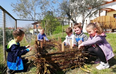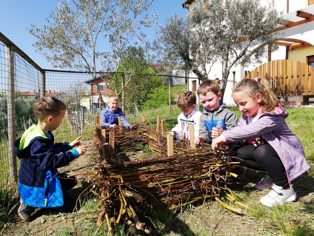 Sledilo je načrtovanjem gredice. Otroci so predlagali, da bi s traktorjem zorali atrij, ga prekopali z lopatami..., ker pa tega ne moremo narediti smo se odločili, da si naredimo visoko gredo. Razmišljali smo iz česa naj jo naredimo. Otroci so imeli različne predloge (iz desk, kartona, kamnov, vej...). Pogovorili smo se katere ideje so uresničljive in katere manj ter se odločili, da gredico izdelamo in vrbovih šib-bak, ki so jih otroci prinesli od doma. Gredica je nastajala cel teden, še malo manjka pa bo pripravljena za sejanje. Med tem smo v knjigah poiskali informacije o tem katere rastline hitro zrastejo in obrodijo, saj si želimo pridelek pobrati še preden odidemo na poletne počitnice.
