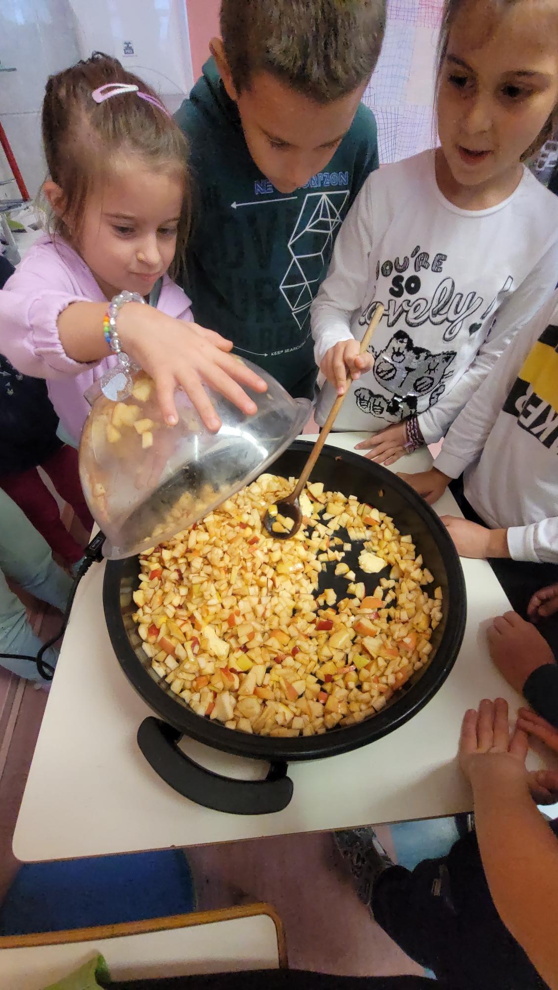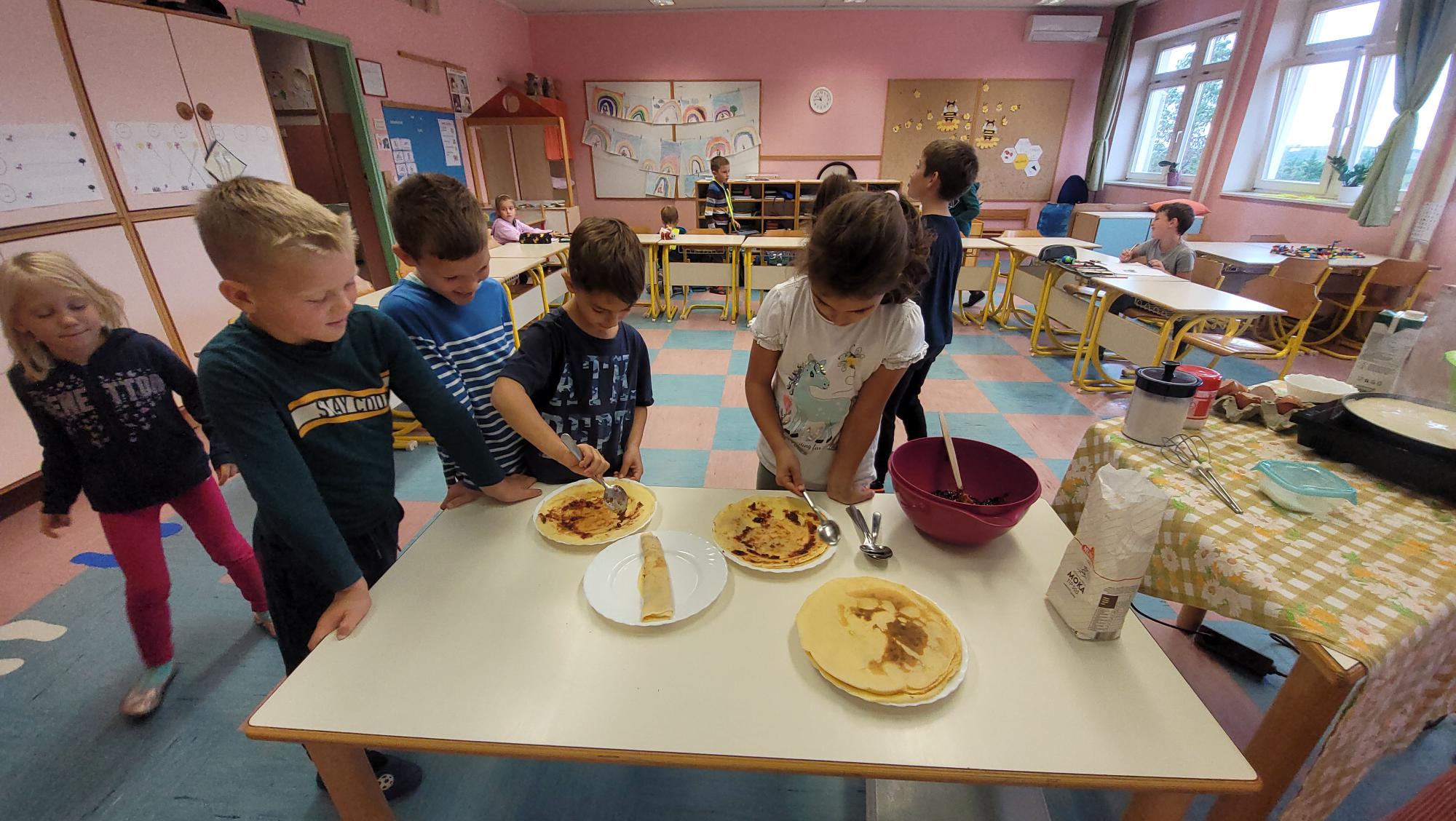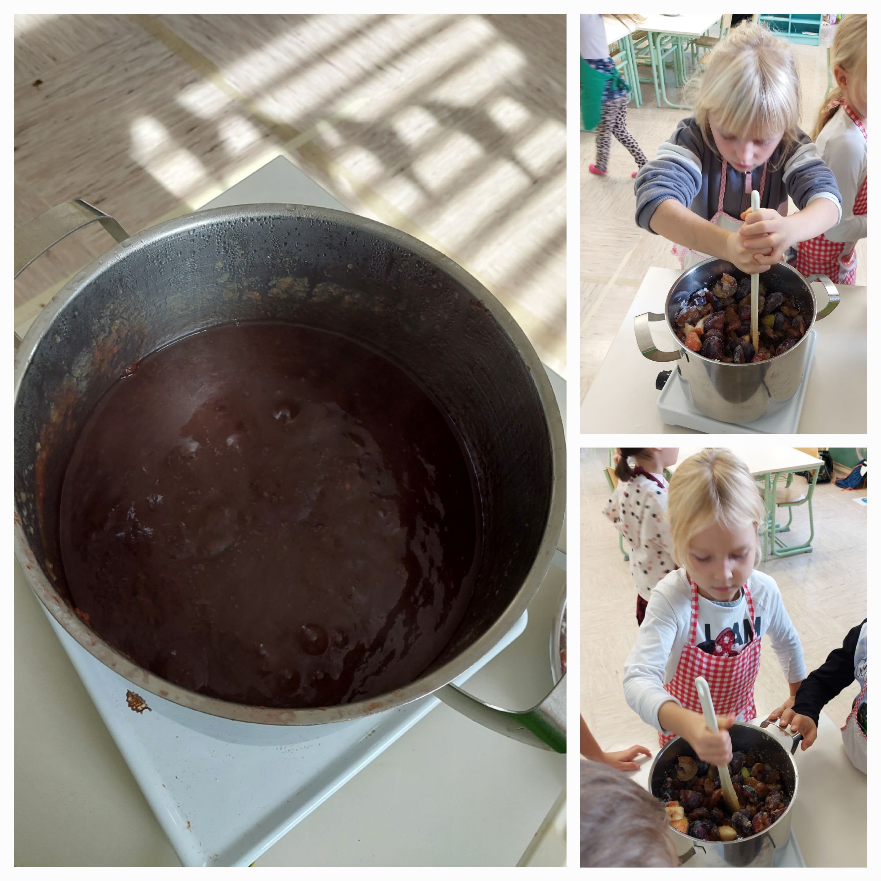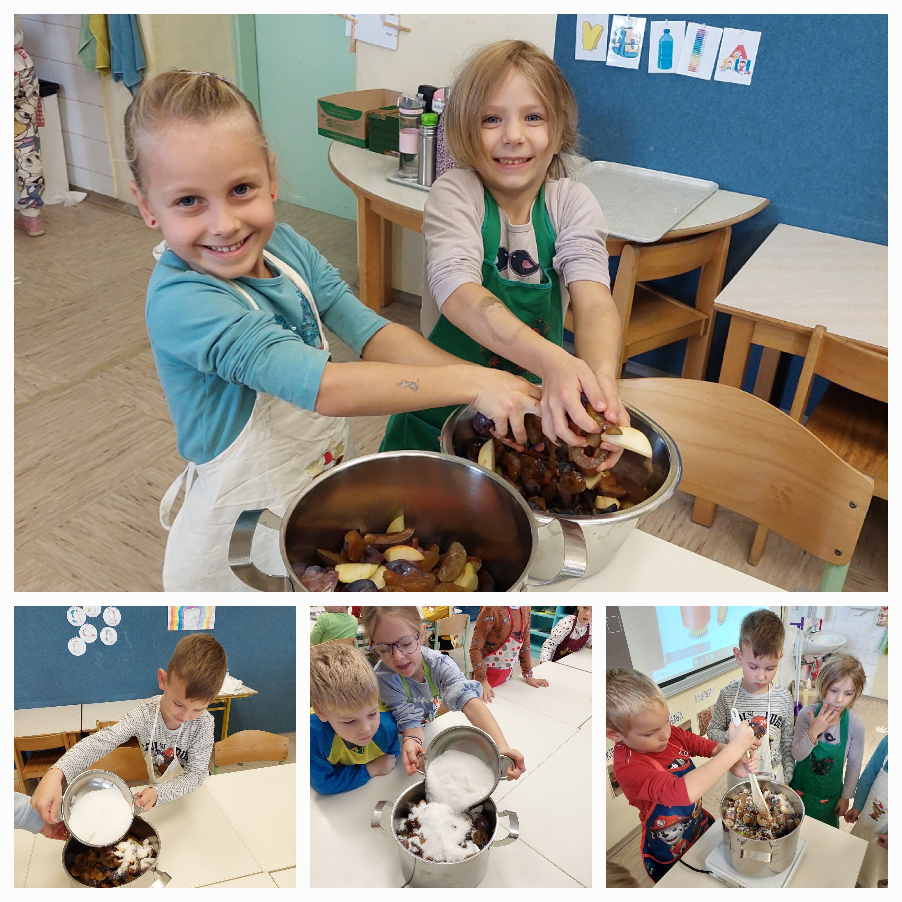 Tik pred jesenskimi počitnicami smo prvošolci zavihali rokave in si nadeli predpasnike ter pripravili slivovo marmelado in jabolčno čežano. Zjutraj smo pohiteli, razkoščičili slive, jih razrezali in dali v lonec. Nadaljevali smo z rezanjem jabolk, dodali smo še sladkor ter cimet in en, dva, tri - že diši! Res je prijetno dišalo iz naših učilnic. Ker pa vemo, da je na naši šoli veliko nadobudnih kuharjev, smo jih povabilii k sodelovanju. Nik, Gaja, Nej in Nina so za nas pripravili maso za palačinke in jih tudi spekli. Prvošolci smo pozorno in vztrajno opazovali ter priskočili na pomoč pri mazanju le-teh z našo marmelado. Med pripravo omenjenih dobrot smo se naučili pesmico Marmelada in na koncu dneva naredili še mini plakate. Aja, pozabili smo omeniti, da smo vse palačinke pojedli. In še prste obliznili.