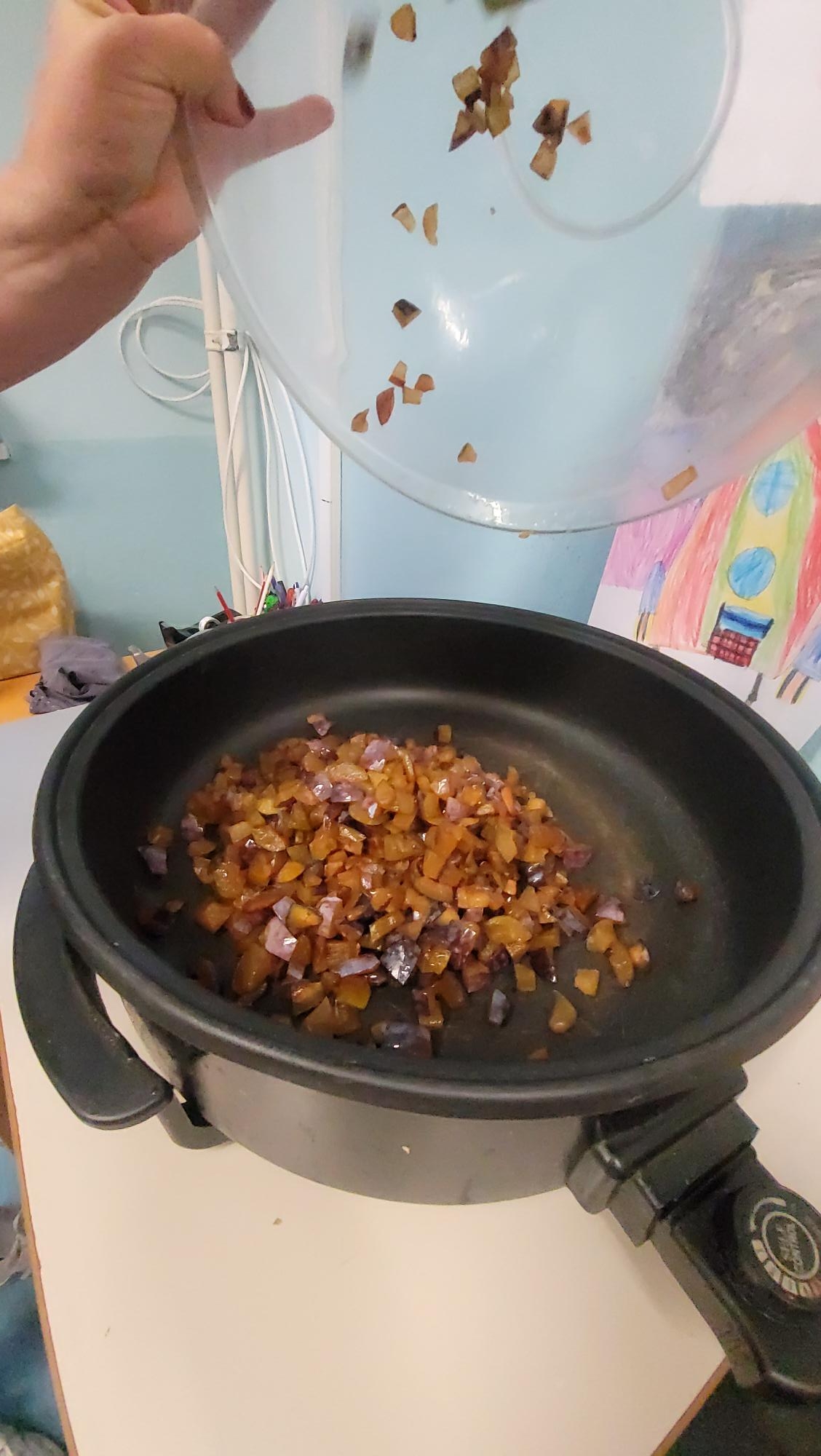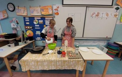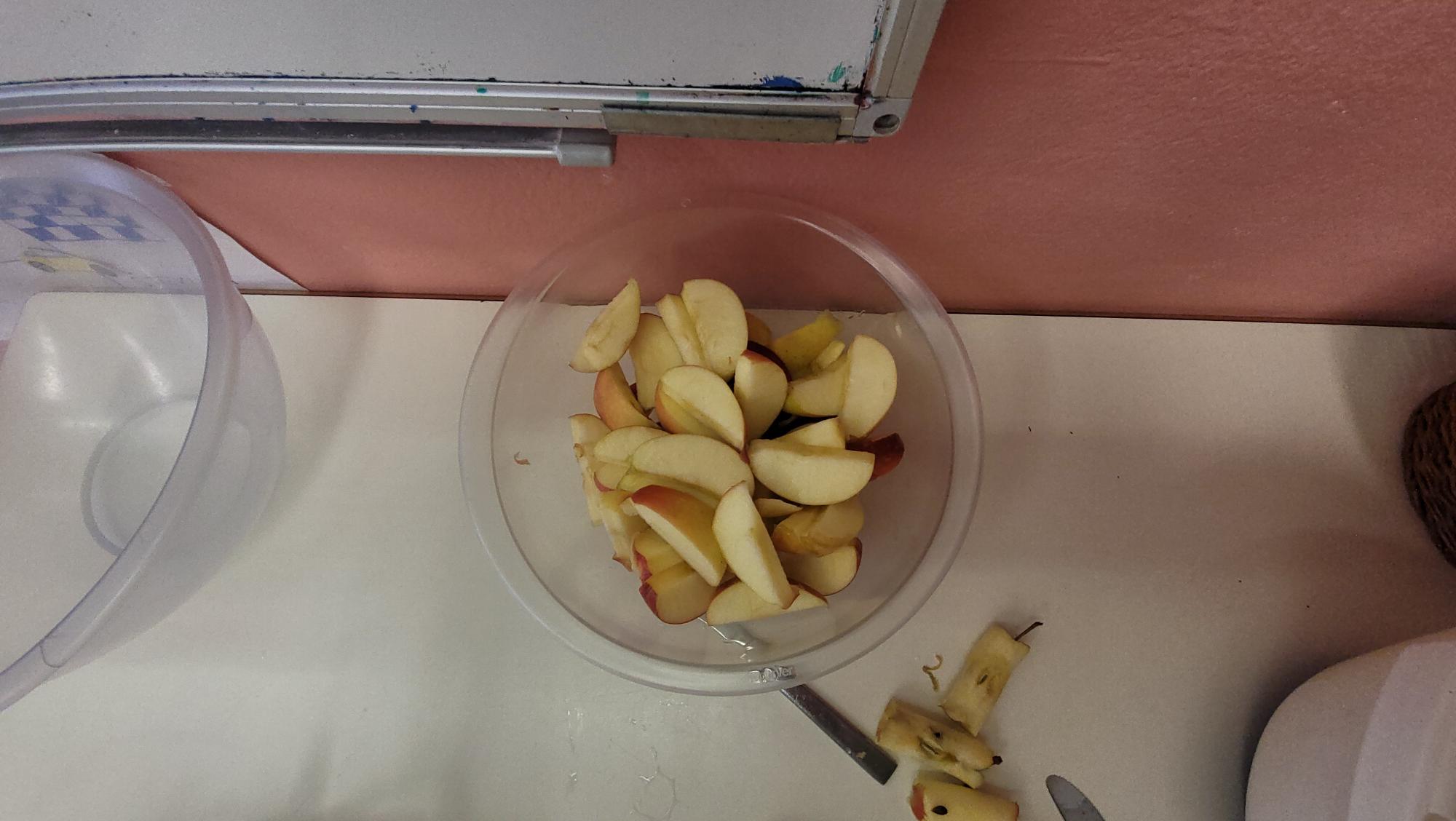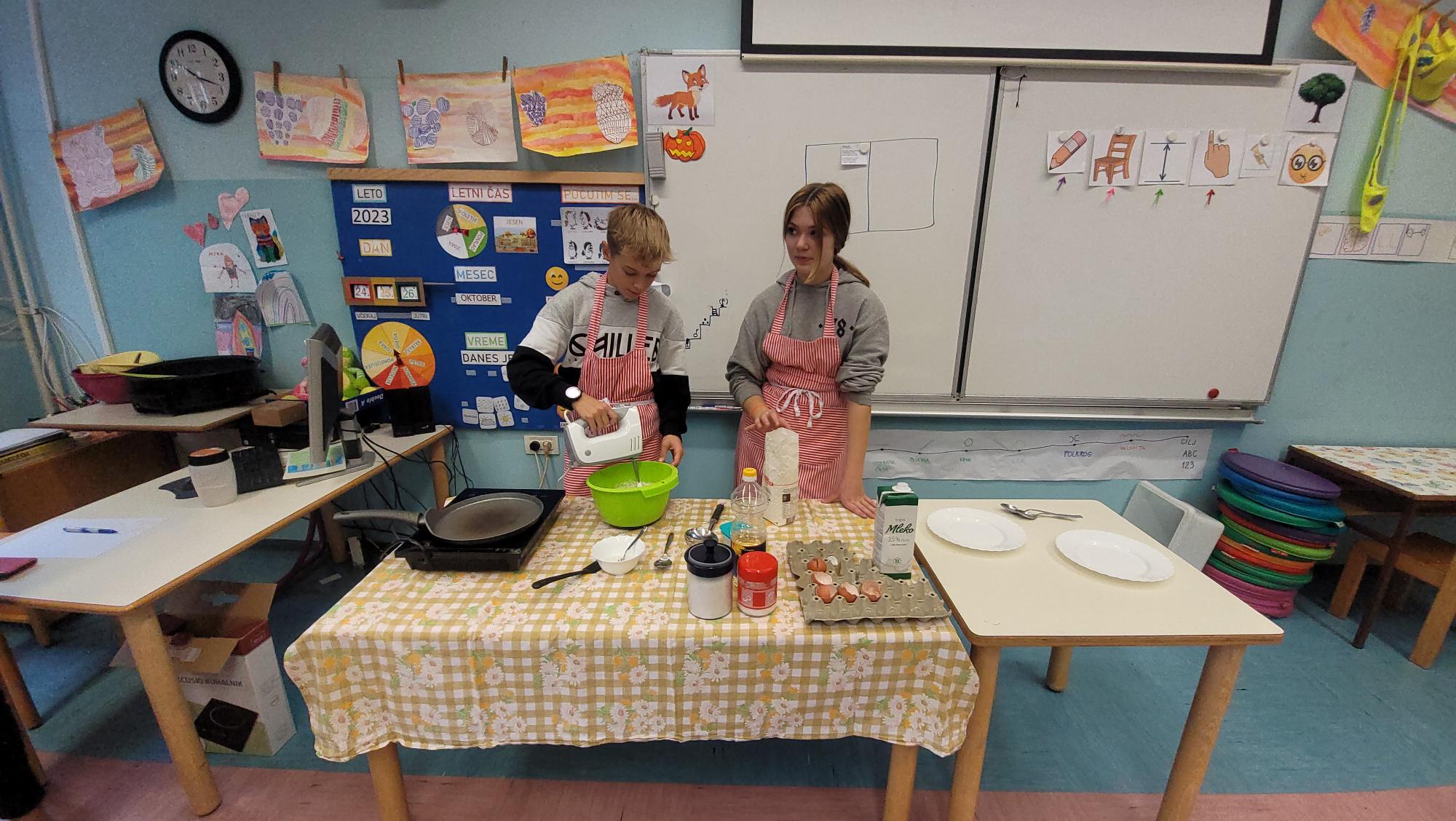 Tik pred jesenskimi počitnicami smo prvošolci zavihali rokave in si nadeli predpasnike ter pripravili slivovo marmelado in jabolčno čežano. Zjutraj smo pohiteli, razkoščičili slive, jih razrezali in dali v lonec. Nadaljevali smo z rezanjem jabolk, dodali smo še sladkor ter cimet in en, dva, tri - že diši! Res je prijetno dišalo iz naših učilnic. Ker pa vemo, da je na naši šoli veliko nadobudnih kuharjev, smo jih povabilii k sodelovanju. Nik, Gaja, Nej in Nina so za nas pripravili maso za palačinke in jih tudi spekli. Prvošolci smo pozorno in vztrajno opazovali ter priskočili na pomoč pri mazanju le-teh z našo marmelado. Med pripravo omenjenih dobrot smo se naučili pesmico Marmelada in na koncu dneva naredili še mini plakate. Aja, pozabili smo omeniti, da smo vse palačinke pojedli. In še prste obliznili.