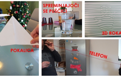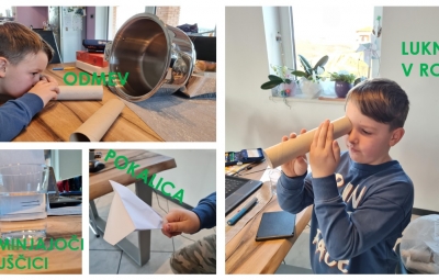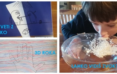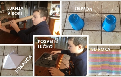 Rezervirali smo si dan, da s preizkušanjem »izvemo« kaj več o svetlobi in zvoku. Na razpolago smo imeli različne dejavnosti in možnosti izbire. Poigrali smo se s svetlobnim zajčkom, sencami, očesnimi prevarami, ugotavljali, če lahko zvok vidimo, spoznali govorico gluhih,… Izdelali smo nekatere izdelke ter jih preizkusili. To lahko vidite na naših fotografijah.