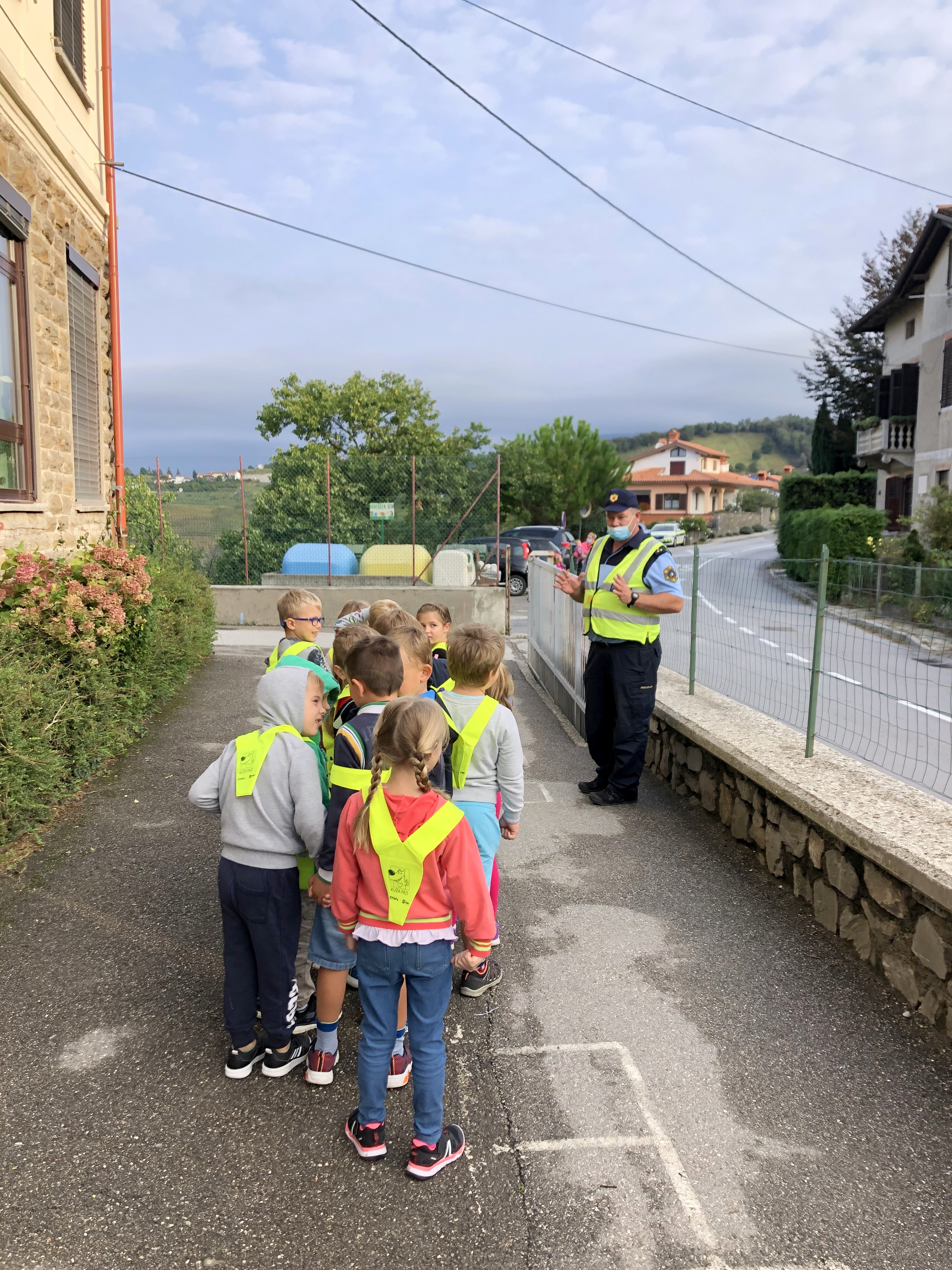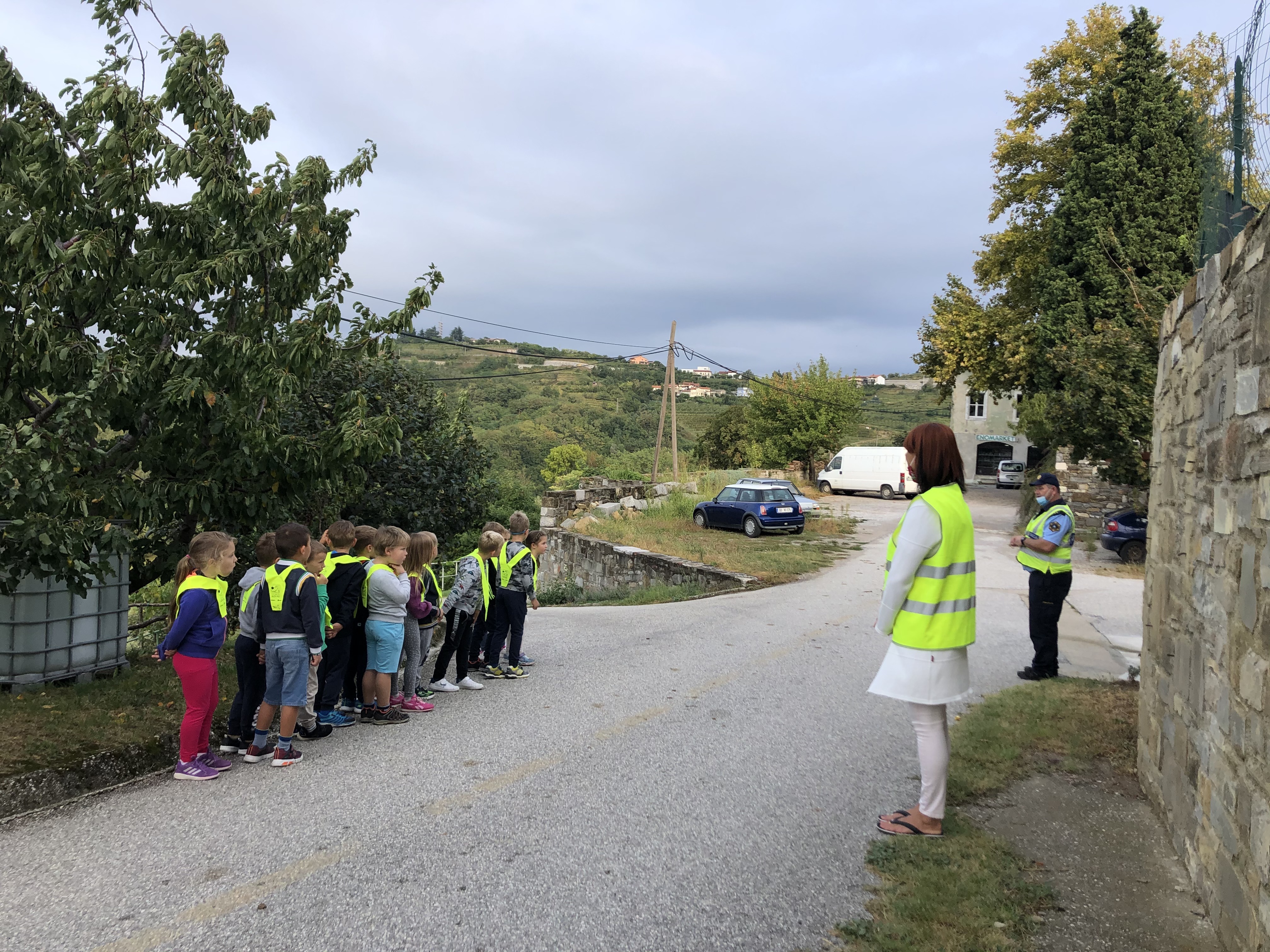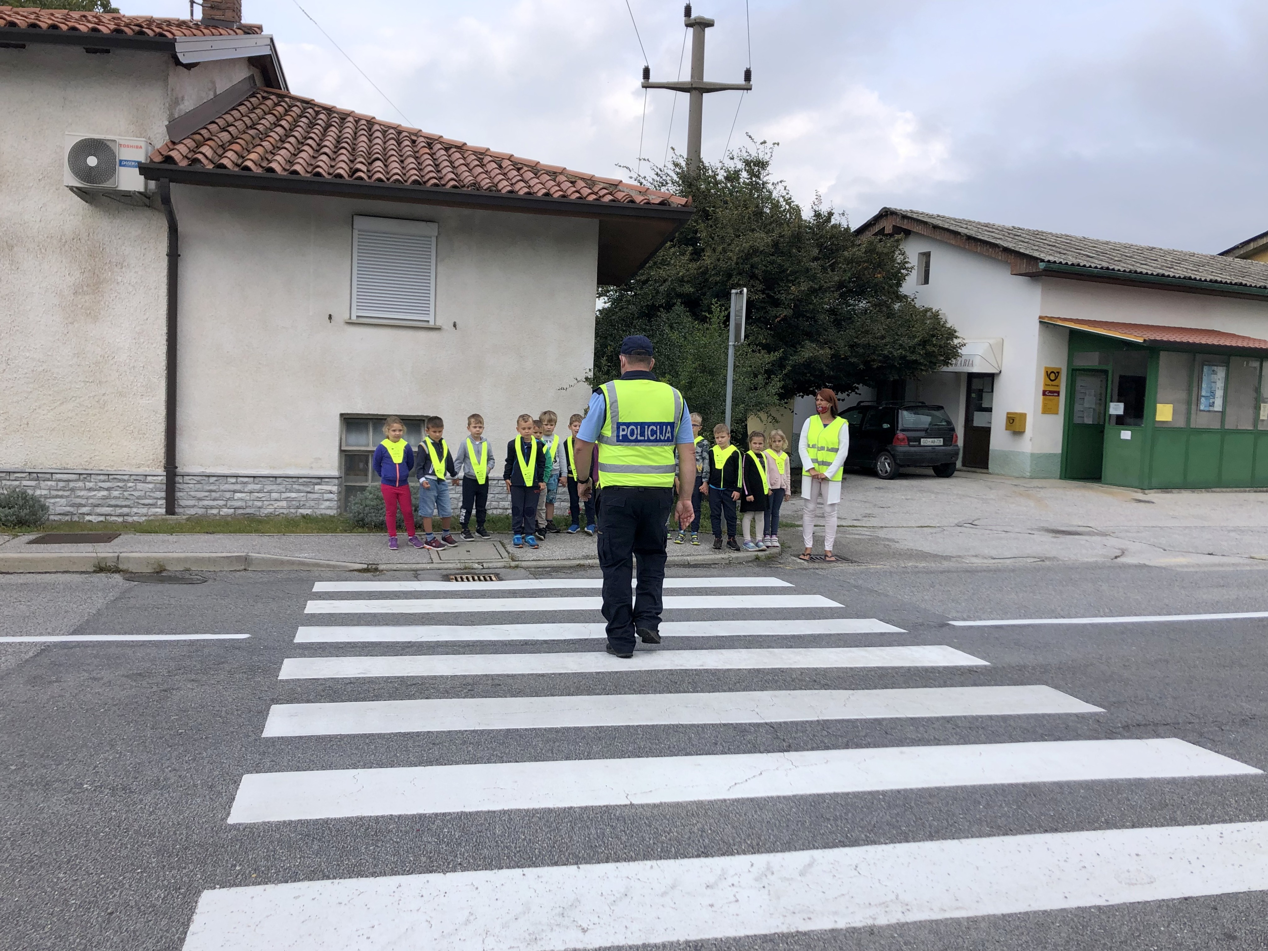 Danes je prvošolce obiskal policist s policijske postaje Nova Gorica. Pogovarjali smo se o prometni varnosti. Opozoril nas je na nevarnosti, ki prežijo na pešce in poudaril pravilno in varno obnašanje. Odpravili smo se tudi na učni sprehod v okolici šole, kjer je policist opozoril na nevarne odseke na poti v šolo in ponazoril pravilno prečkanje ceste. Nato smo se tudi sami večkrat preizkusili v prečkanju prehoda za pešce. Naučili smo se, da moramo biti v prometu zelo previdni ter za svojo vidnost vsak dan nositi rumeno rutico.