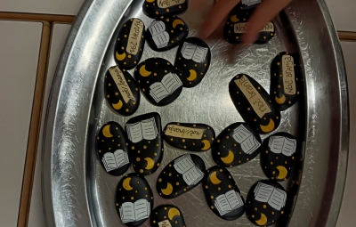 Ob 17. uri smo se zbrali v jedilnici, kjer smo se ob rogljičkih in soku seznanili s temo in potekom večera. Na letošnjo Noč branja smo povabili bivšo učenko naše šole, Gajo Velušček, študentko krajinske arhitekture, ki pa je nadarjena in ustvarjalna tako na literarnem kot likovnem področju. Med drugim je ilustrirala slikanico Avtobus za zaspance Alana Marca, prav tako Brica in našega bivšega učenca.