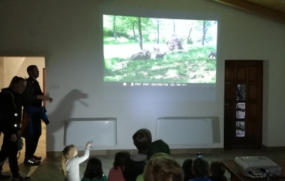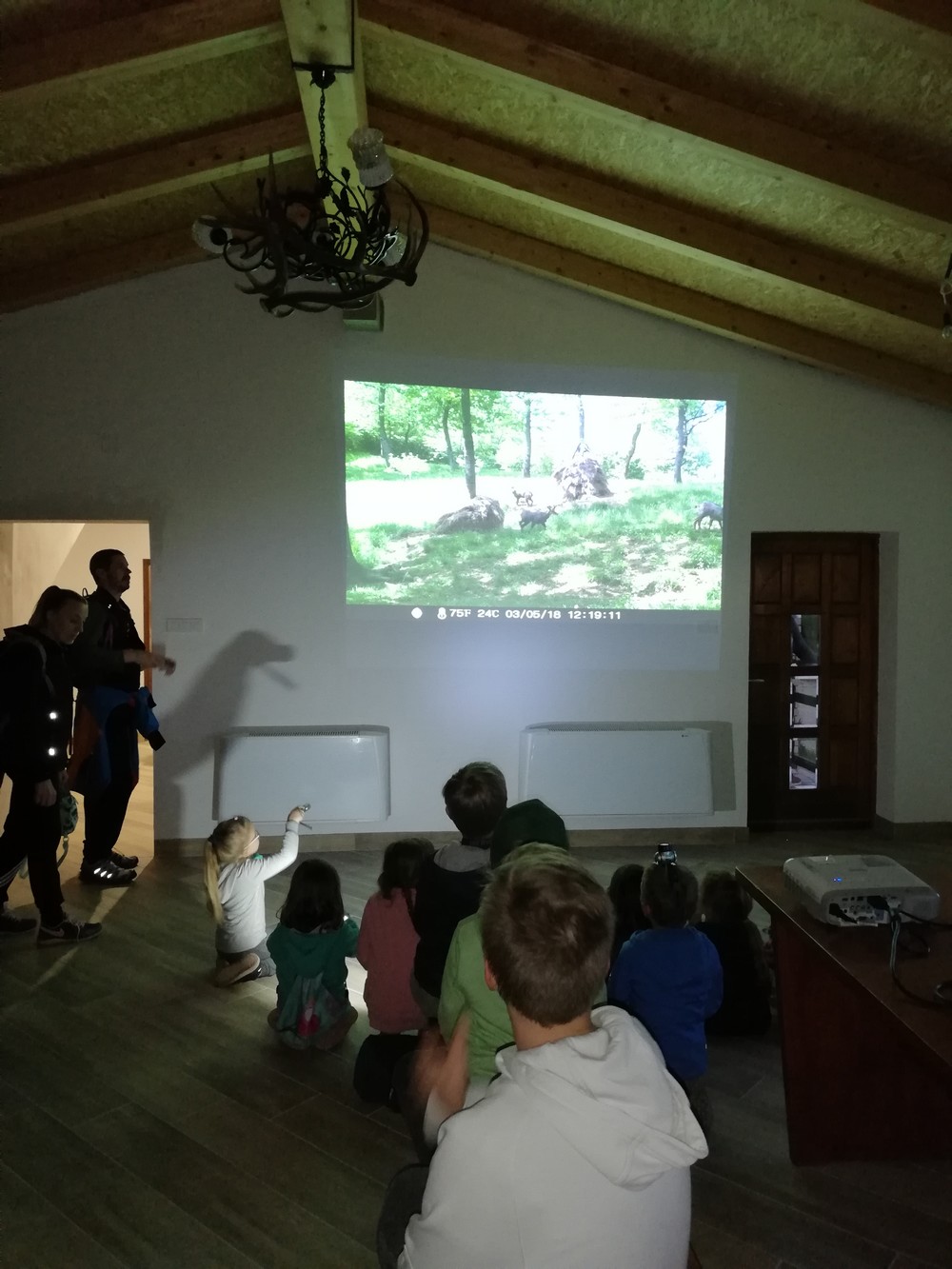 Pri lovski koči nas je čakal lovec Danilo, ki nas je pogostil z lovskim čajem in nam pokazal fotografije in posnetke različnih divjih živali. Poleg srnjadi, zajčkov, jazbeca, lisice in divjih prašičev smo videli tudi volka, ki ga je kamera ujela na Sabotinu.