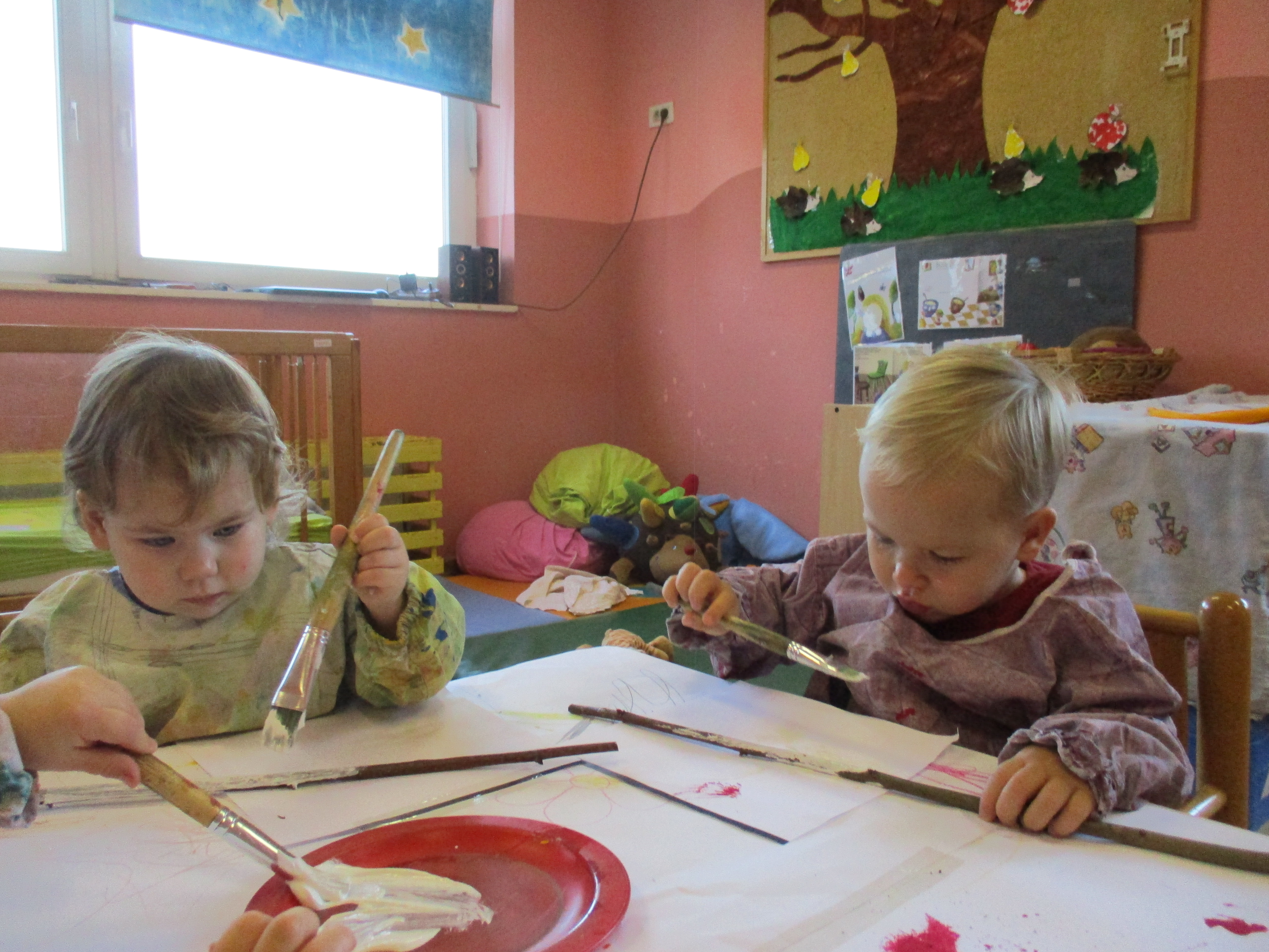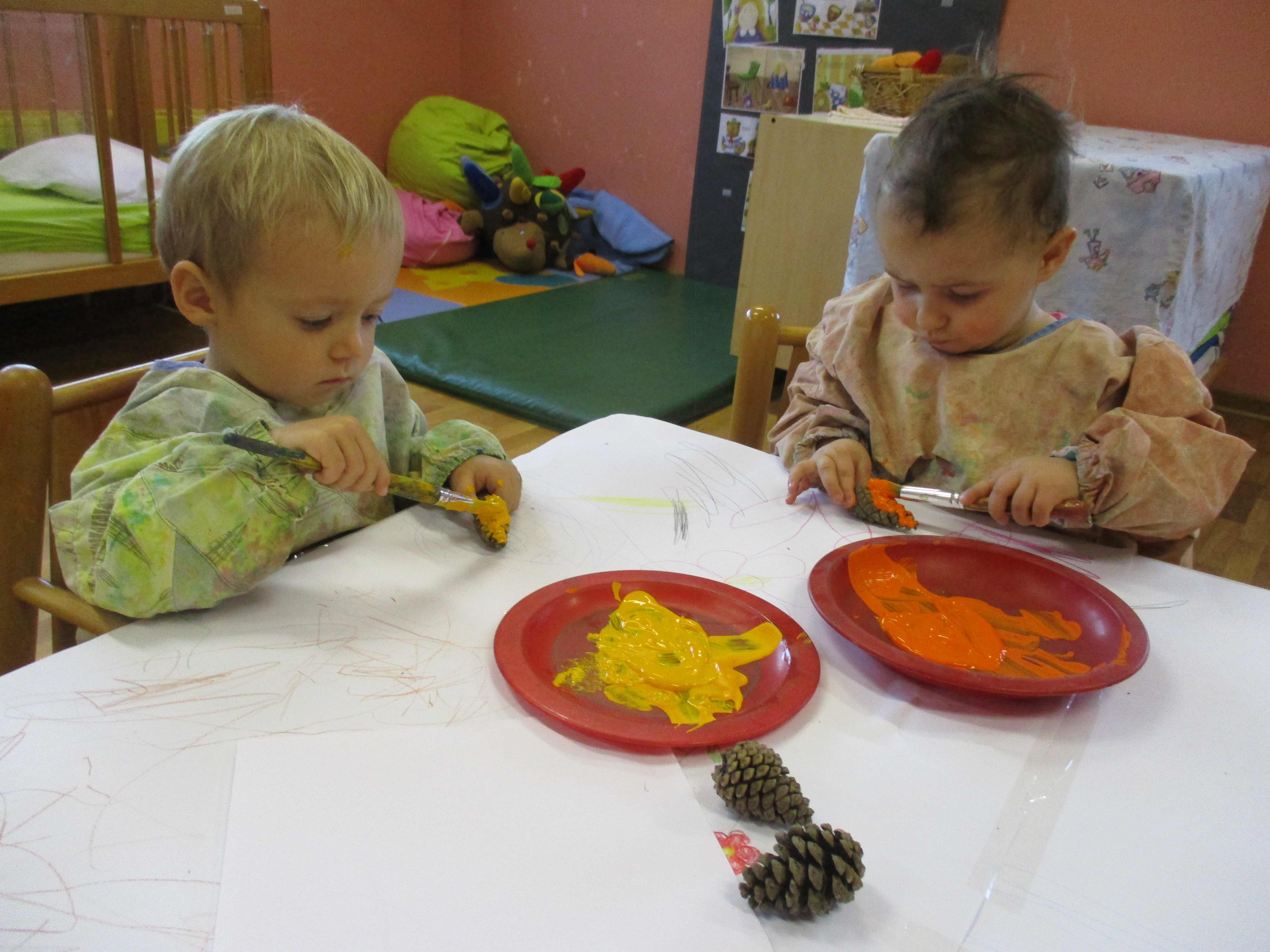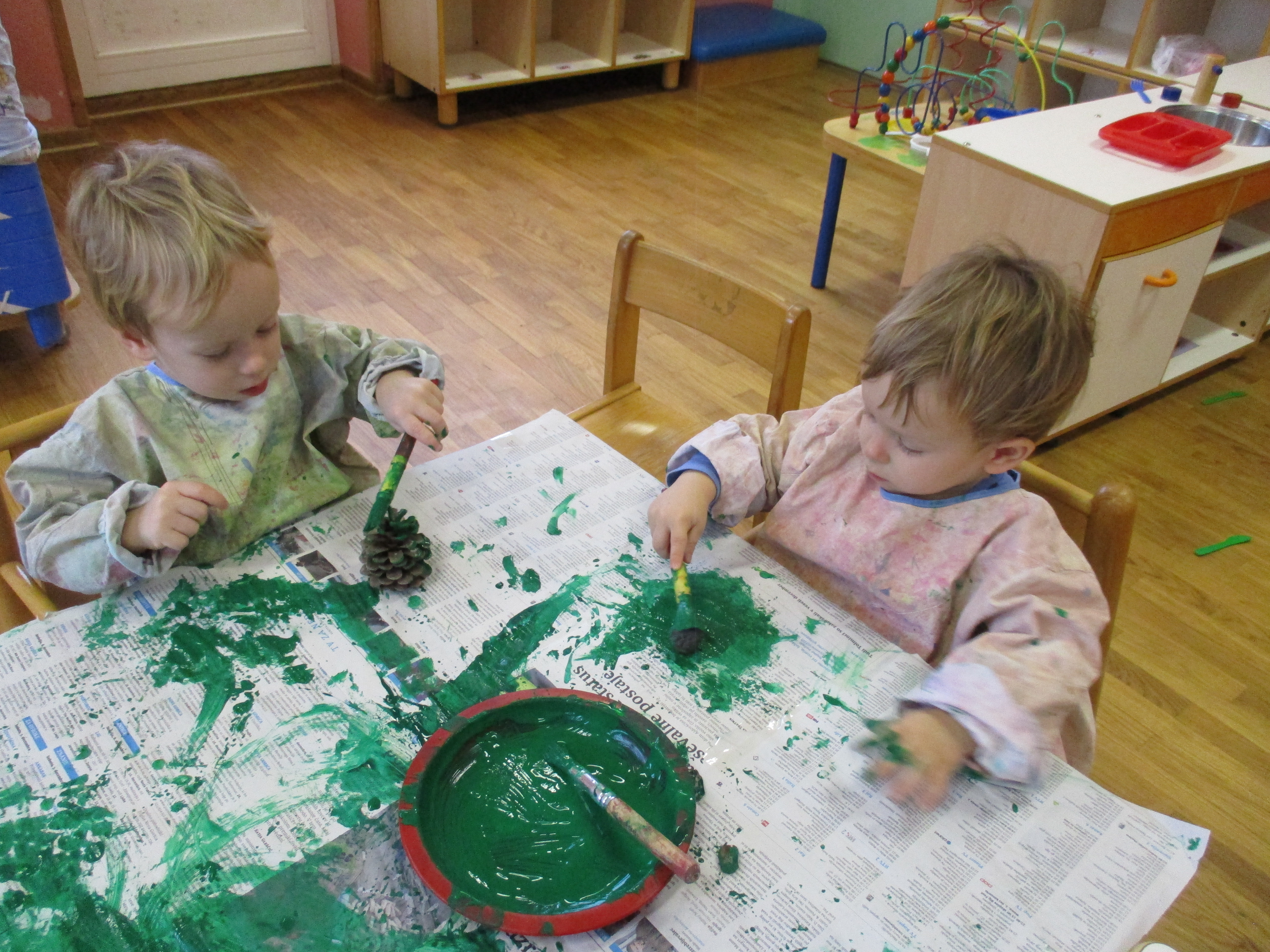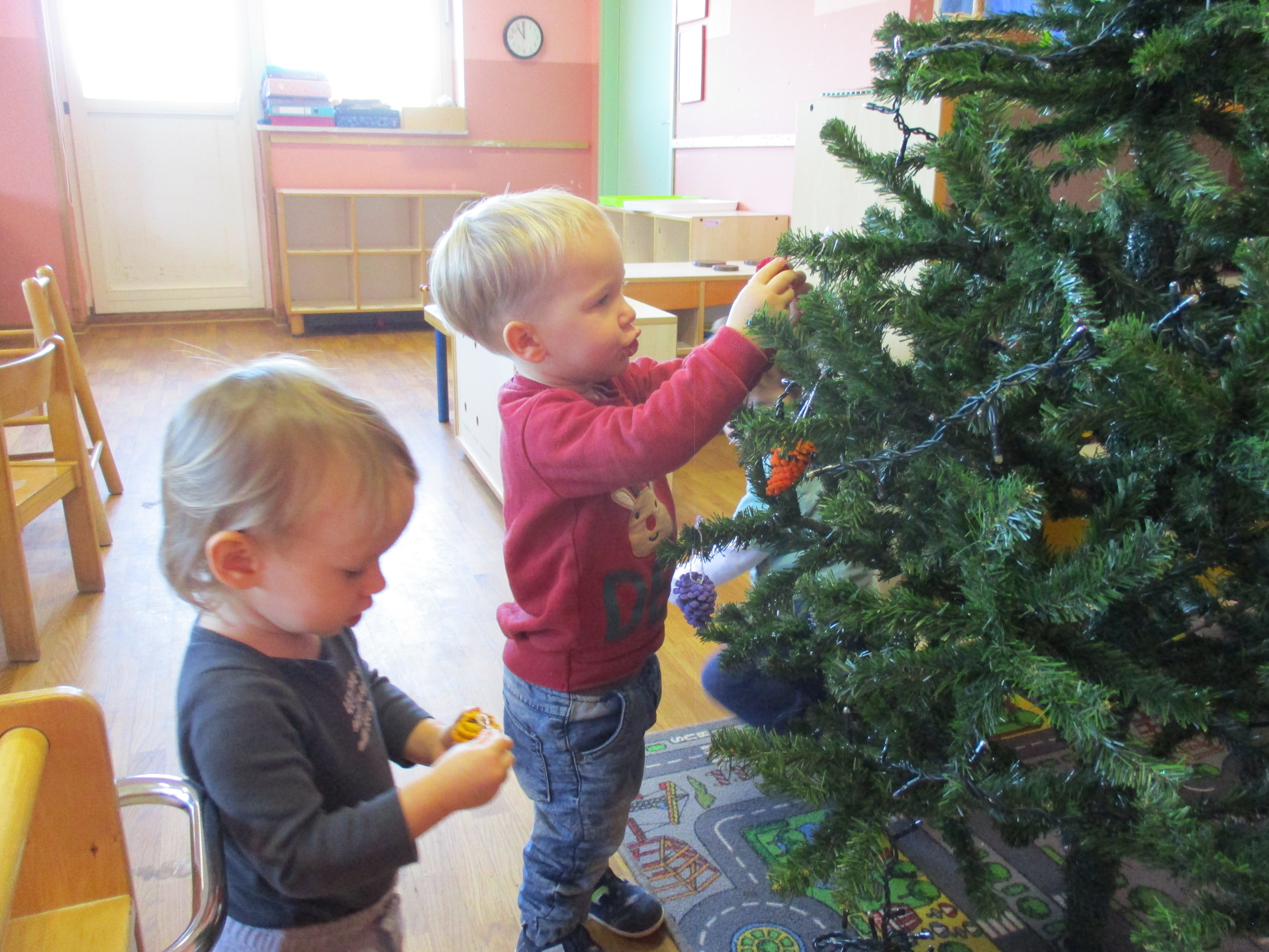 V mesecu decembru smo barvali storže in veje, ter tako okrasili novoletno smrečico in igralnico.