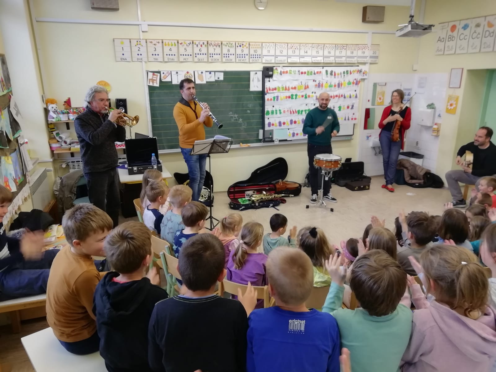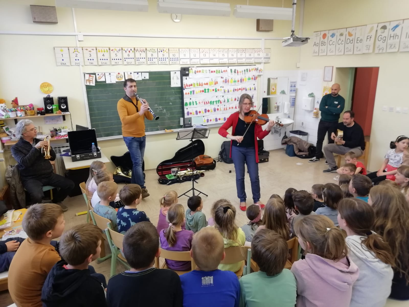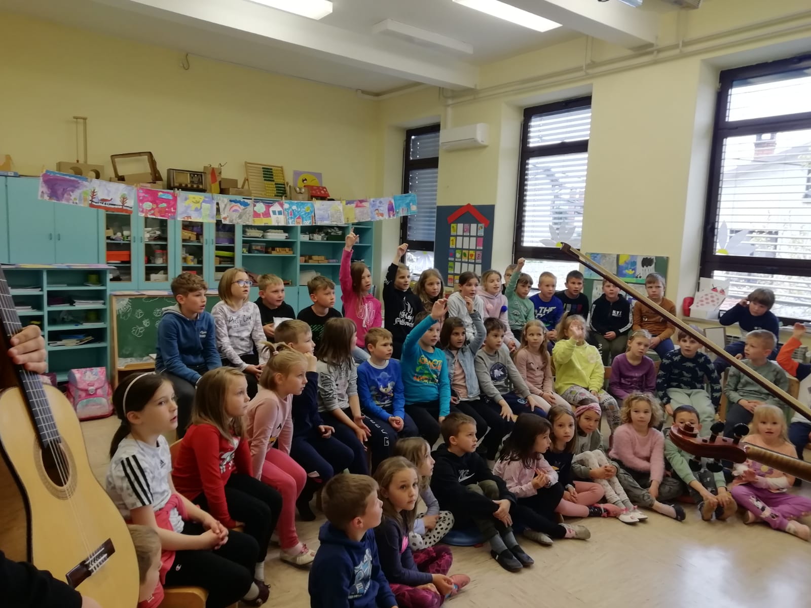 Za učenci prve triade je nekoliko drugačen dan. V goste so prišli učitelji iz glasbene šole Nova Gorica. Pripravili so nam glasbeni program, v katerem smo spoznali različna glasbila ter prisluhnili glasbi. Nekateri izmed nas že pridno obiskujejo glasbeno šolo, v nekaterih pa se je prav danes zbudilo zanimanje za enega od prikazanih instrumentov.
