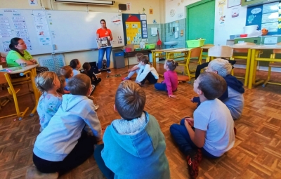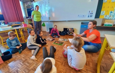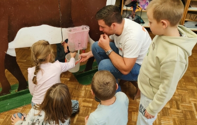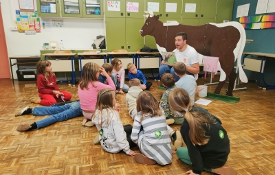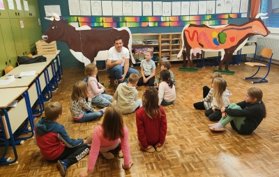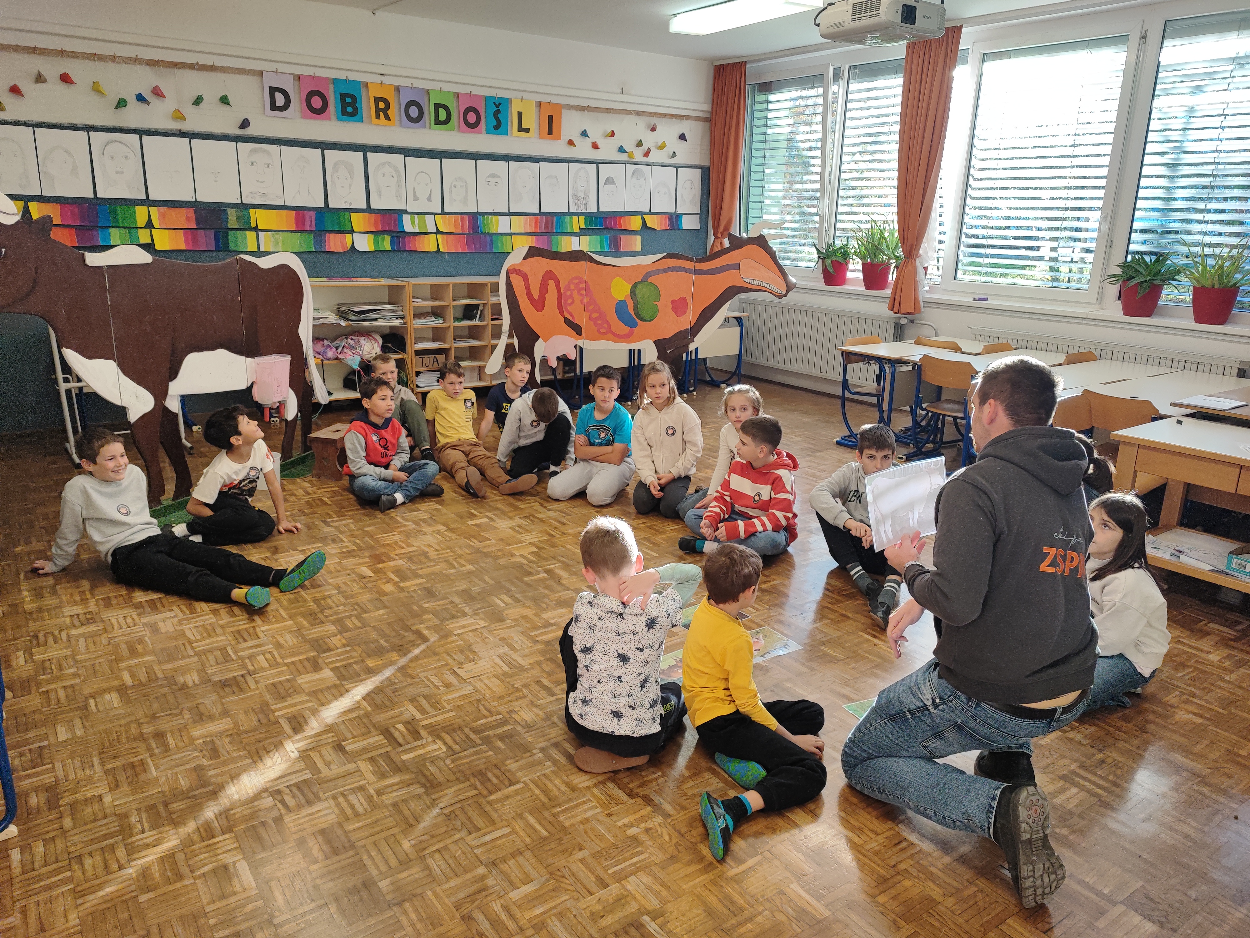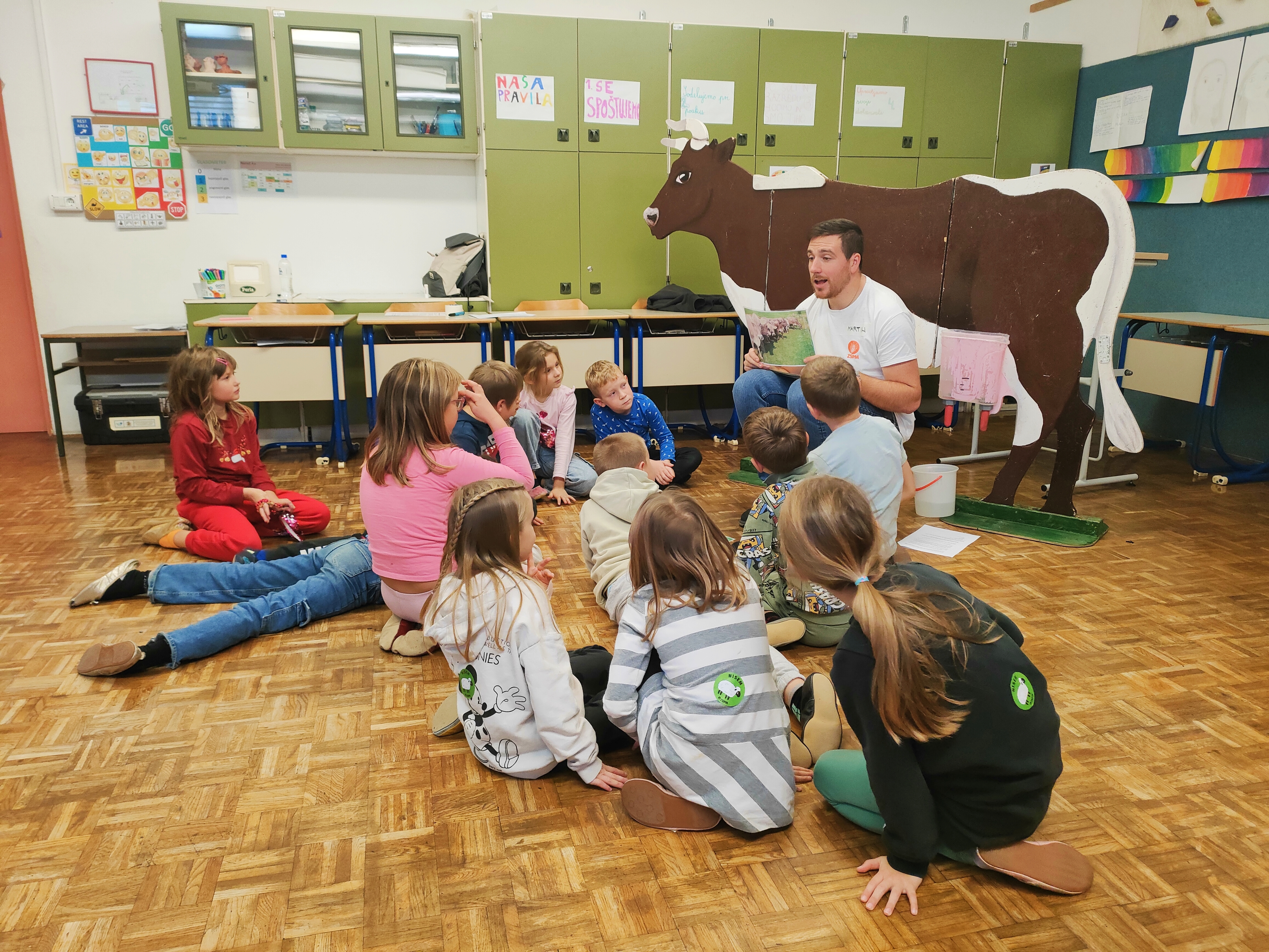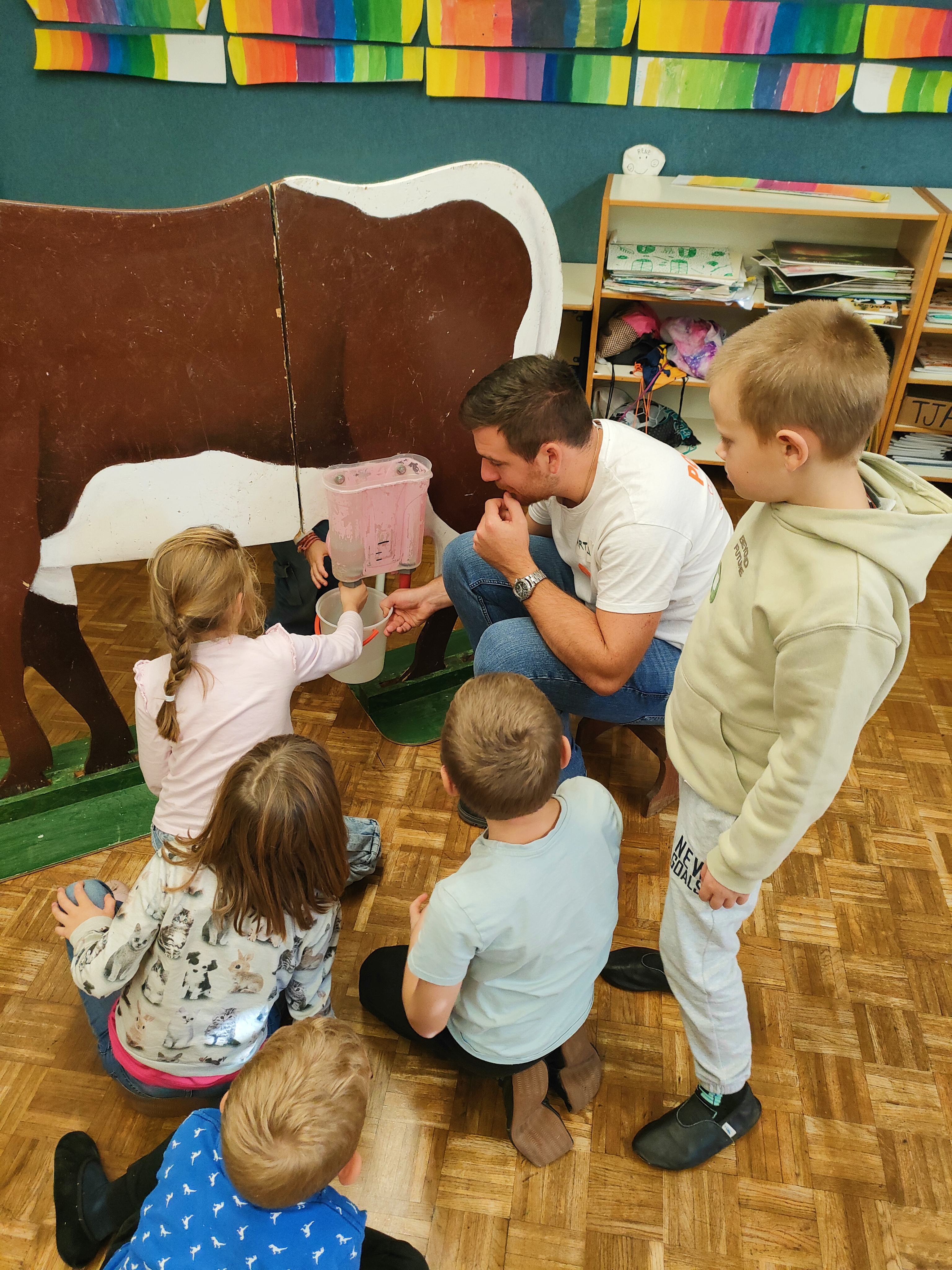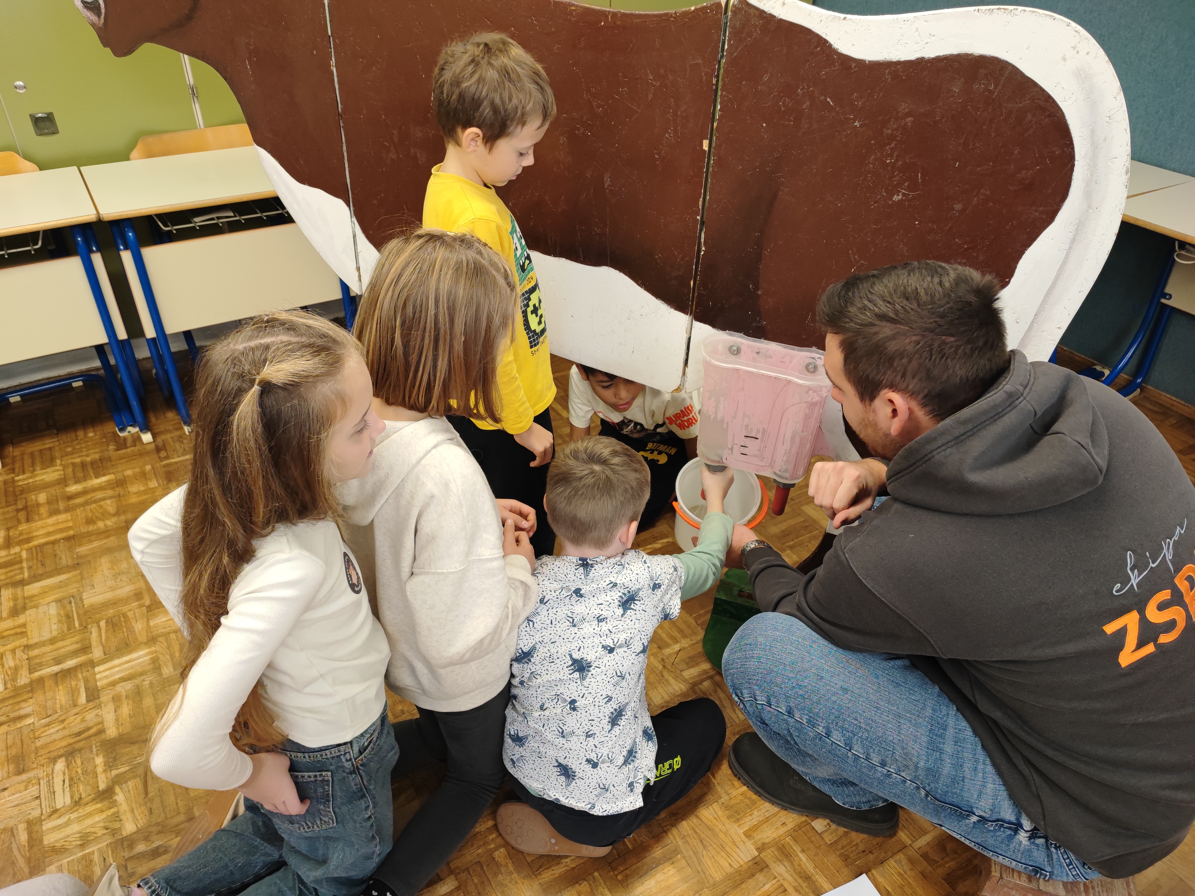 Gostje so s seboj prinesli maketo krave, na kateri so se lahko učenci preizkusili v molži. Na zanimiv in izkustven način so spoznali, kako poteka molža, ter izvedeli, kako mleko od kmetije potuje vse do naših trgovskih polic.