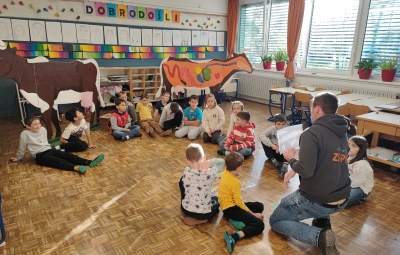 V torek smo v okviru tedna slovenske hrane v 2. in 3. razredu gostili predstavnike Zveze slovenske podeželske mladine (ZSPM). Ker v tem teden praznujemo slovenski tradicionalni zajtrk, so učencem predstavili eno izmed njegovih najpomembnejših sestavin – mleko.