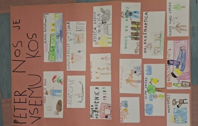 Osrednja tema letošnjega projekta Mesec pisanja z roko se je glasila "Humor je najboljše črnilo". V oddelku OPB 2 smo se v okviru dejavnosti seznanili z literarnim likom Petra Nosa, čigar zabavne dogodivščine so pri učencih vzbudile smeh in prispevale k dobremu razpoloženju. Ob tem smo spoznali tudi humorno pesem o Petru Nosu, fantu, ki se z lahkoto sooča z različnimi izzivi. Učenci so zapisovali naslove kratkih zgodb, jih likovno upodabljali ter z levo oziroma desno roko prepisali izbrani del pesmi.