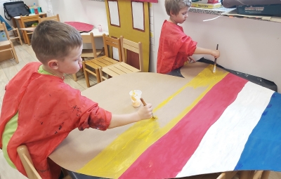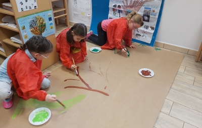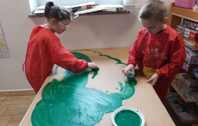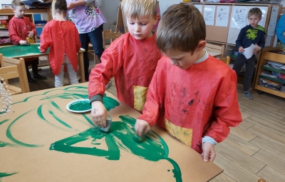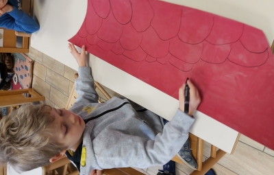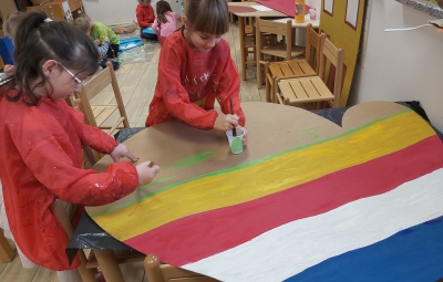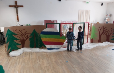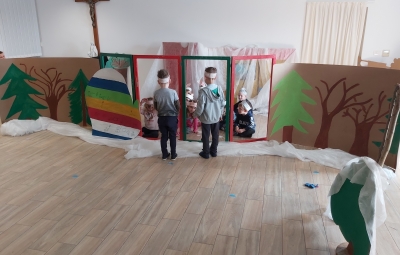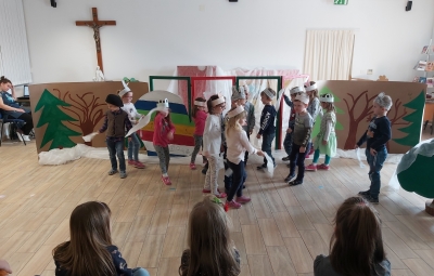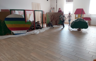 V skupini Želve, smo se po prebrani pravljici Rokavička odločili, da bi naredili plesno dramatizacijo zgodbe. Otroci so si izbrali vloge, aktivno sodelovali pri izdelavi scene in celotne predstave.