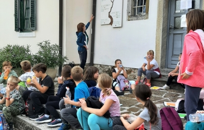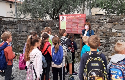 Za prvi kulturni dan »Knjižnica pod krošnjami«, smo se tretješolci peš odpravili po Gradnikovi učni poti. Ustavljali smo se pri informacijskih tablah, kjer smo veliko zanimivega izvedeli o tipičnih briških drevesih in vinski trti. Pot nas je vodila mimo pokopališča, ustavili smo se pred Gradnikovo domačijo in pred rojstno hišo, kjer smo se seznanili z zanimivostmi iz pesnikovega življenja. Najpogumnejši so deklamirali Gradnikove pesmi iz pesniške zbirke za otroke Narobe svet.