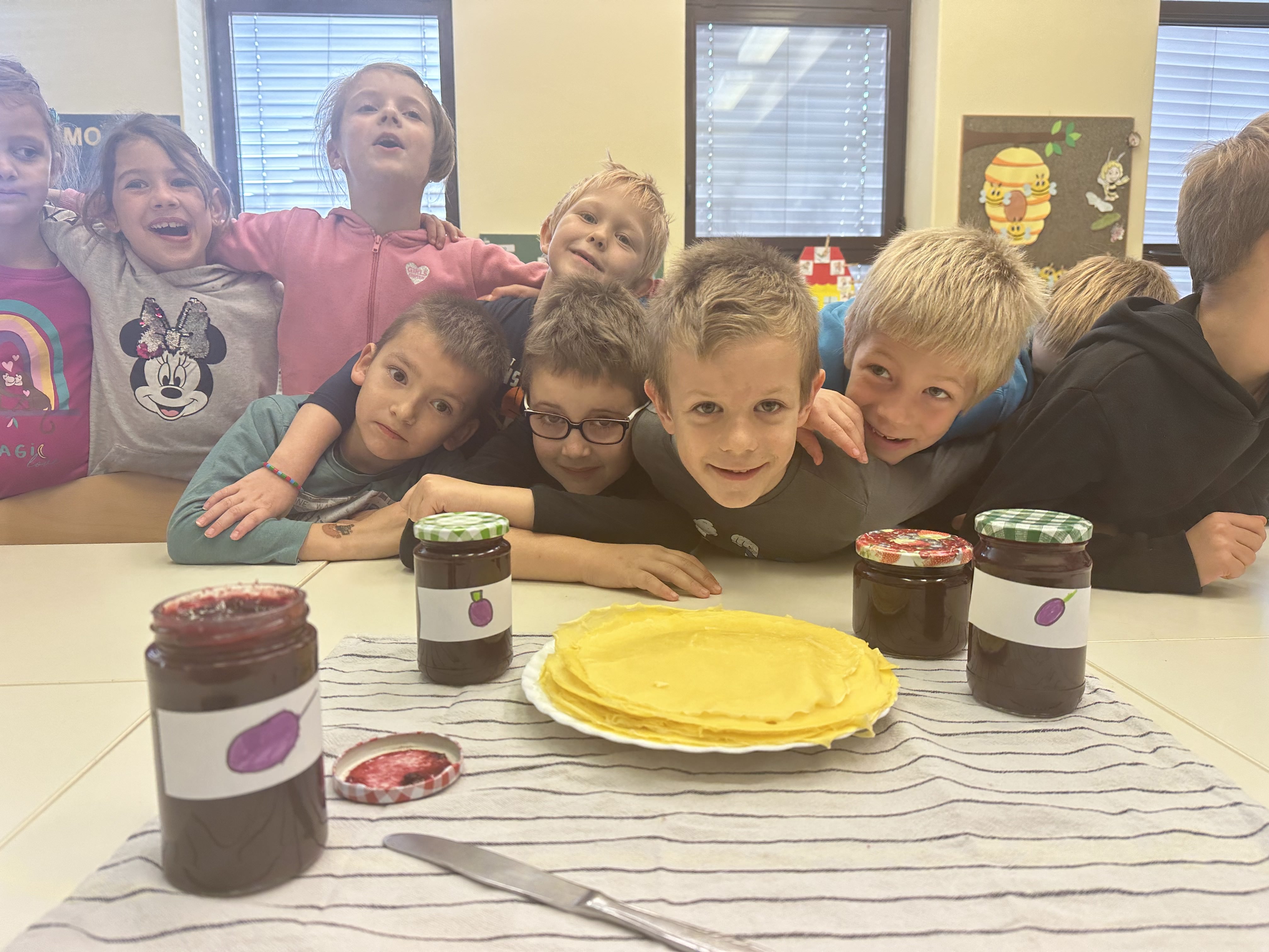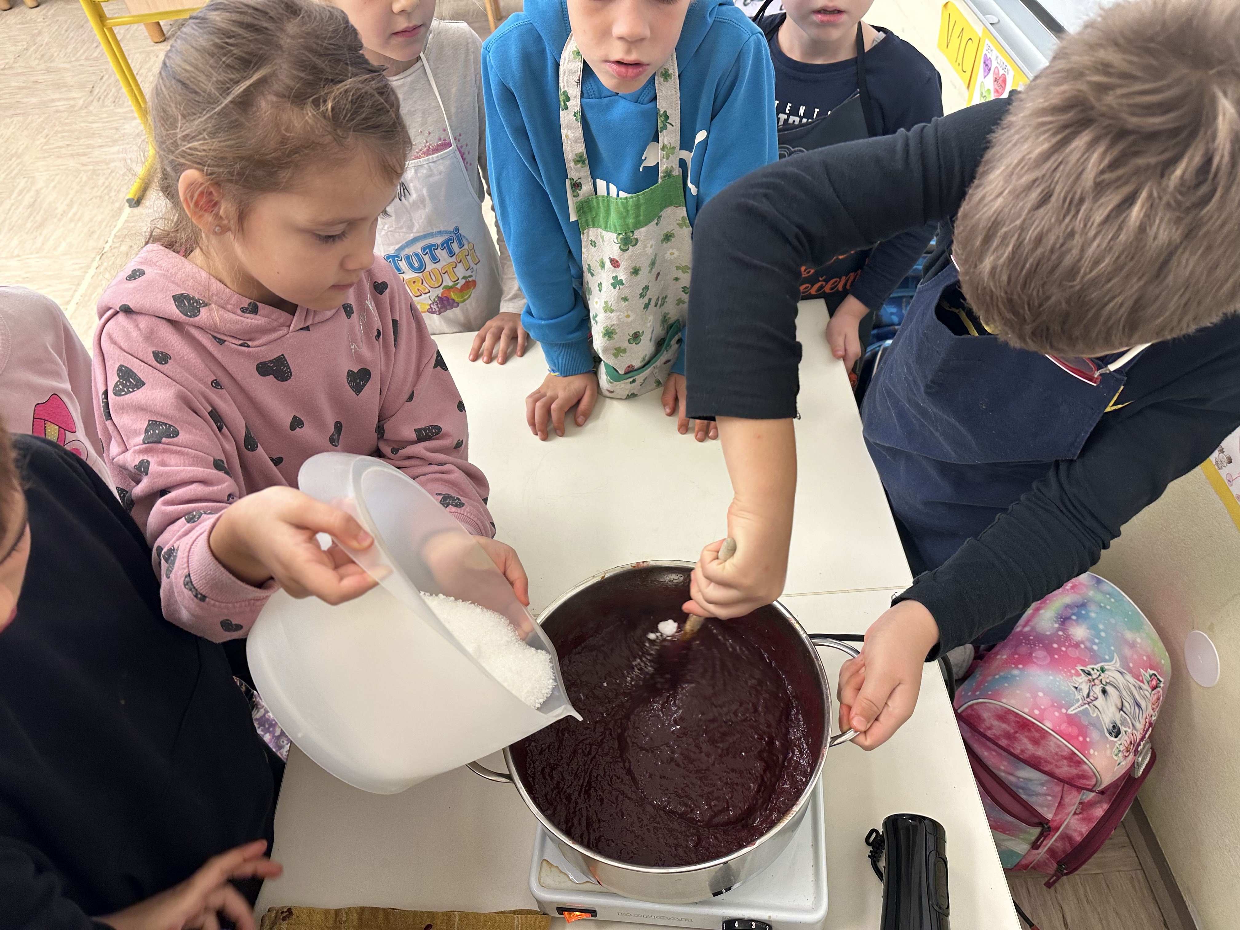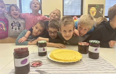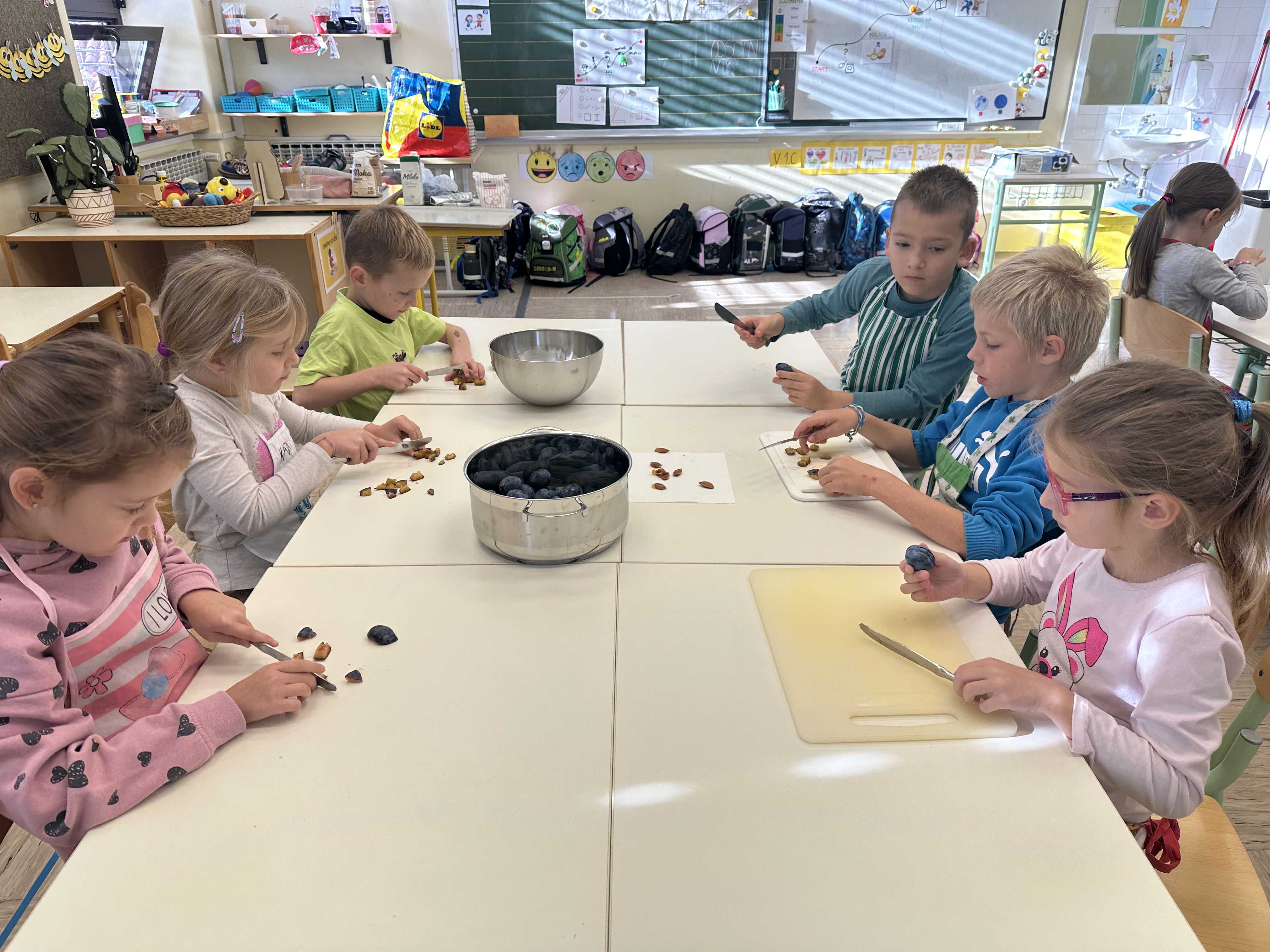 Prvošolci smo imeli prav poseben naravoslovni dan. Podali smo se "po poteh do marmelade". Najprej smo uporabili veščino sodelovanja in v skupinah ugotavljali kako marmelada sploh nastane. Ko smo prišli do pravilne rešitve, smo zavihali rokave ter začeli z delom. Skupaj smo pripravili slivovo in hruškovo marmelado, ki smo jo na koncu preizkusili na sveže pečenih palačinkah. Za pomoč smo pri pripravi palačink prosili sedmošolce, ki so se z veseljem odzvali. Bilo je zabavno, poučno in zelo slastno.