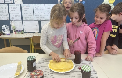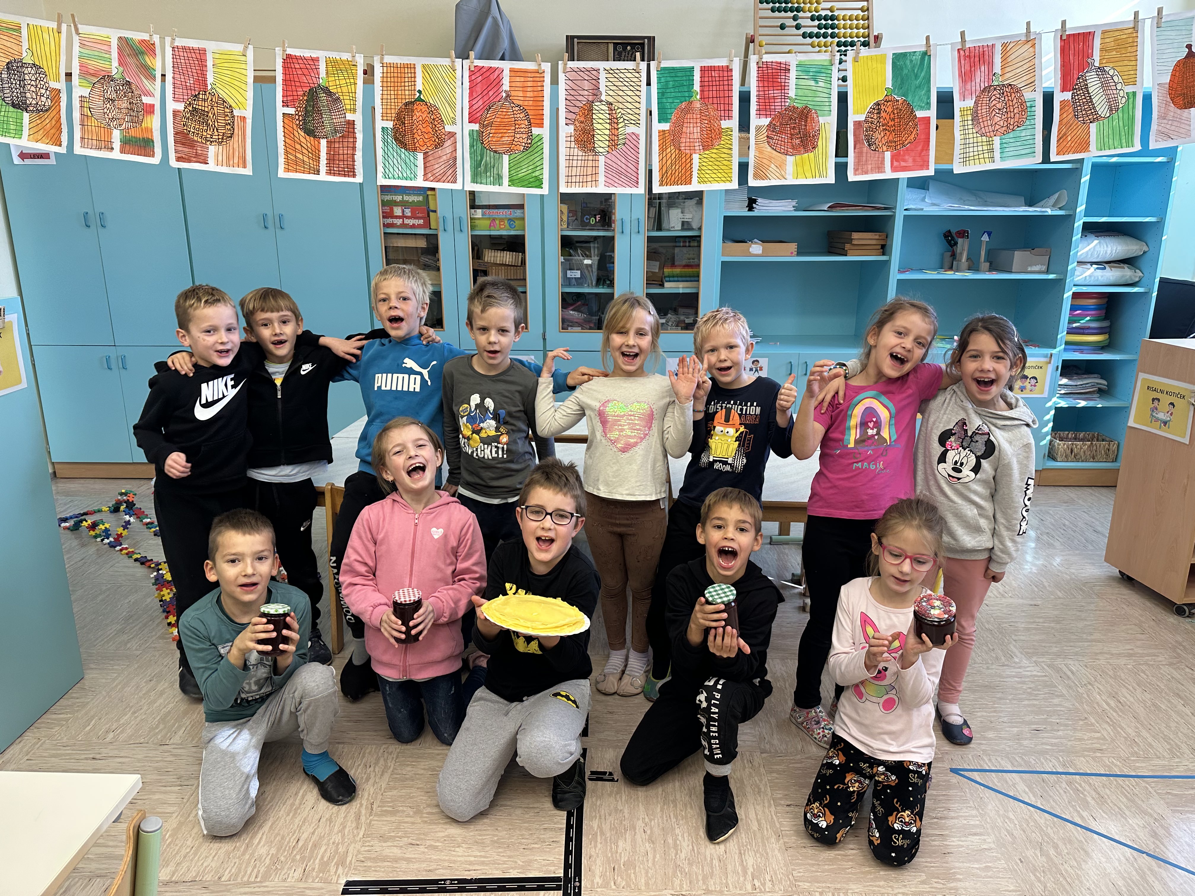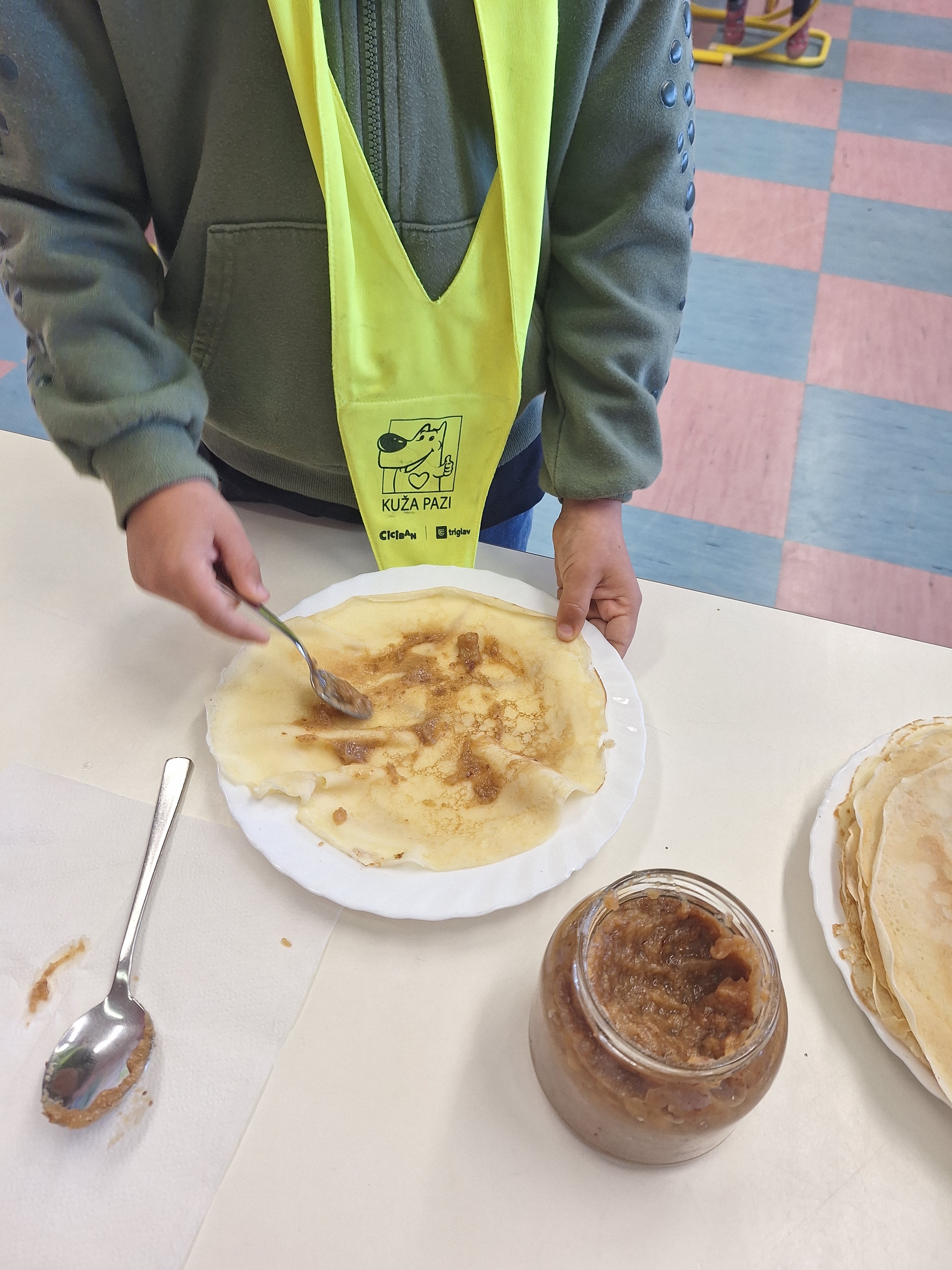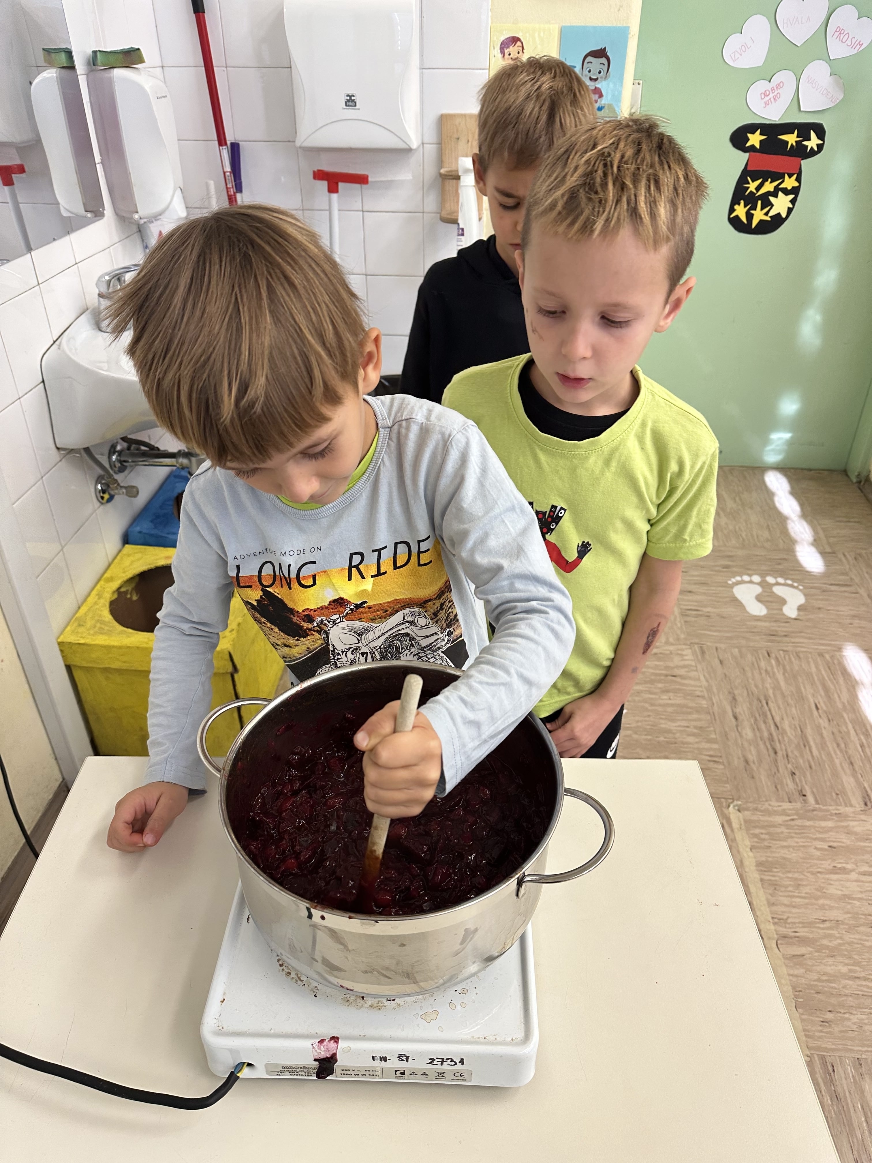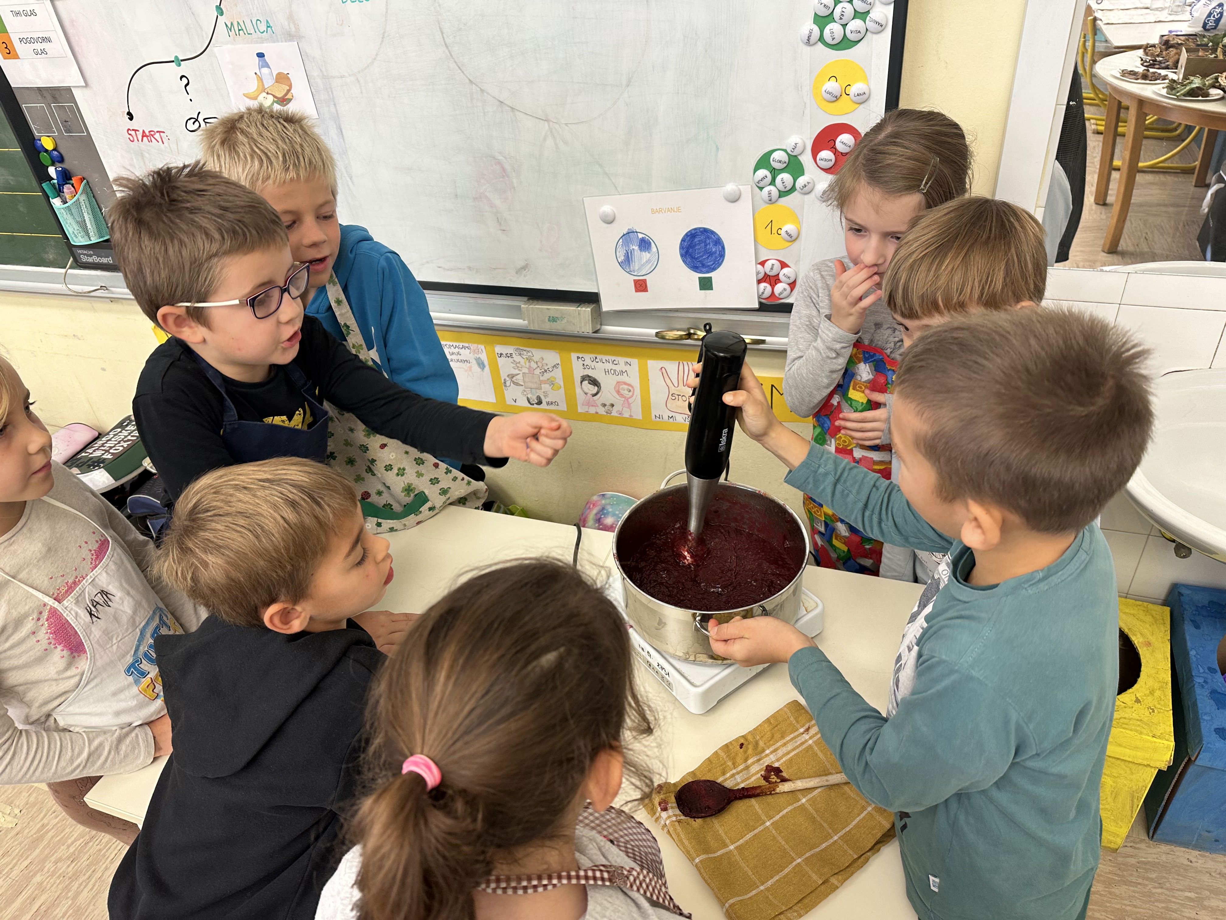 Prvošolci smo imeli prav poseben naravoslovni dan. Podali smo se "po poteh do marmelade". Najprej smo uporabili veščino sodelovanja in v skupinah ugotavljali kako marmelada sploh nastane. Ko smo prišli do pravilne rešitve, smo zavihali rokave ter začeli z delom. Skupaj smo pripravili slivovo in hruškovo marmelado, ki smo jo na koncu preizkusili na sveže pečenih palačinkah. Za pomoč smo pri pripravi palačink prosili sedmošolce, ki so se z veseljem odzvali. Bilo je zabavno, poučno in zelo slastno.