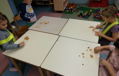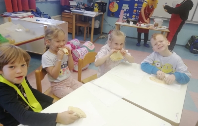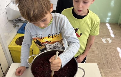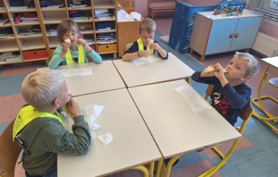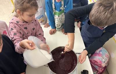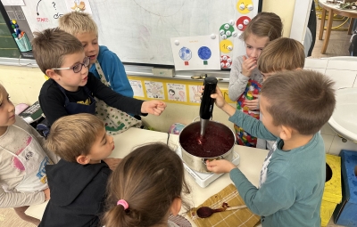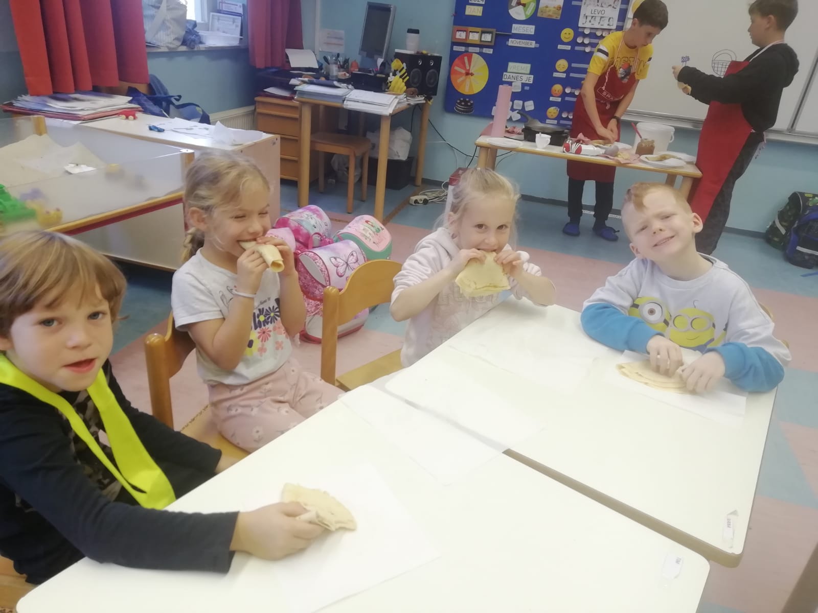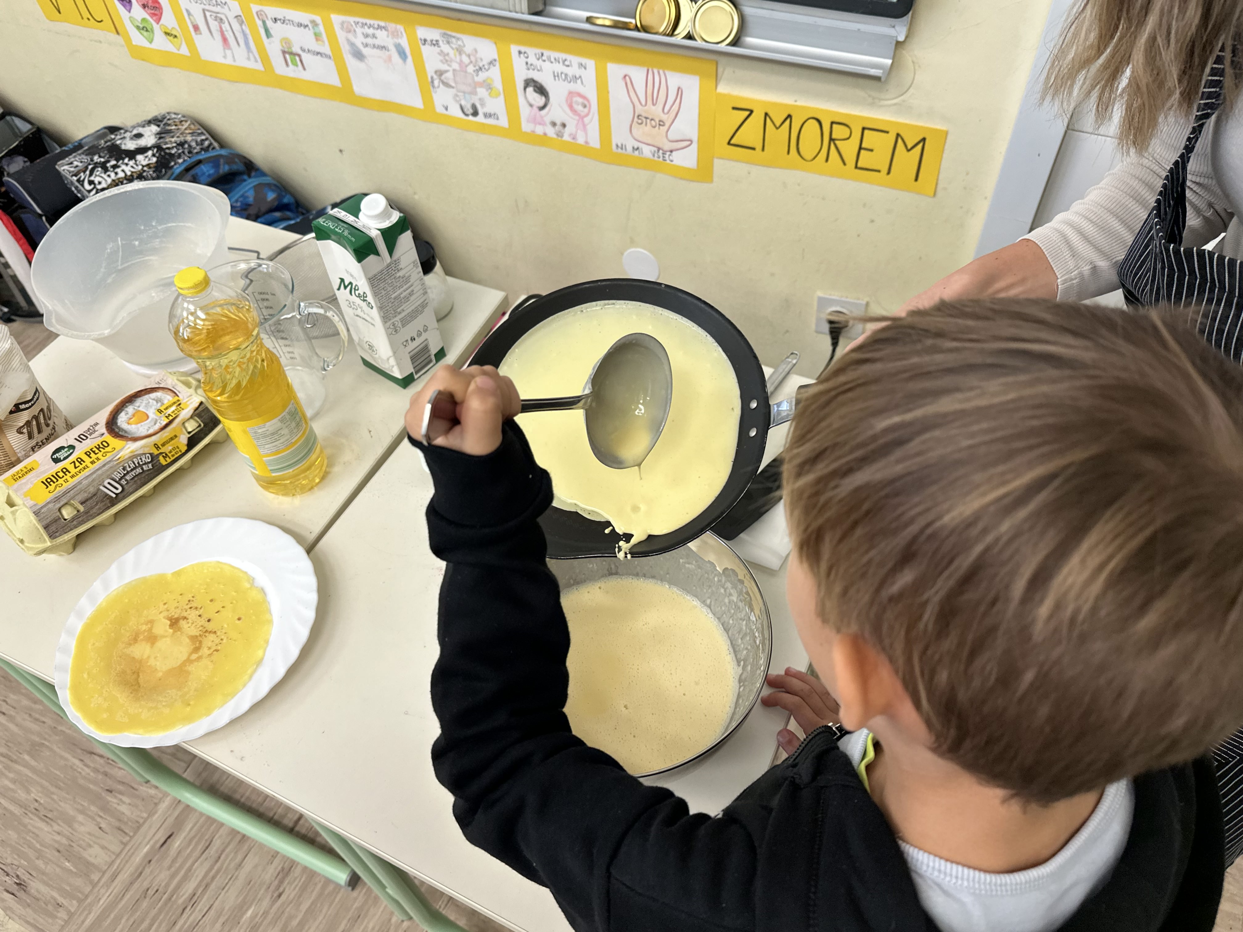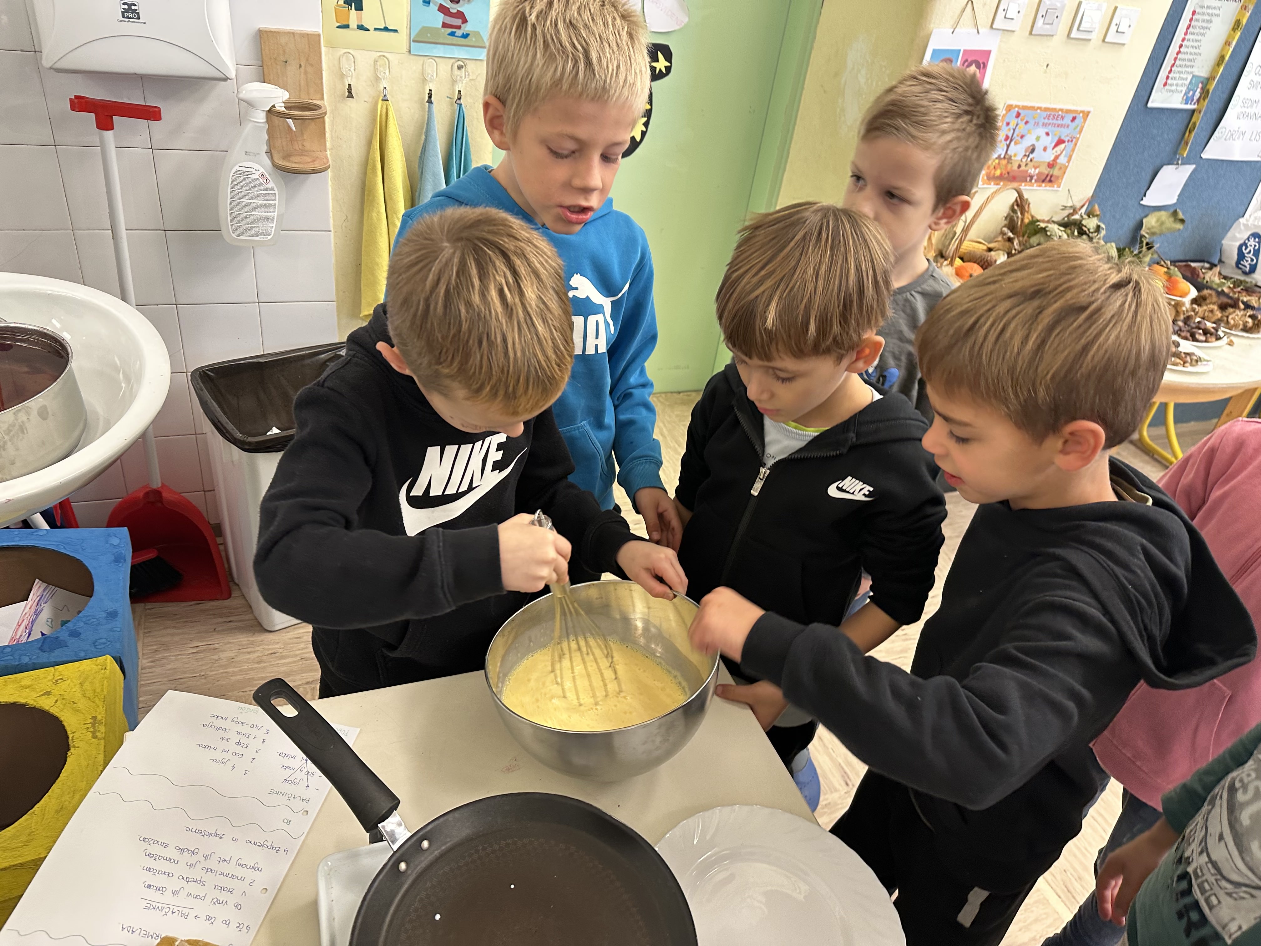 Prvošolci smo imeli prav poseben naravoslovni dan. Podali smo se "po poteh do marmelade". Najprej smo uporabili veščino sodelovanja in v skupinah ugotavljali kako marmelada sploh nastane. Ko smo prišli do pravilne rešitve, smo zavihali rokave ter začeli z delom. Skupaj smo pripravili slivovo in hruškovo marmelado, ki smo jo na koncu preizkusili na sveže pečenih palačinkah. Za pomoč smo pri pripravi palačink prosili sedmošolce, ki so se z veseljem odzvali. Bilo je zabavno, poučno in zelo slastno.