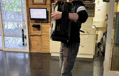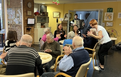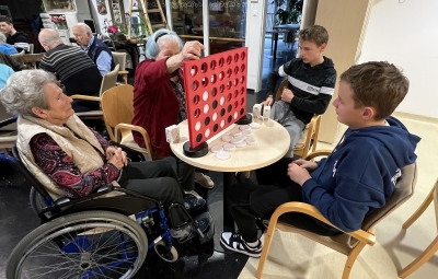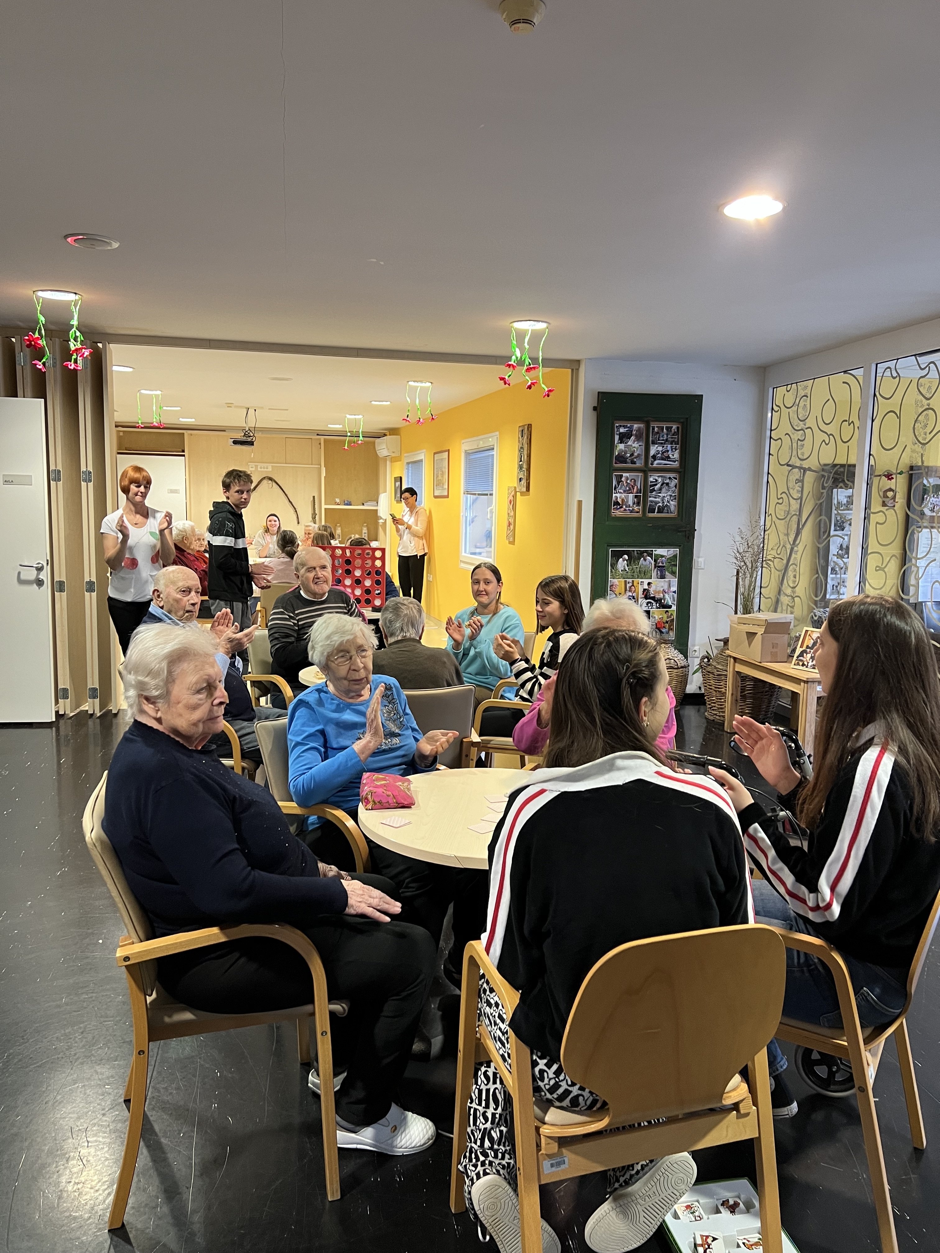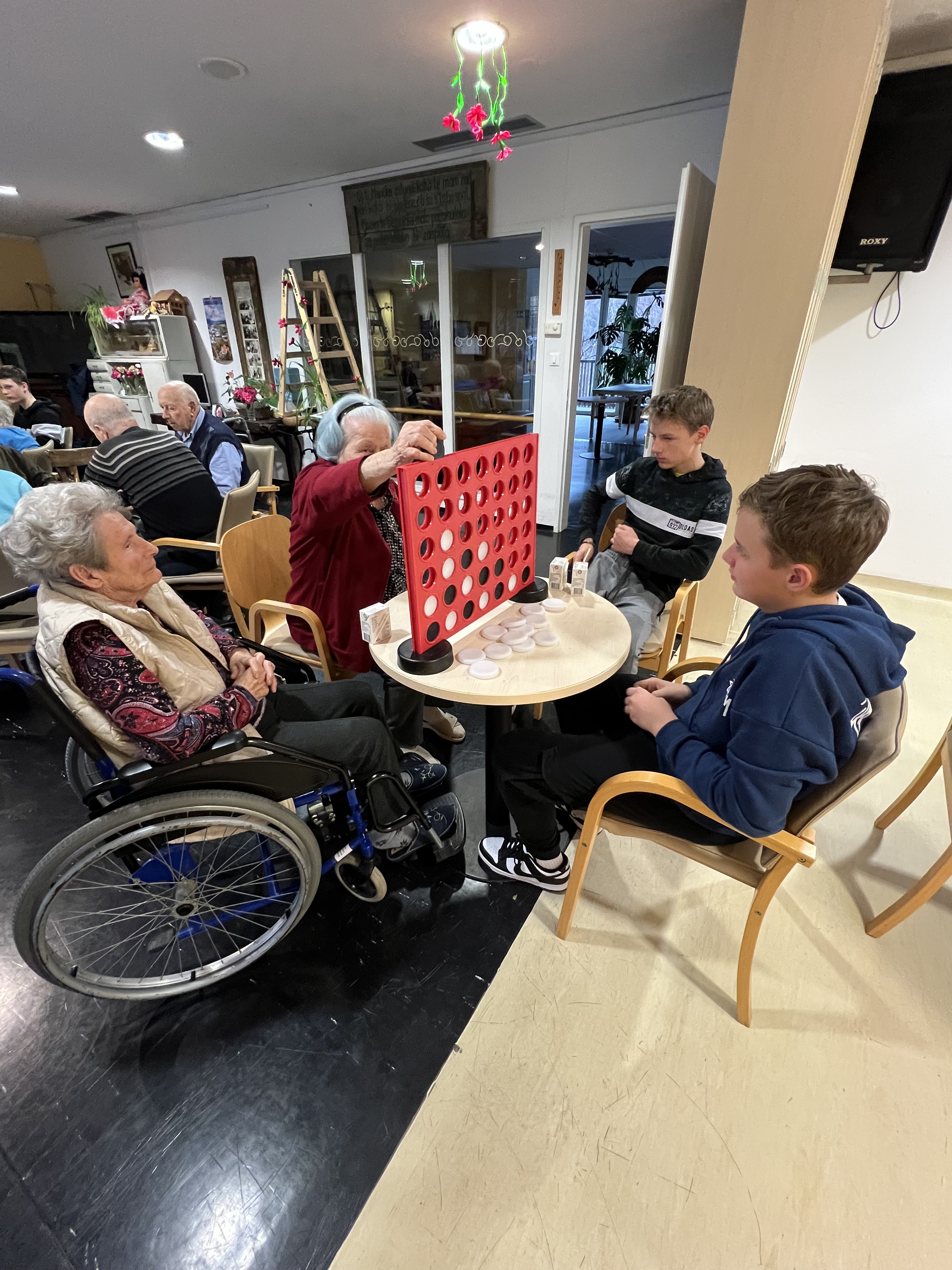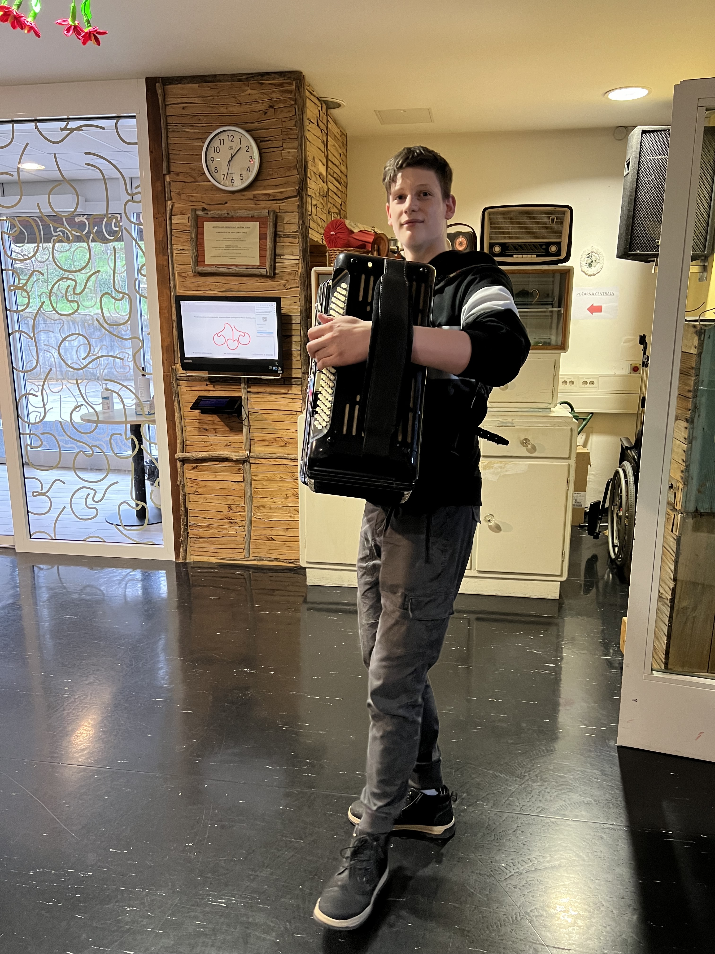 Tokratni obisk doma v Podsabotinu smo poleg igranja družabnih iger popestrili z zvoki harmonike. Poskočna glasba je odmevala po domu in spreminjala vzdušje. Učenci smo se hitro »uglasili« s starostniki in odigrali več različnih družabnih iger. Lepo je bilo obojim in čas je zelo hitro minil. Ob odhodu pa vprašanje: »Kdaj spet pridete?«
