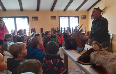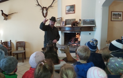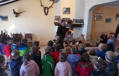 V četrtek, 6. 2. 2020, smo se otroci starejših skupin vrtca Biljana in Kojsko odpravili na zimski pohod za Mali sonček na Korado, do lovske koče. Tam nas je pričakal lovec, ki nam je predstavil, kako lovci skrbijo za gozde živali pozimi.