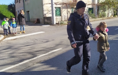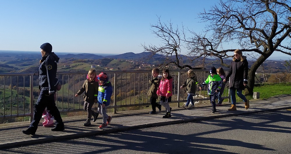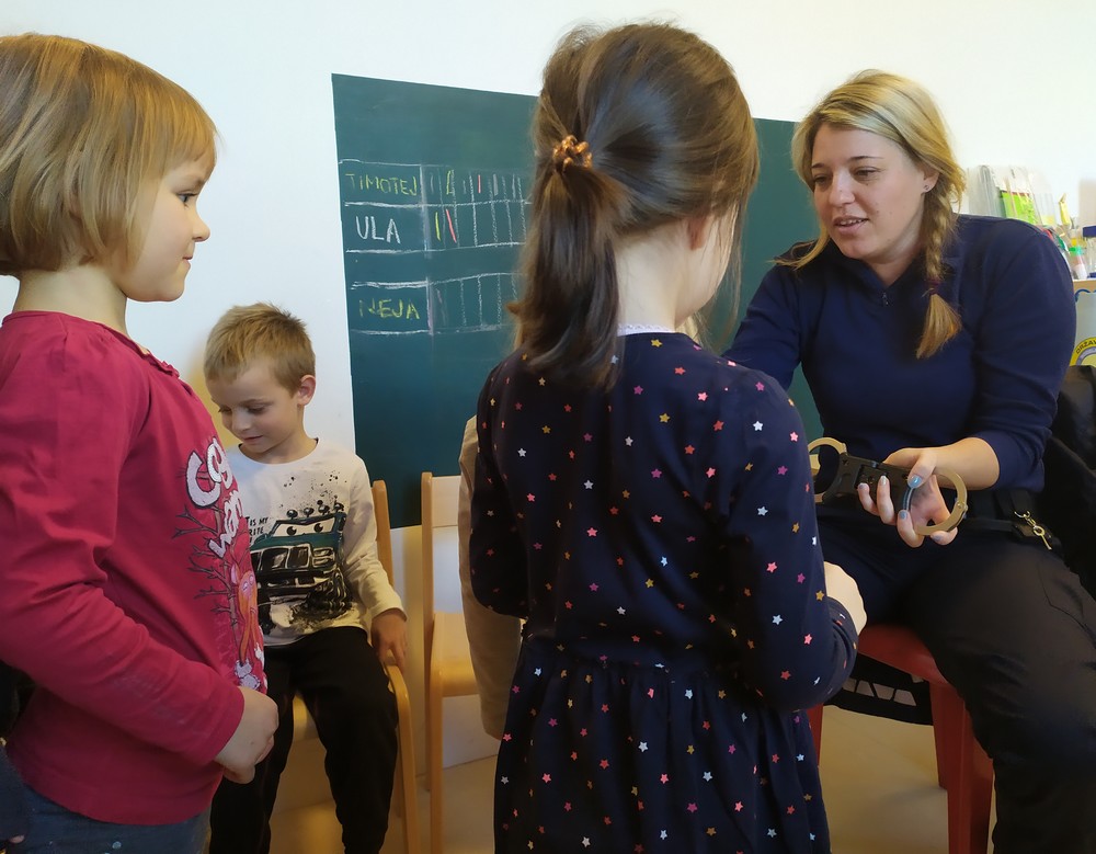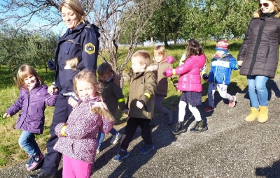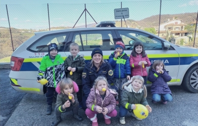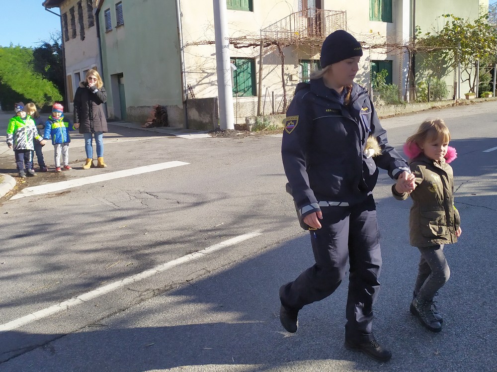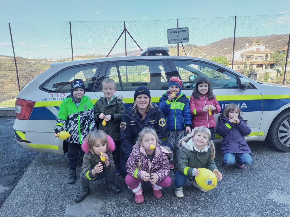 V torek, 10.12, nas je obiskala policistka. Mama naše Glorije nam je predstavila poklic policista in pokazala pripomočke, ki jih uporablja pri svojem delu. Ogledali smo si policijski avto, nato pa se skupaj učili pravilne hoje po pločniku. Ker v Kojskem nimamo prehoda za pešce, nas je pospremila čez cesto. Razdelila nam je odsevnike, da bomo v prometu bolj vidni. Prinesla nam je tudi pobarvanke s prometnimi predpisi, ki jih moramo upoštevati kot pešci.