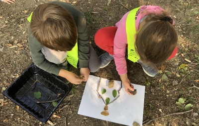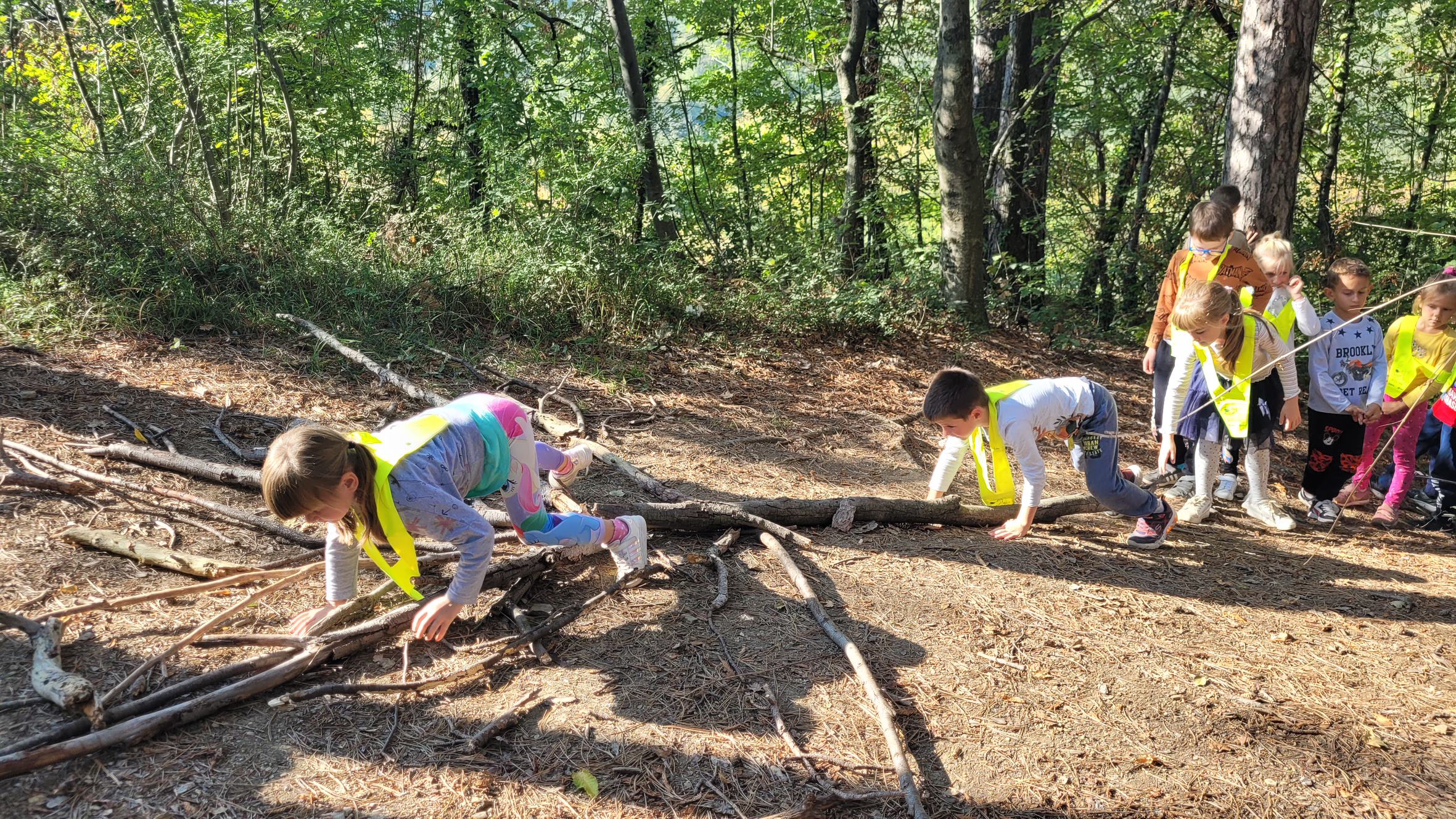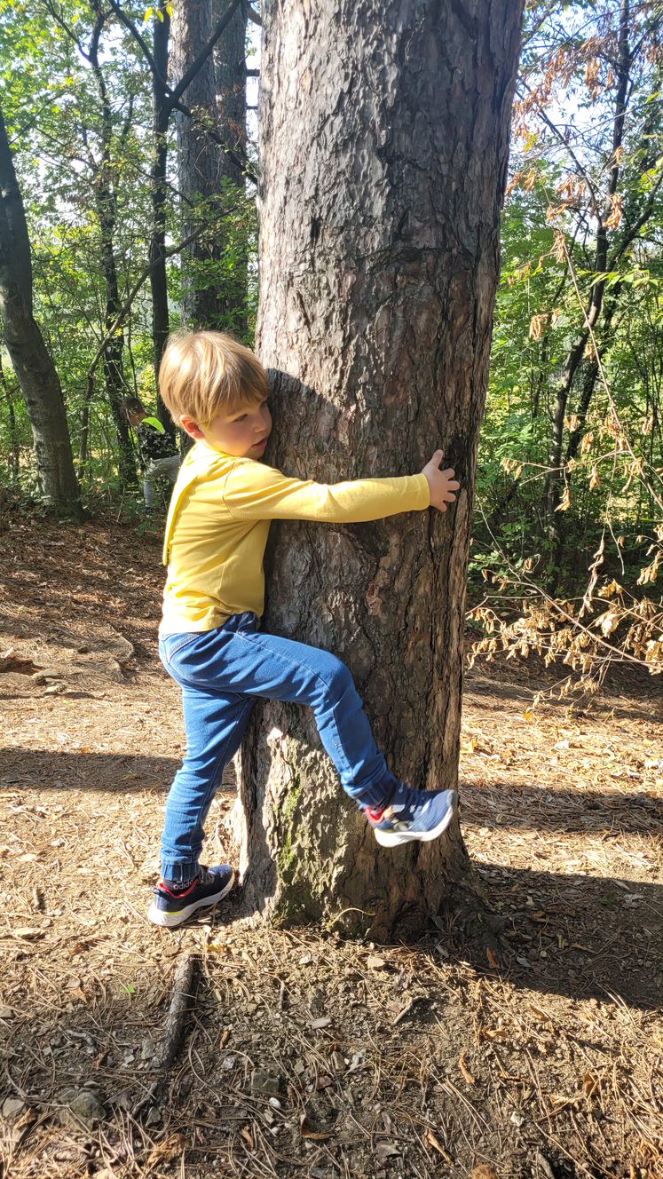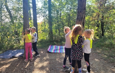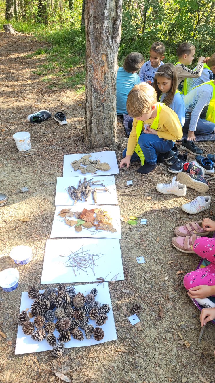 Prvošolci smo se danes odpravili v borov gozdiček, ki je naša najljubša učilnica. Najprej smo se povezali z naravo - poslušali smo zvoke okoli nas, začutili rahel vetrič in toplo jesensko sonce. Nato smo se pari spremenili v matematične detektive, iskali smo naravne materiale in se učili preštevanja do 5. Iz najdenih materialov smo izdelali slike in pripravili pravo gozdno razstavo. Nabrali smo tudi veje in palice ter iz njih oblikovali veliko drevo, po katerem smo plezali. Za konec smo si zaploskali z drevesi.