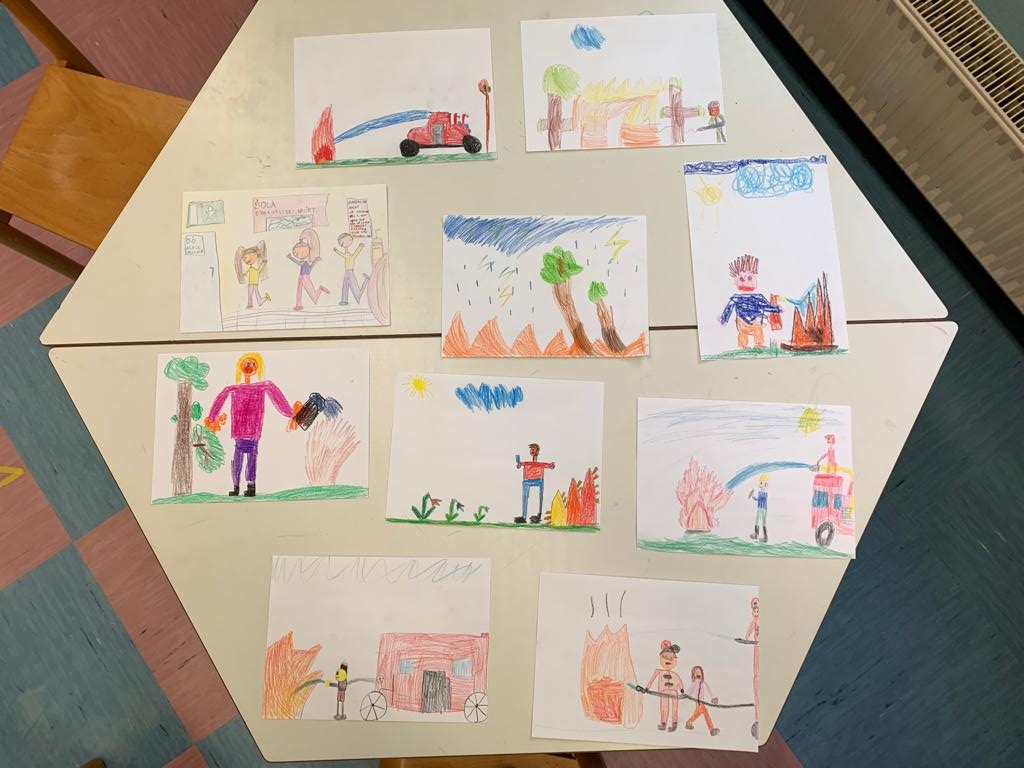 Pogovarjali smo se tudi o požarni varnosti v prostem času in na to temo risali. Nastale risbe bomo poslali na likovni natečaj.