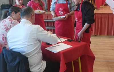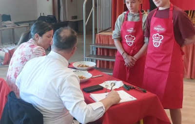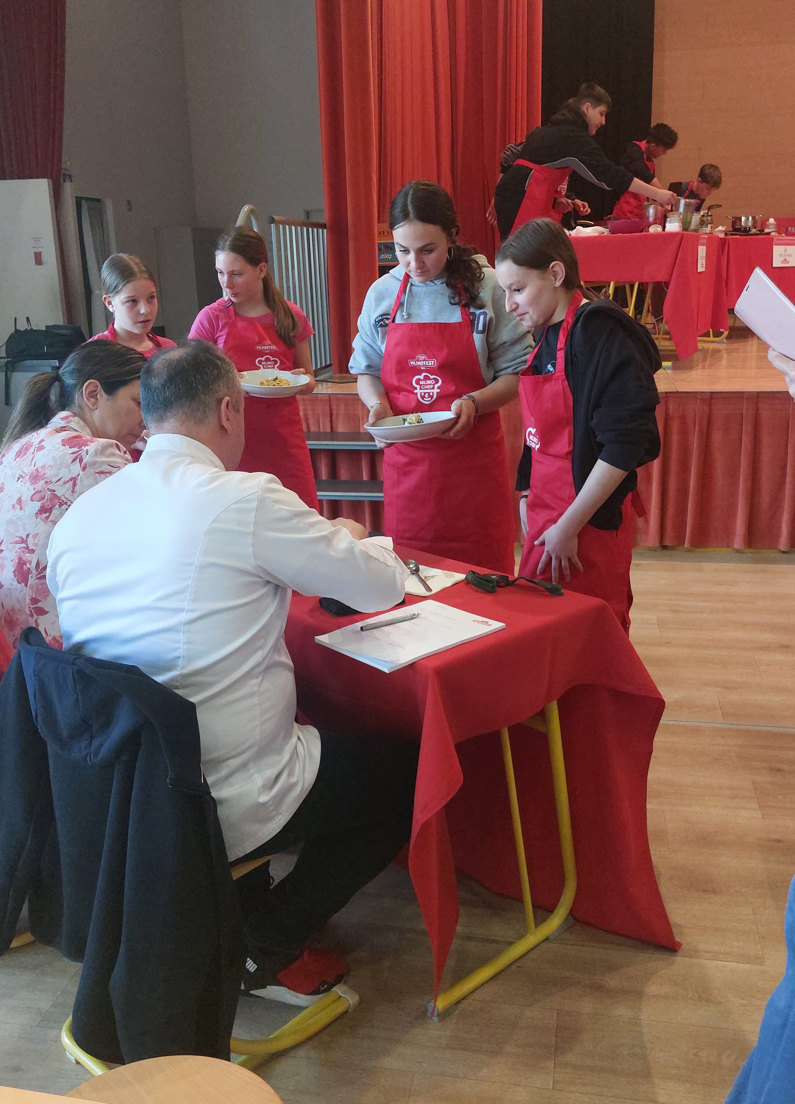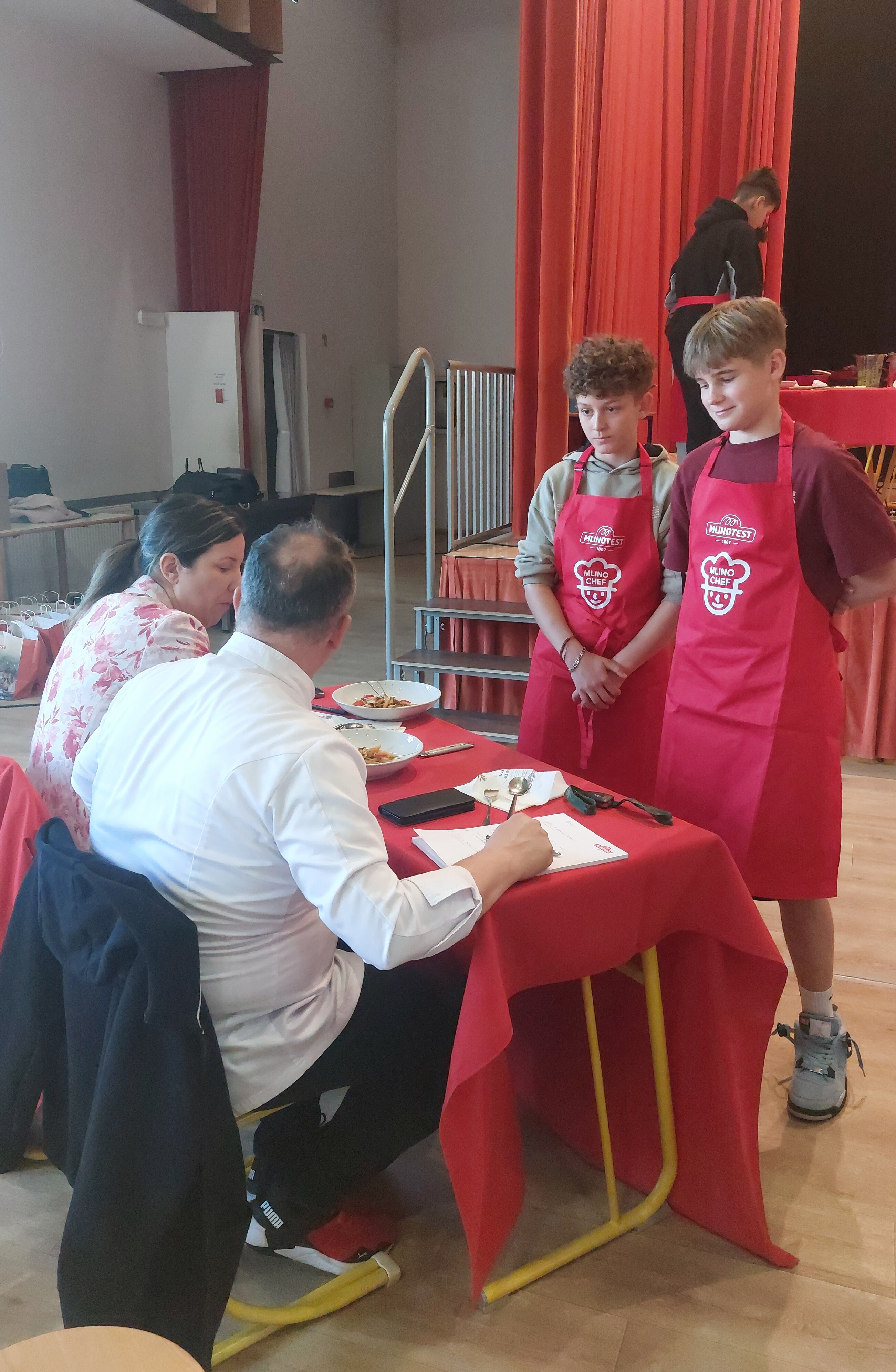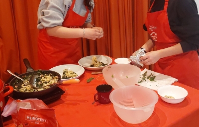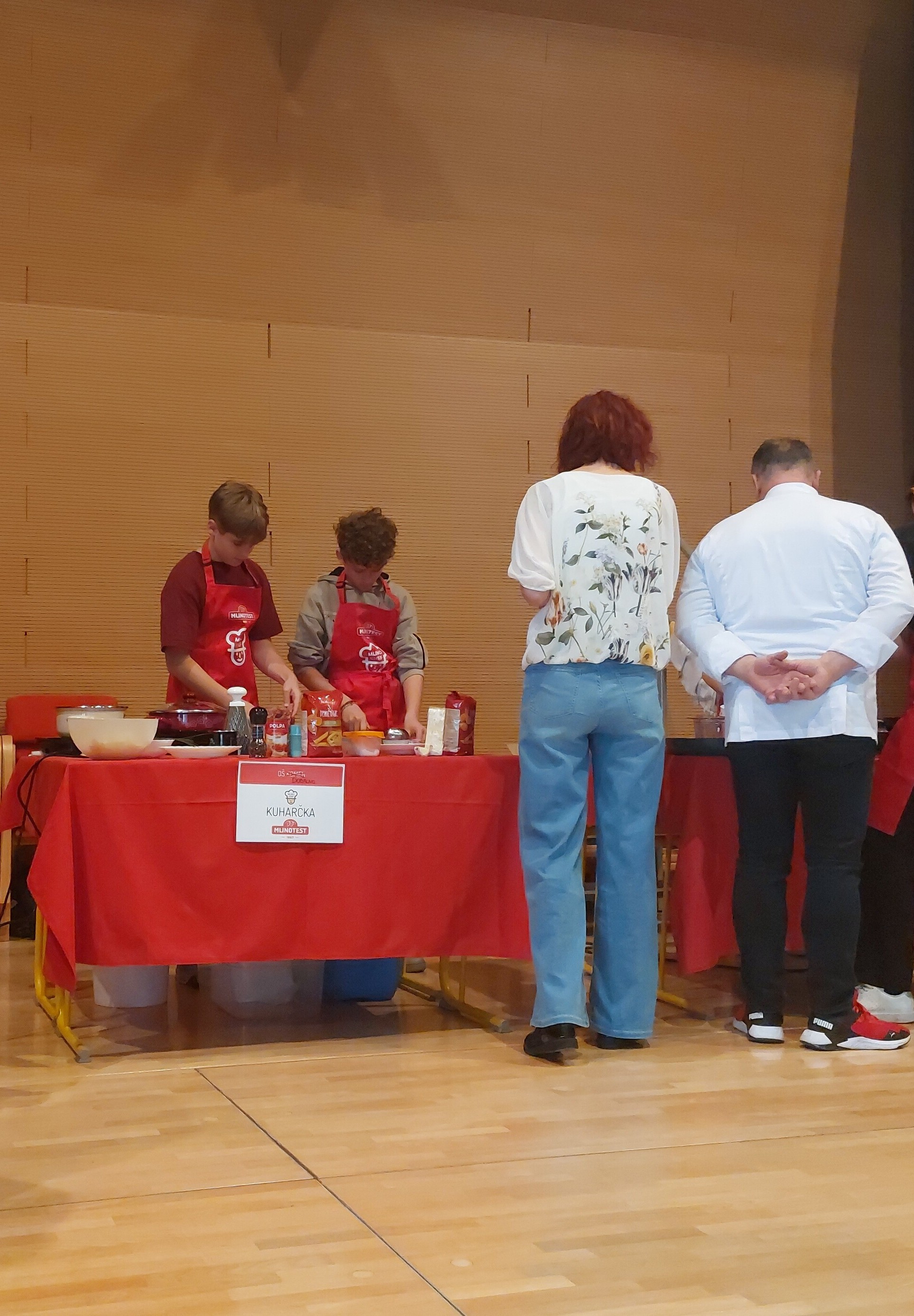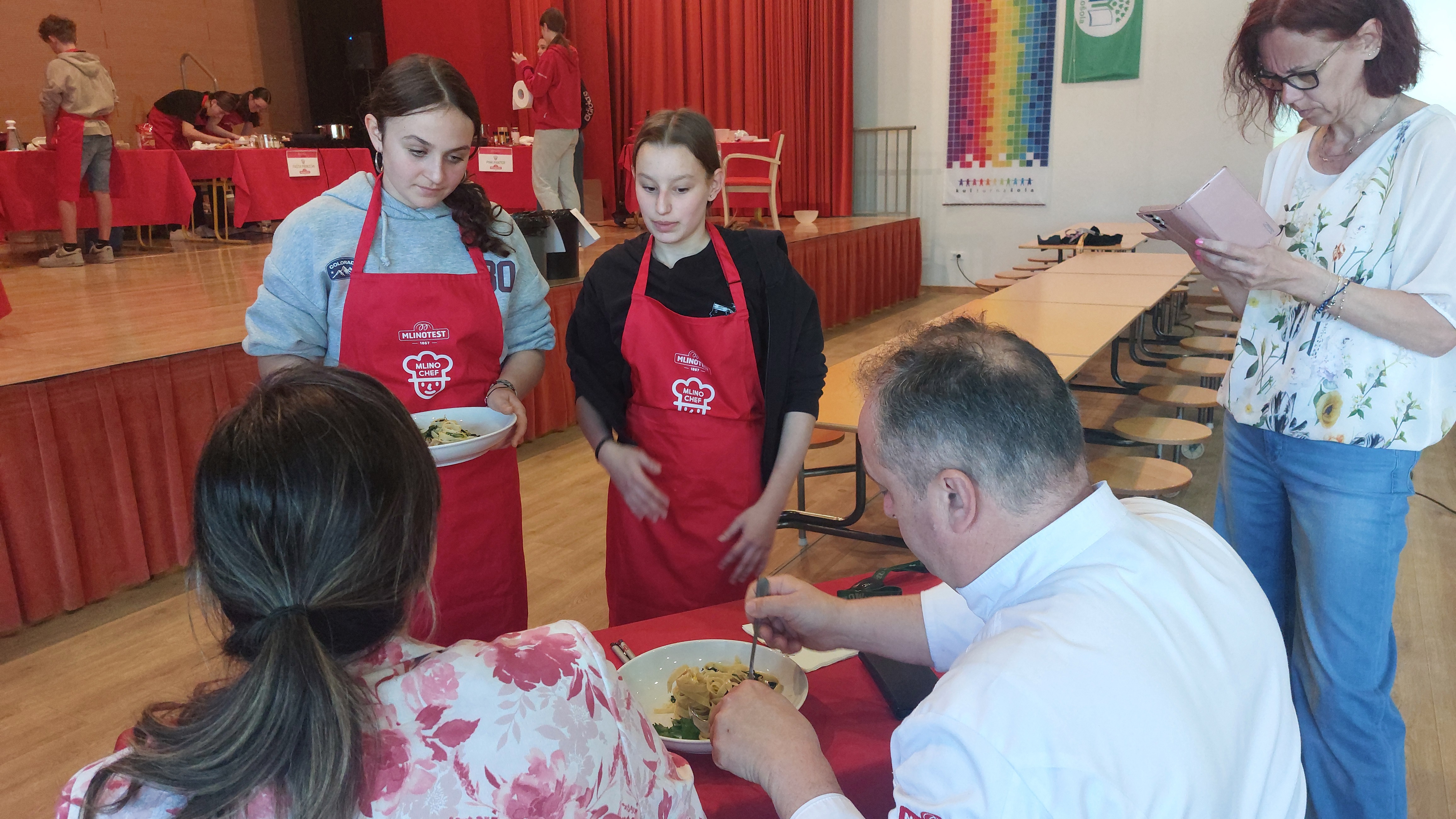 Obe ekipi sta dobre volje in se sproščeno podata v 45 minutno kuhanje. Sodelujočih ekip je 6, samo ena bo izbrana v finale za pokal Mlinochef, ki bo 23. maja v Ajdovščini. Ob koncu kuhanja vsaka ekipa pripravi dva krožnika, enega za komisijo in enega za fotografiranje. Komisija, ki je ves čas krožila med nastopajočimi, ocenjevala njihovo spretnost, znanje, urejenost, pa tudi iznajdljivost, bo sedaj pokušala in ocenila jedi. Pričakovanja so velika, napetost raste.