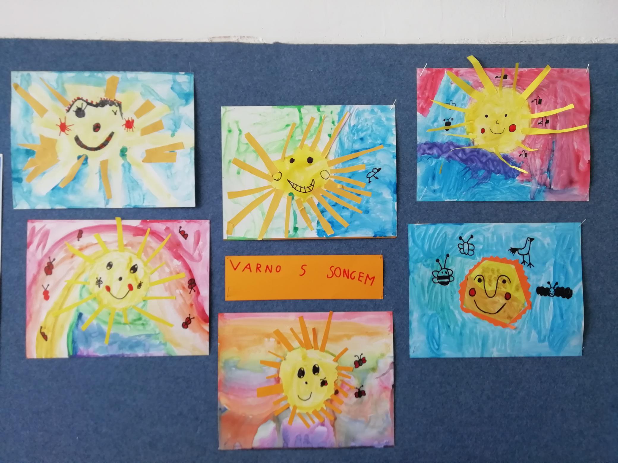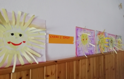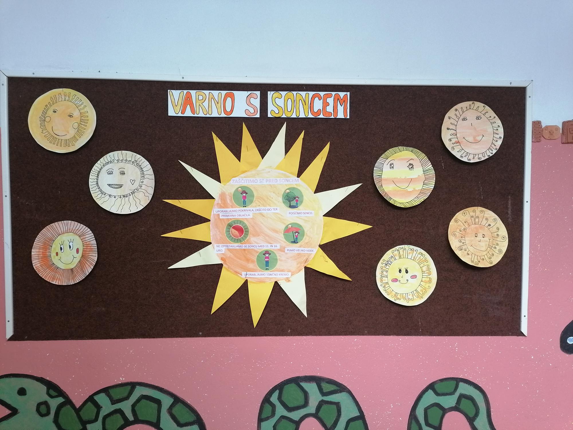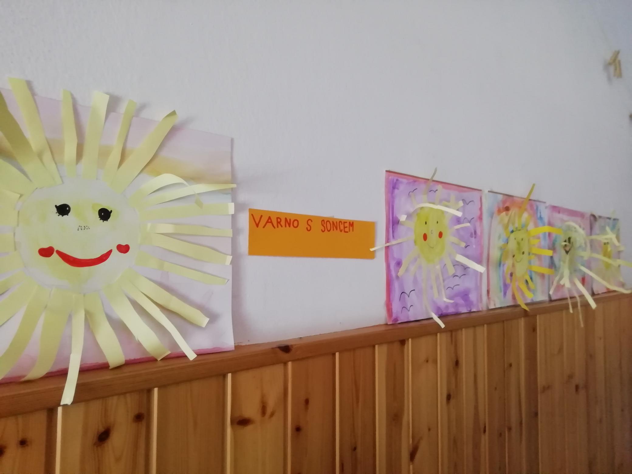 V mesecu juniju so se otroci prvih in drugih razredov podaljšanega bivanja na matični šoli ter prvega razreda na podružnični šoli že drugo leto pridružili projektu Varno s soncem. S tem preventivnim programom smo jih učitelji skušali opozarjati na pomen pravilne zaščite pred škodljivim delovanjem sončnih žarkov. Spoznali smo načine, kako se pred soncem zaščititi. V ta namen smo organizirali več različnih dejavnosti. Pogovarjali smo se ob filmčku o pravilni zaščiti pred soncem, oblikovali smo plakate, izdelovali smo kape iz papirja, likovno ustvarjali o soncu ter se tudi hladili z napitkom iz mete ter melise. Pazili smo, da se nismo preveč izpostavljali soncu, ker je ravno v času podaljšanega bivanja sonce najmočnejše.