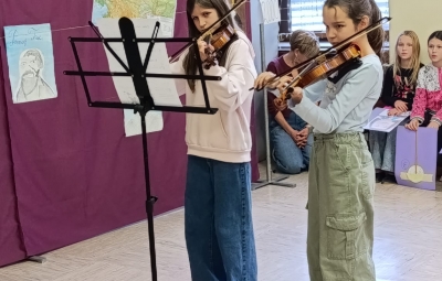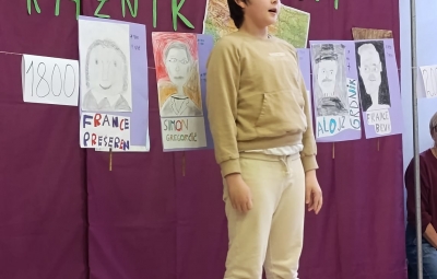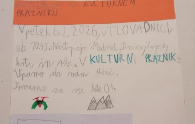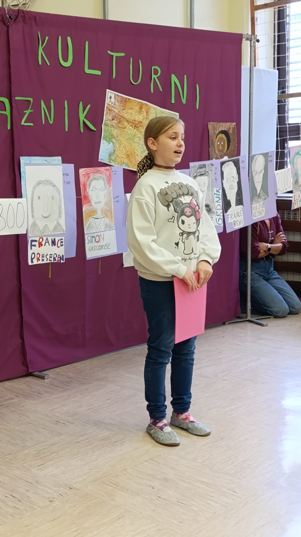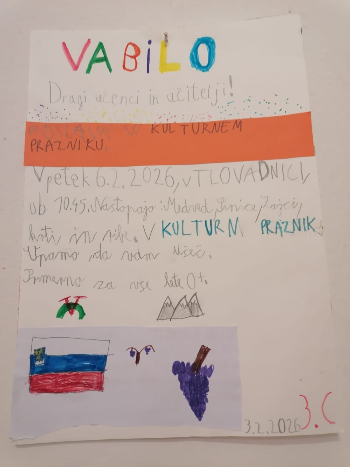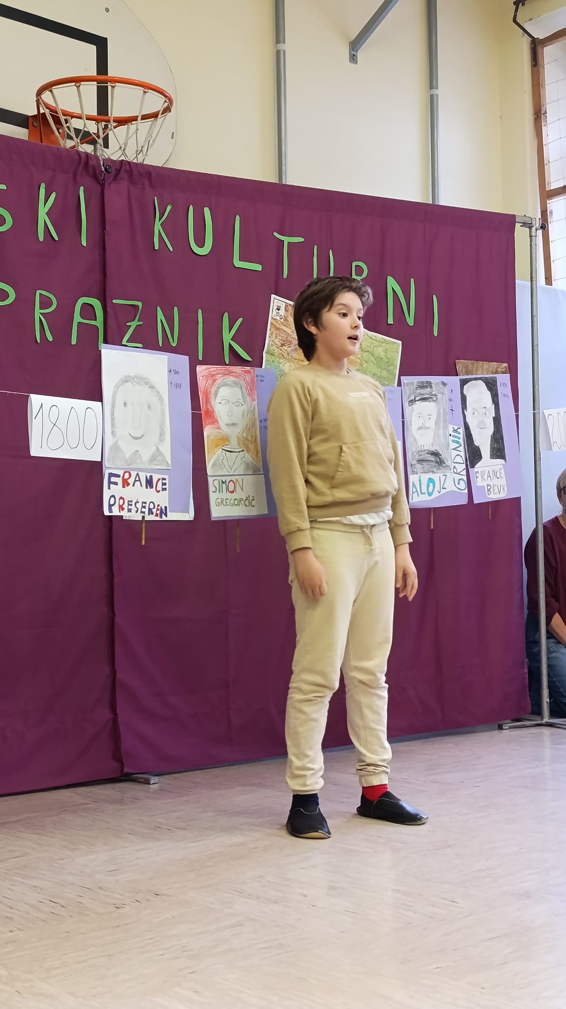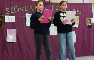 Na naši podružnični šoli smo tudi letos s proslavo obeležili Prešernov dan. Osrednja rdeča nit prireditve je bila časovna premica slovenskih ustvarjalcev – od začetkov pri Primožu Trubarju do sodobnih avtorjev, kot sta Patricija Peršolja in Anja Štefan. Učenci so prireditev obogatili z glasbenimi nastopi, deklamacijami in kratkimi dramskimi prizori, nekateri pa so se predstavili tudi z lastnimi pesmimi in zgodbami. S prireditvijo smo skupaj počastili slovensko kulturo ter ustvarjalnost, ki živi tudi med našimi učenci.
