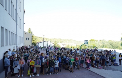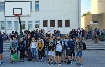 Zbrali smo se na šolskem dvorišču, kjer sta nas po kratkem kulturnem programu nagovorila ravnatelj Uroš Kobal in župan Franc Mužič.Šolska vrata so se odprla in upamo, da odprta tudi ostanejo. Zatorej pogumno in pozitivno stopimo novim dogodivščinam naproti.