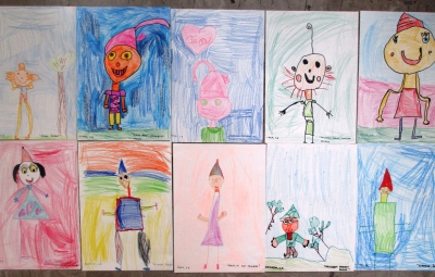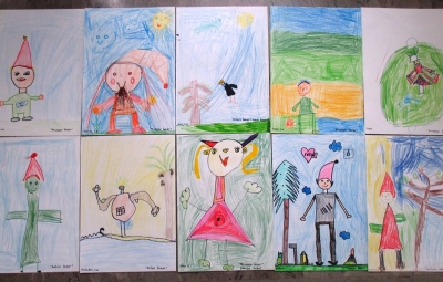 Vsak izmed prvošolcev je narisal svojega škrata: škrat Ana pomaga pri učenju, prijazen škrat, gozdni škrat, delavski škrat, kuharski škrat, škratek, ki se z mano igra, ko doma nimam prijateljev, božični škrat, močan škrat, nagajiv škrat, škrat, ki vse prinese …