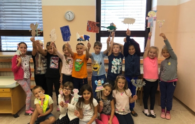 Prvošolci POŠ Kojsko so se tudi razveselili darilne slikanice Škrat Kuzma dobi nagrado pisateljice Svetlane Makarovič. Na pomoč so jim priskočili še drugošolci in iz papirja izdelali knjižne junake, ki nastopajo v pravljici. Komaj čakamo, da nam bodo pravljico zaigrali.